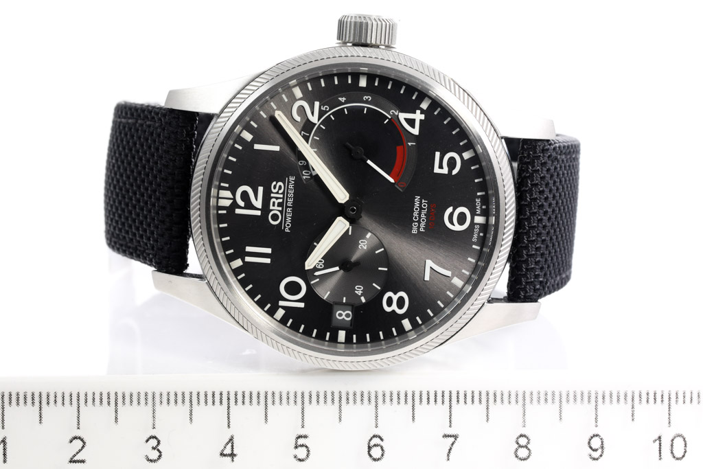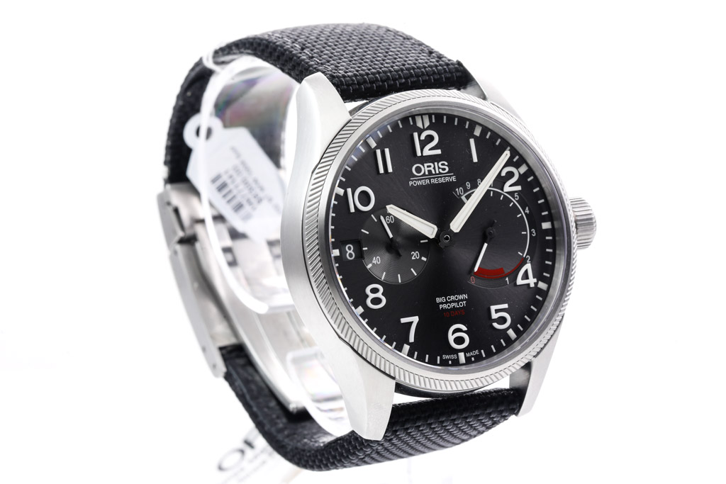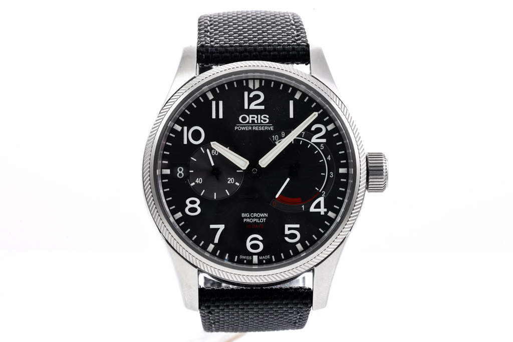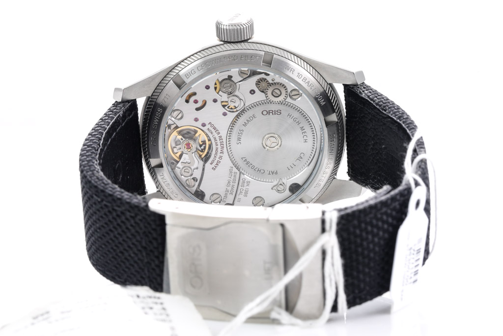 Oris Big Crown ProPilot stainless steel manual winding mens watch. Black dial, case diameter: 44mm, wrist size: 19cm, Swiss made. Ref# 111 7711 4163 TS. With Oris black fabric strap and clasp. With Oris Warranty Card - the card is not stamped so the Oris warranty does not apply. 3 month FSA warranty. NO box provided. (As New, Note: minor scratches on case and light wear on strap due to being display stock )