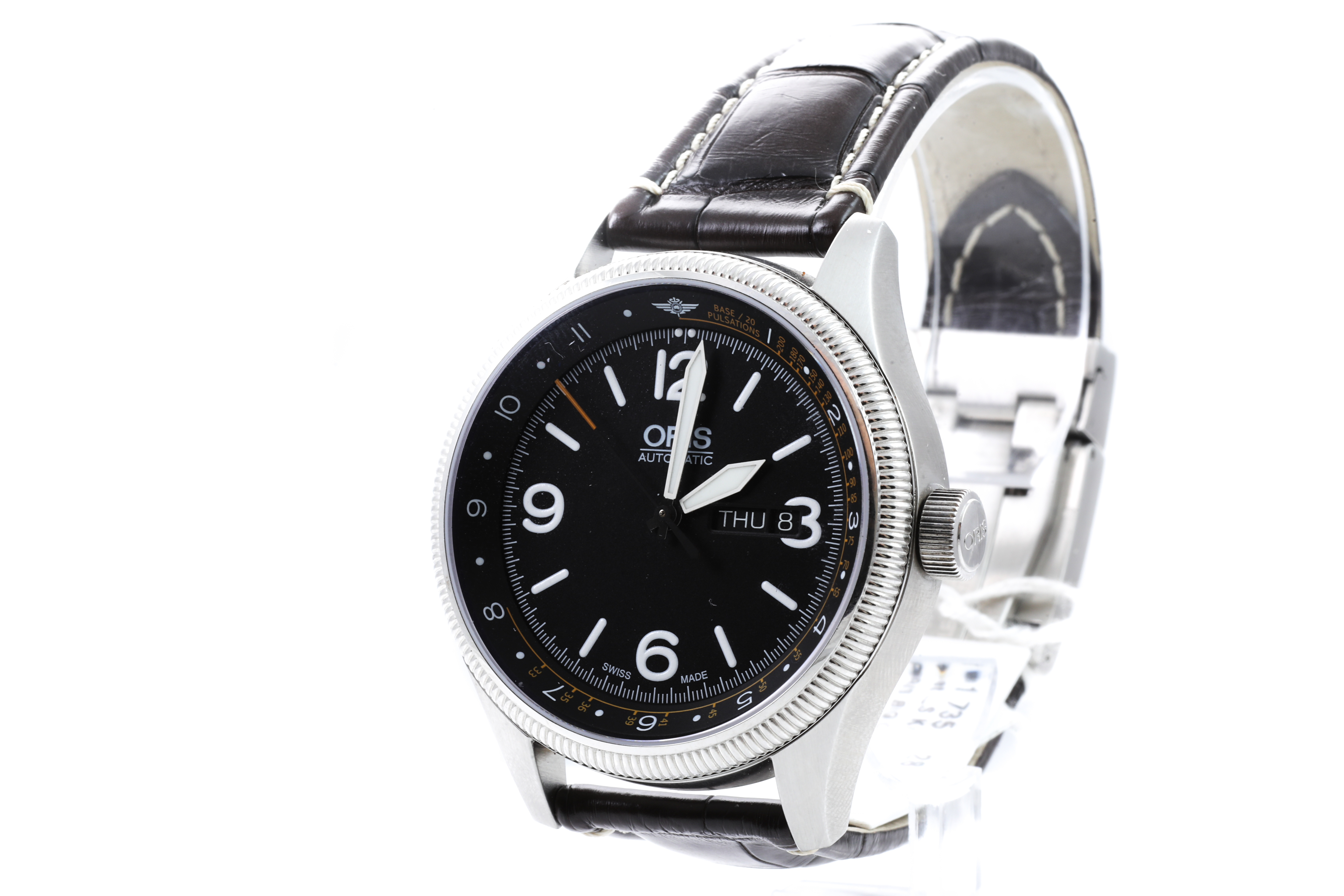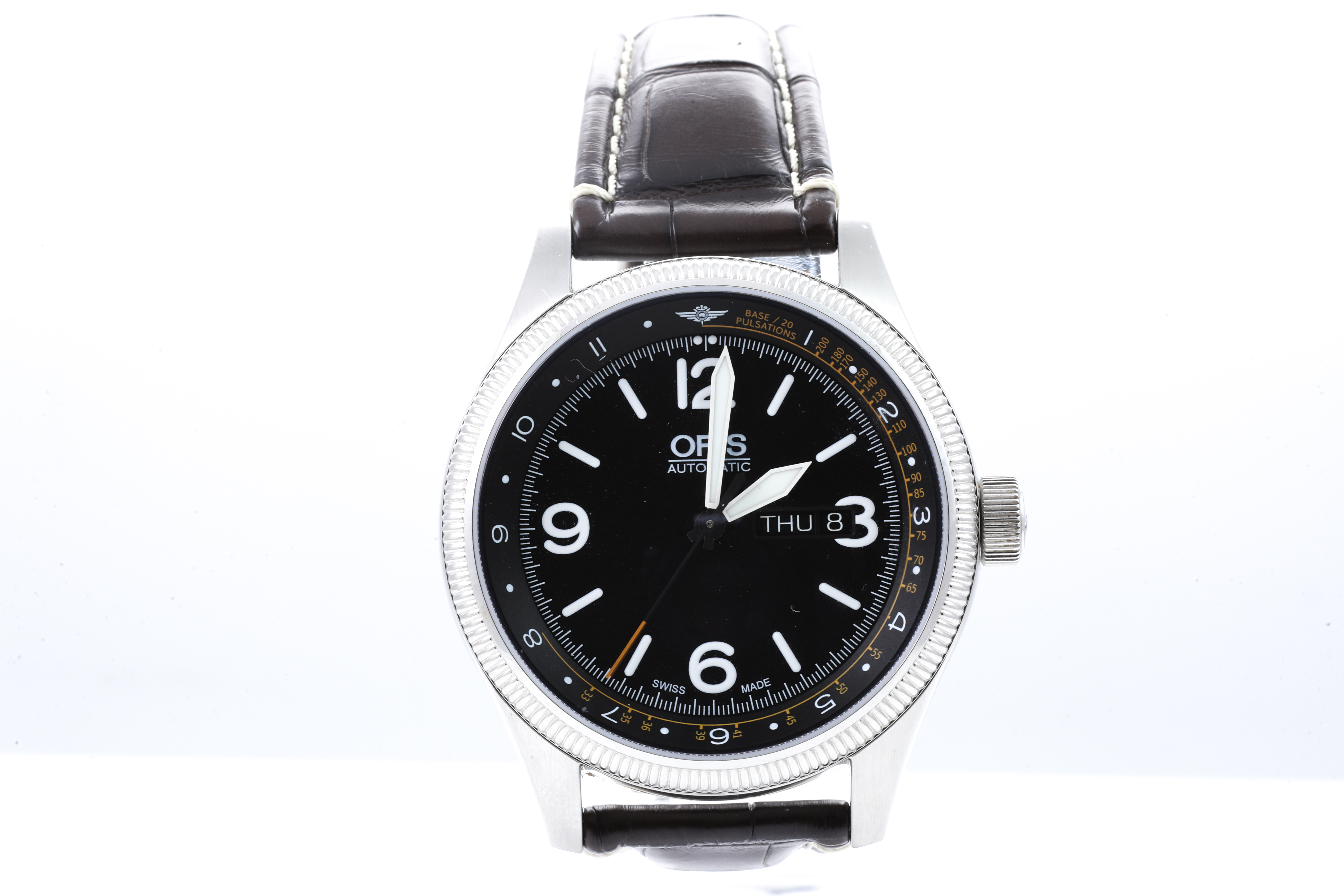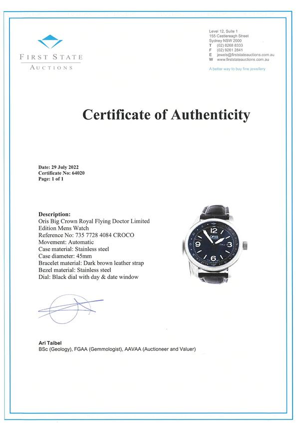 1843: Oris Big Crown Royal Flying Doctor Limited Edition II of 2000 stainless steel automatic mens watch. Black dial, day & date, case diameter: 45mm, wrist size: 20cm, Swiss made. Ref# 735 7728 4084 CROCO. With Oris dark brown leather strap and clasp. With Certificate of Authenticity. No box provided. 3 month FSA warranty. (As New, minor scratches on case and light wear on strap due to being display stock)