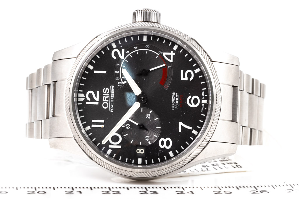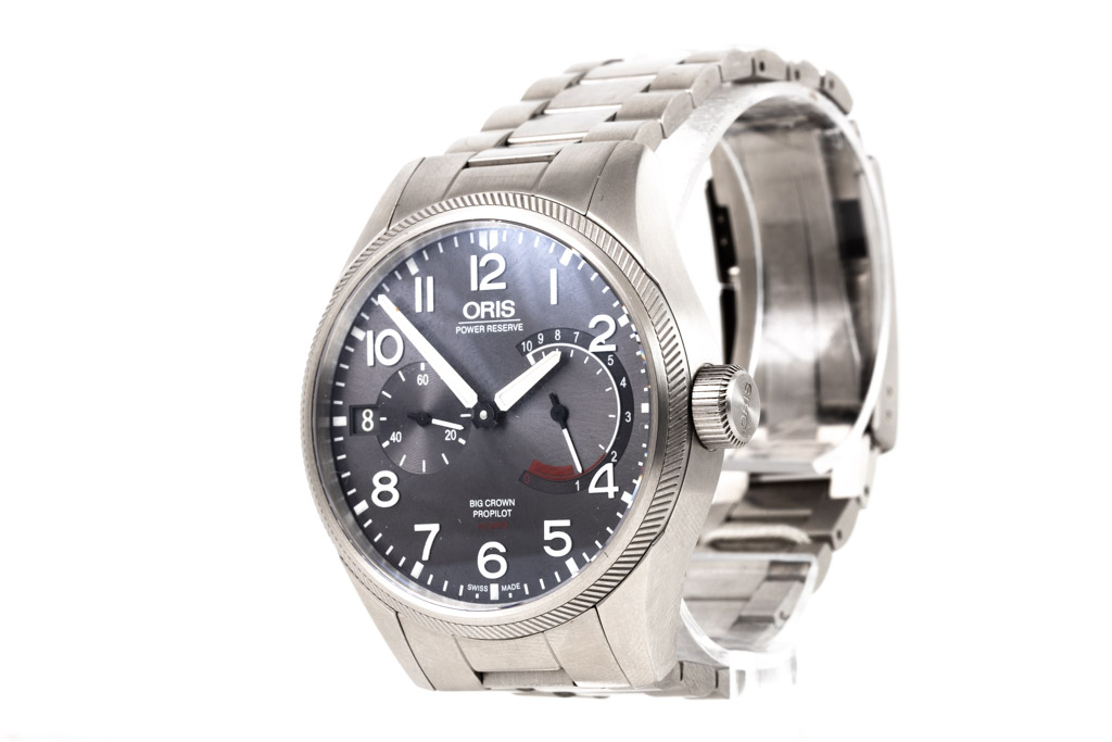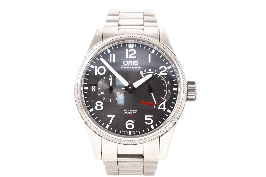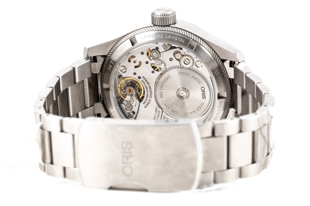 Oris Brig Brown stainless steel automatic mens watch. Grey dial, date, case diameter: 44mm, wrist size: 19.5cm, Swiss made. Ref# 111 7711 4163MB. With Oris stainless steel bracelet and clasp. With Oris Guarantee card - the card is not stamped so the Oris warranty will not apply. No box provided. 3 month FSA warranty. (As New, Note: minor scratches on crystal, case and bracelet due to being display stock)