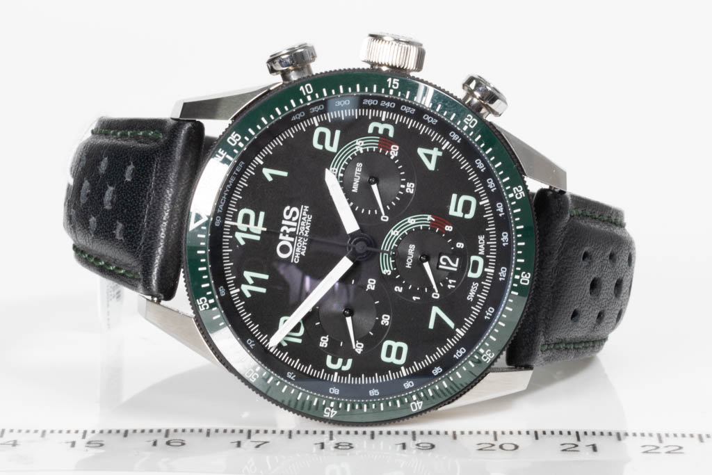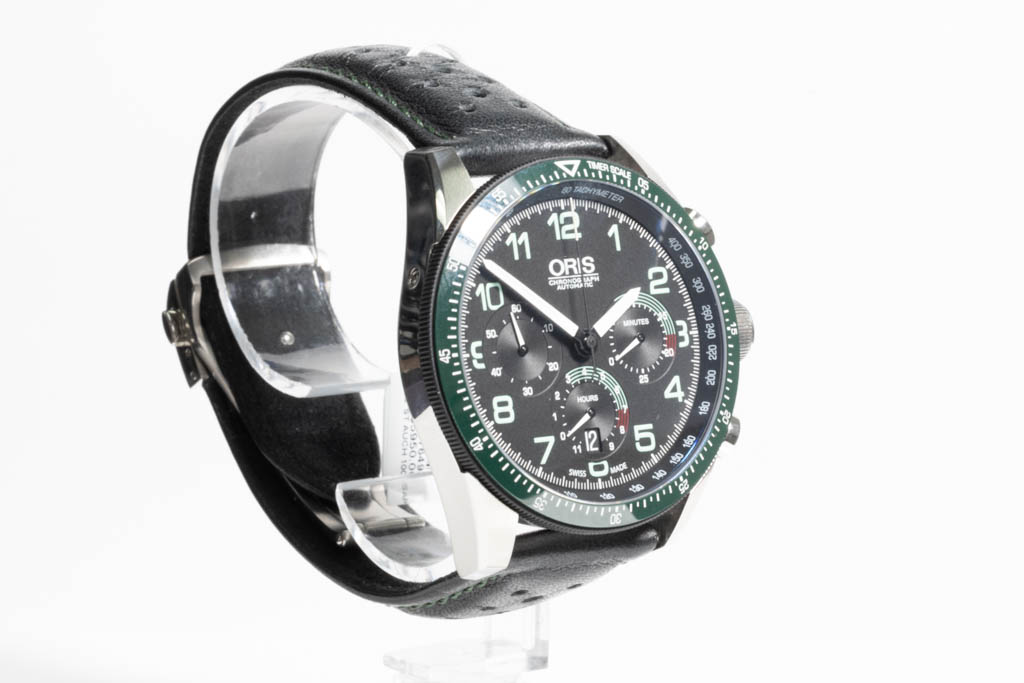 Oris Calobra Limited Edition II of 250 stainless steel automatic mens watch. Black chronograph dial, date, case diameter: 44mm, adjustable maximum wrist size: 19cm, Swiss made. Ref# 676 7661 4494 LS. With Oris black leather strap and clasp. With FSA Certificate of Authenticity. No box provided. 3 month FSA warranty. (As New, Note: light wear on strap and minor scratches on case due to being display stock)