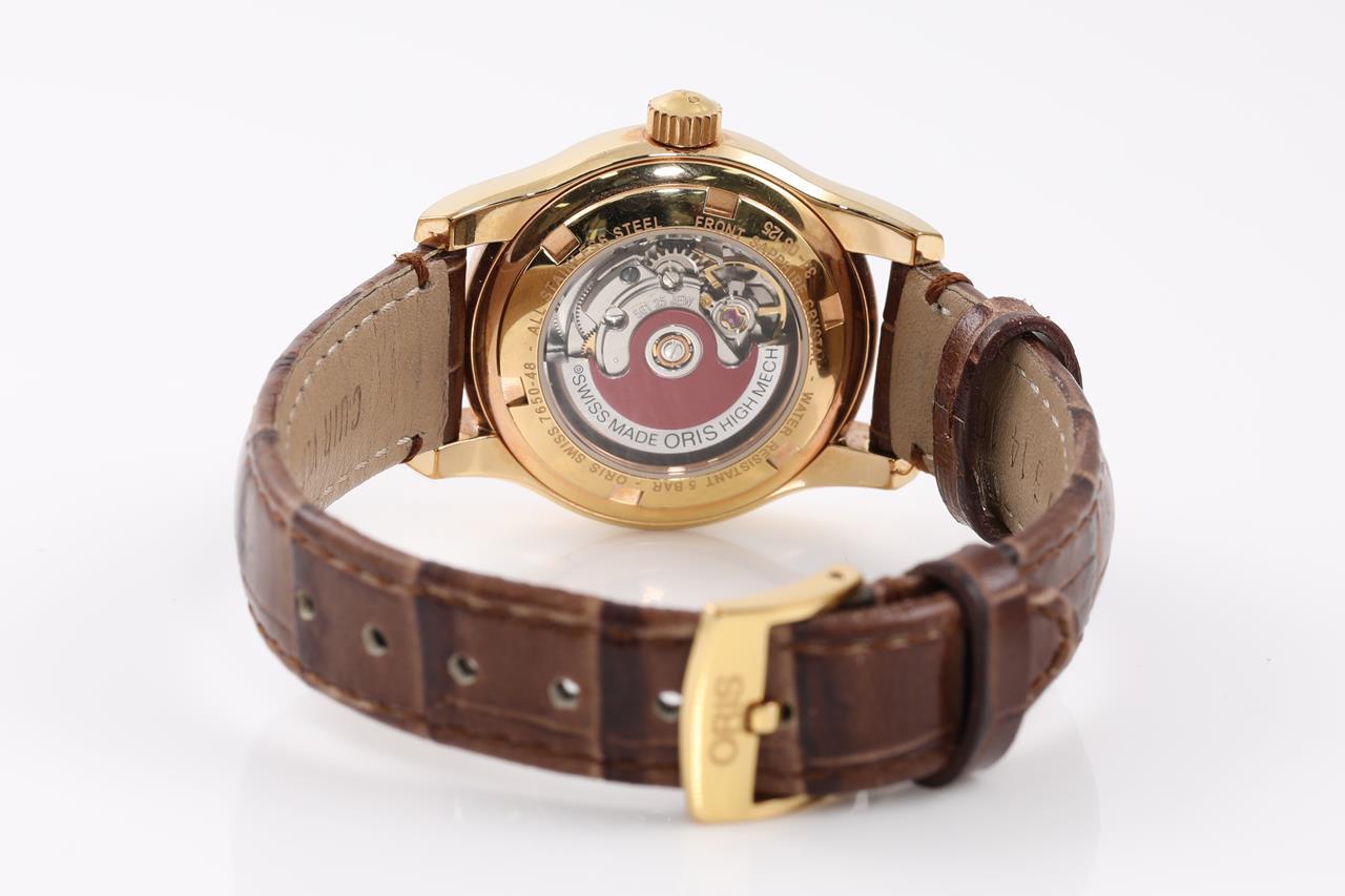 Oris Classic Date rose gold PVD and stainless steel automatic ladies watch. Silver dial, date, case diameter: 28.5mm, wrist size: 17.5cm, Swiss made. Ref# 561 7650 4831LS. With Oris brown leather strap and clasp. Note: light wear on strap due to being display stock. With Certificate of Authenticity. 3 month FSA warranty. (As New)