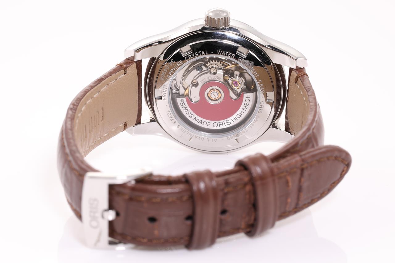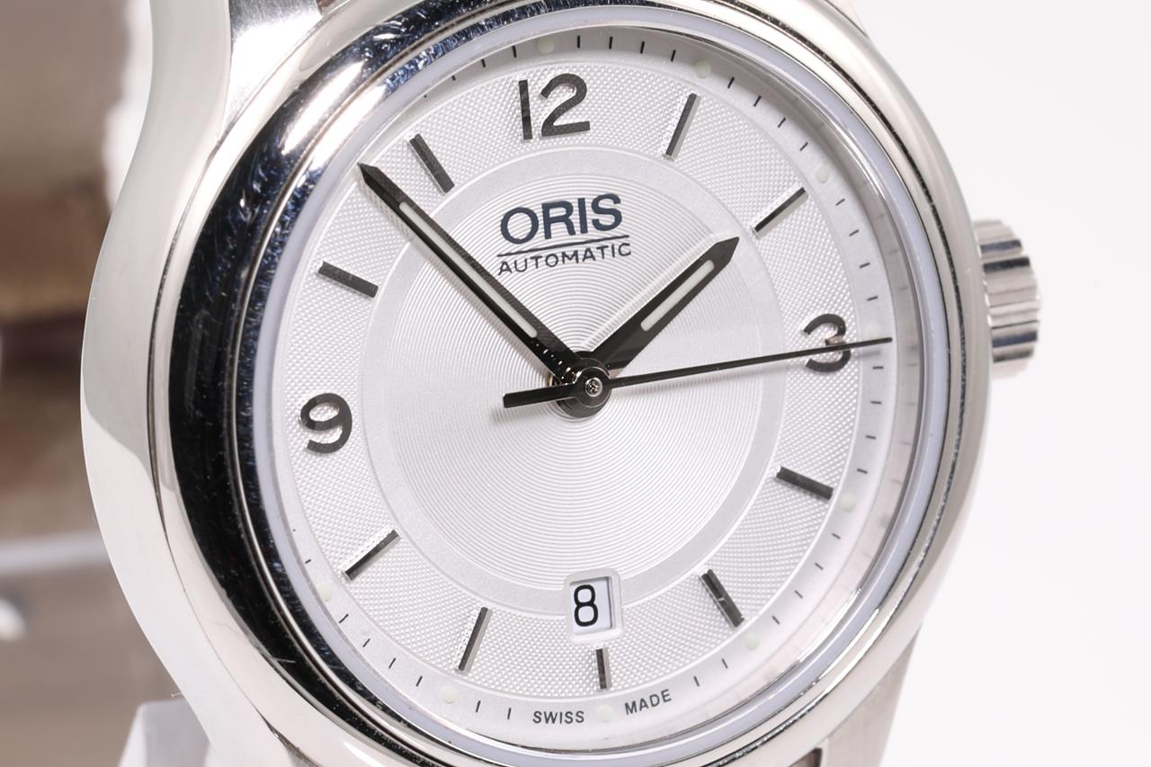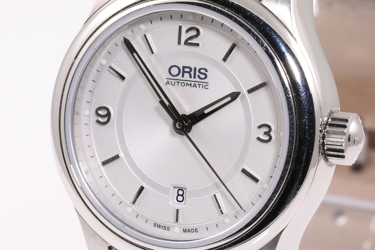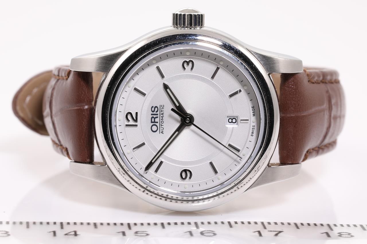 Oris Classic Date stainless steel automatic ladies watch. Silver dial, date, case diameter: 28.5mm, wrist size: length: 18cm, Swiss made. Ref# 561 7650 4031LS. With Oris brown leather strap and clasp. Note: scratches on case and wear on strap due to being display stock. No box provided. 3 month FSA warranty. (As New)