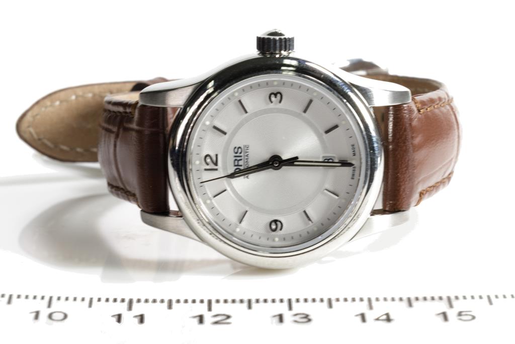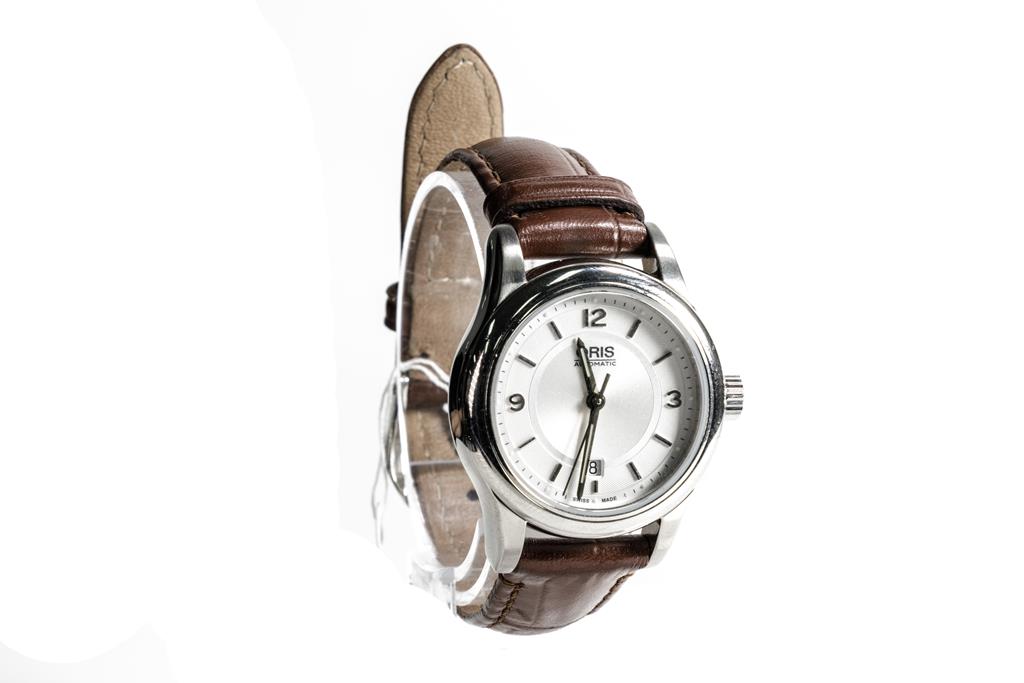 Oris Classic Date stainless steel automatic ladies watch. Silver dial, date, case diameter: 28.5mm, strap length: 18cm, Swiss made. Ref# 561 7650 4031LS. With Oris brown leather strap and clasp. Note: scratches on case and wear on strap due to being display stock. No box provided. 3 month FSA warranty. (As New)