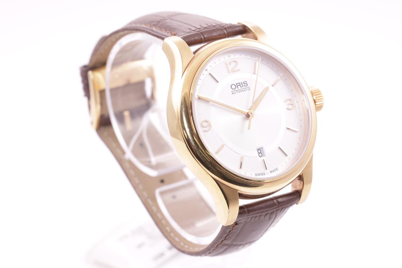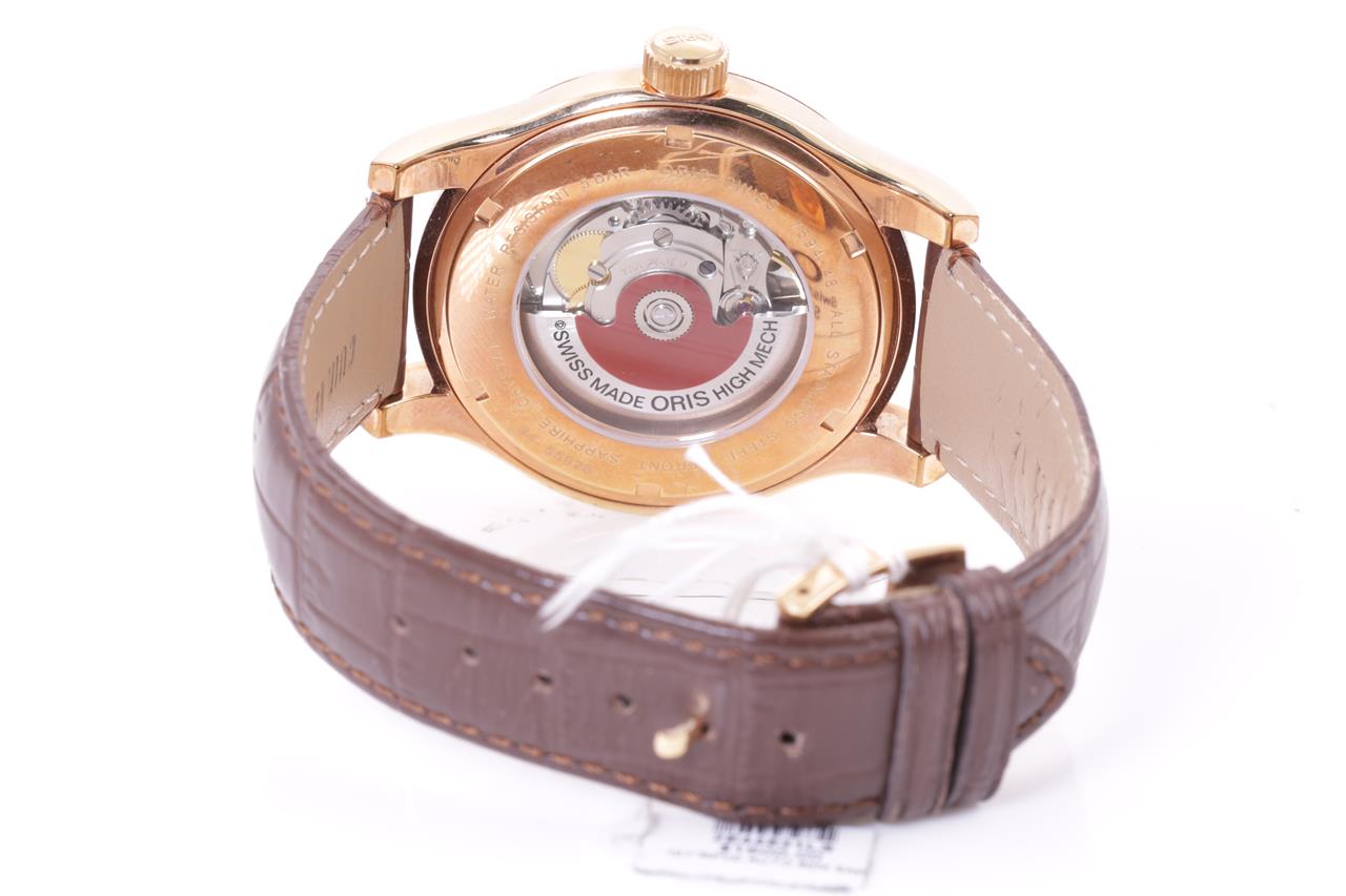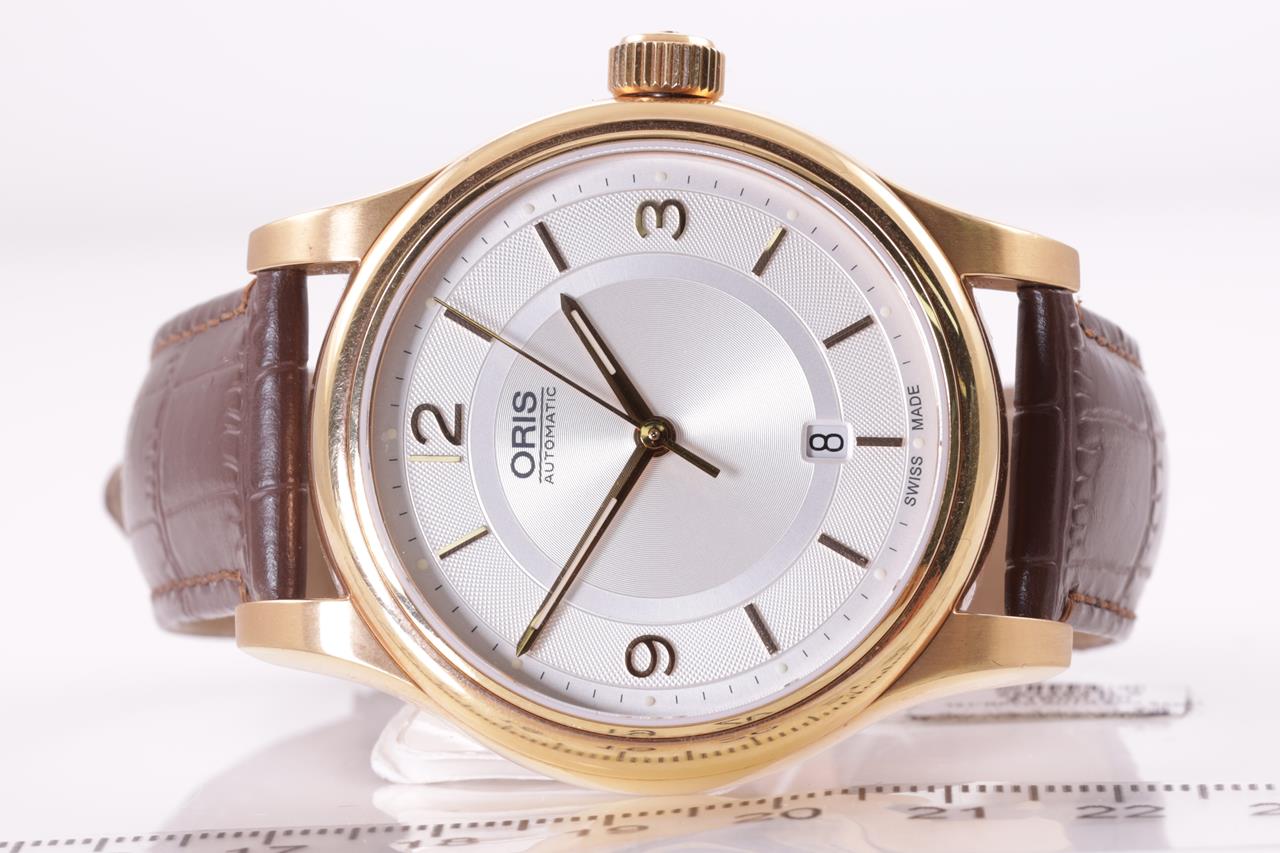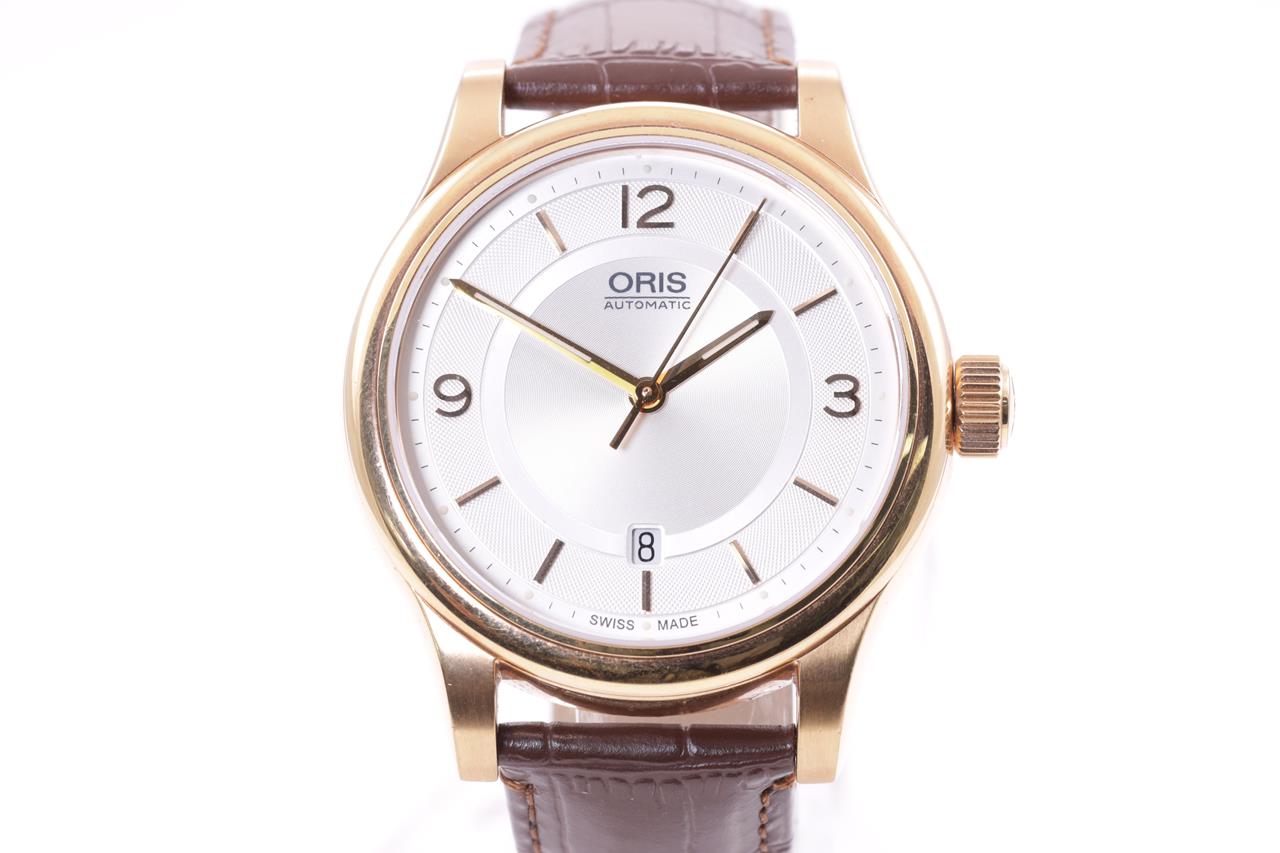 Oris Classic Date rose gold plated stainless steel automatic mens watch. Silver dial, date, case diameter: 42mm, lenth: 21cm, Swiss made. Ref#733 7594 4831LS. With Oris braon leather strap and clasp. Note: light wear on strap due to being display stock. 3 month FSA warranty. (As New)