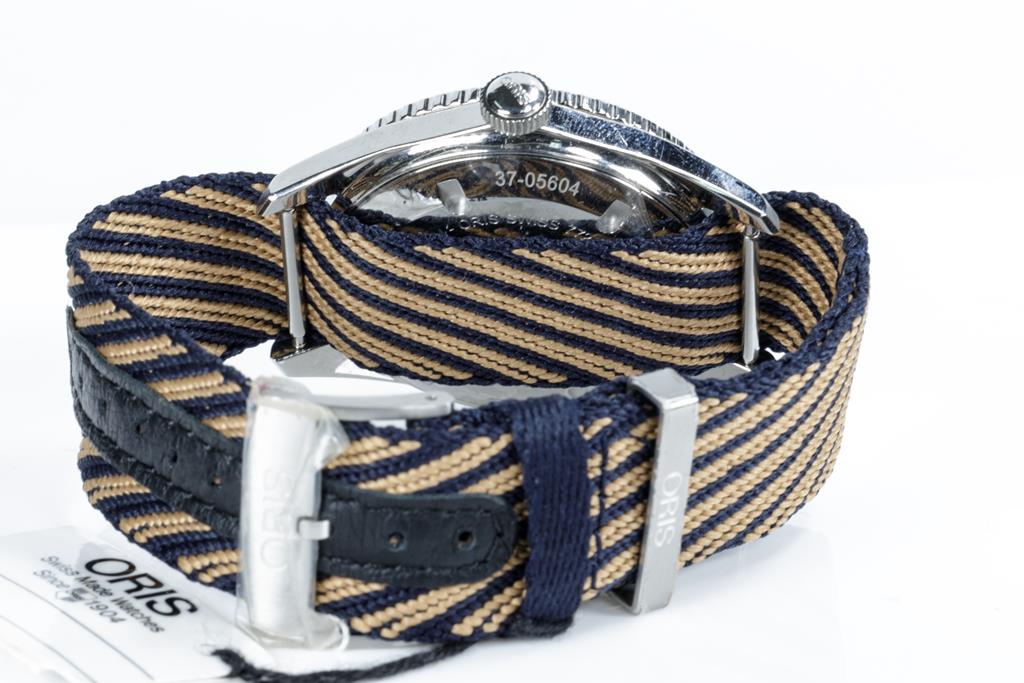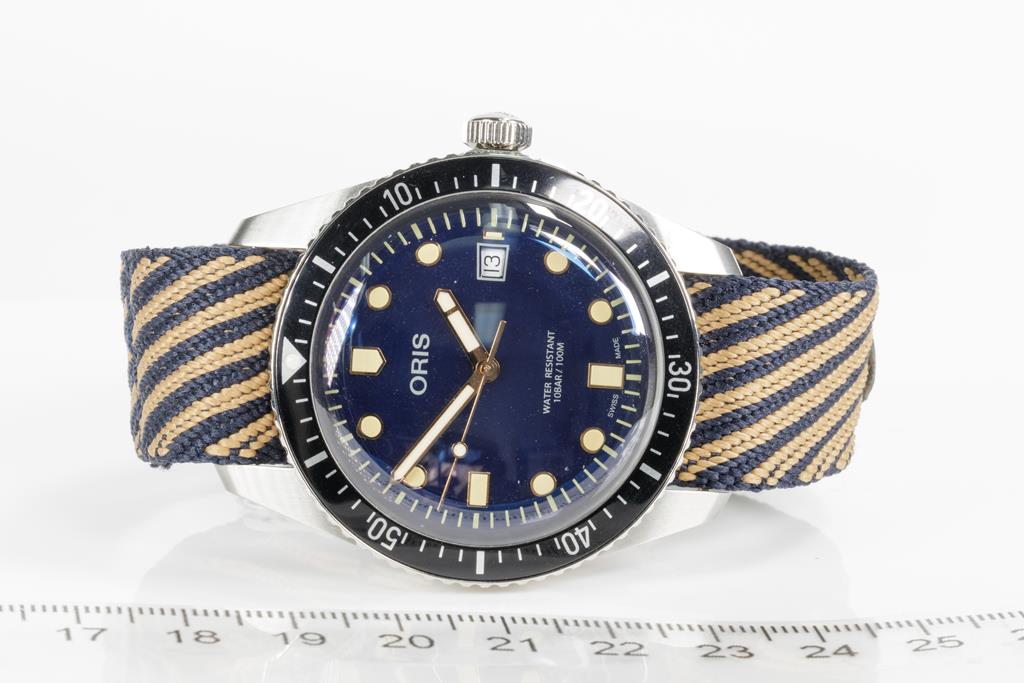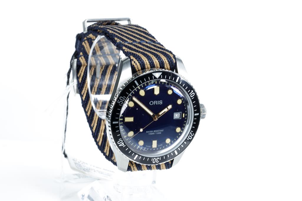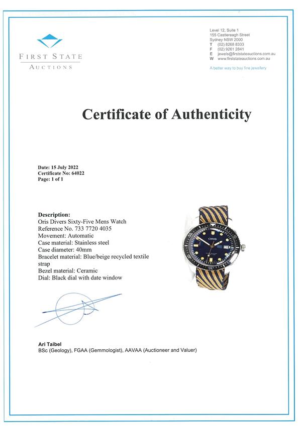 Oris Divers Sixty Five stainless steel automatic mens watch. Blue dial, date, case diameter: 40mm, strap length: 21cm, Swiss made. Ref# 733 7720 4035. With Oris blue/beige recycled textile strap and buckle. With Certificate of Authenticity. No box provided. 3 month FSA warranty. (As New, Note: light wear on strap and scratches on case due to being display stock)