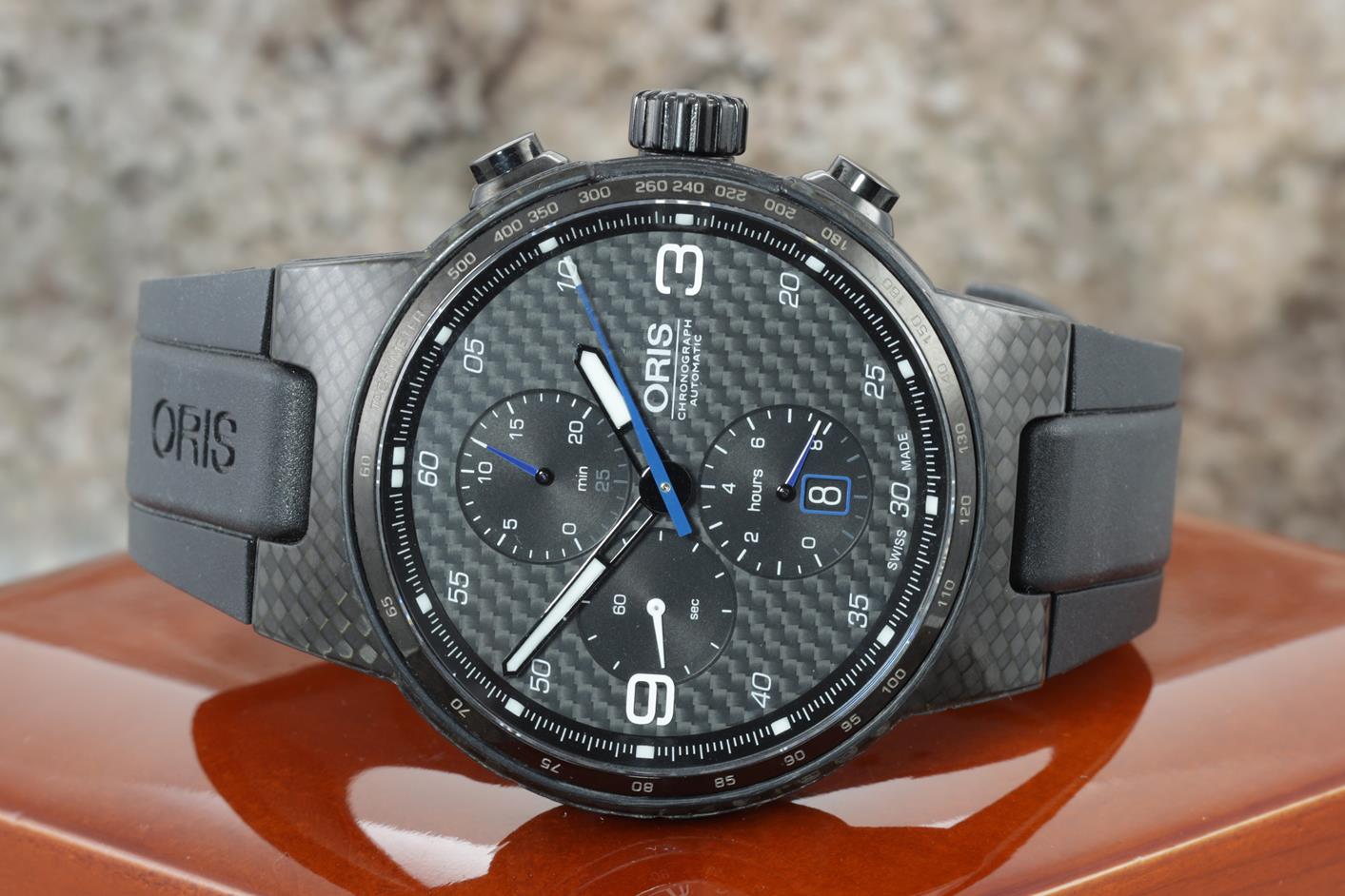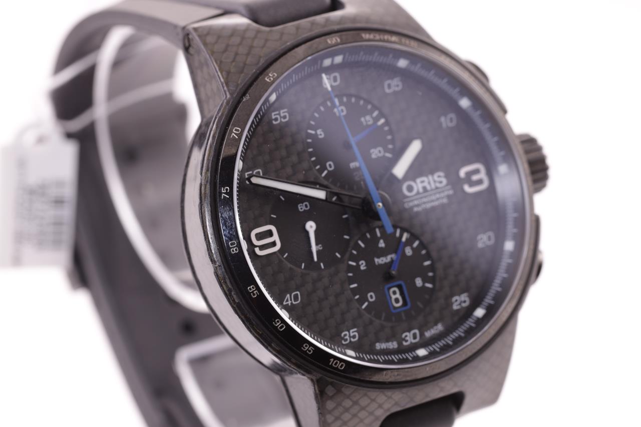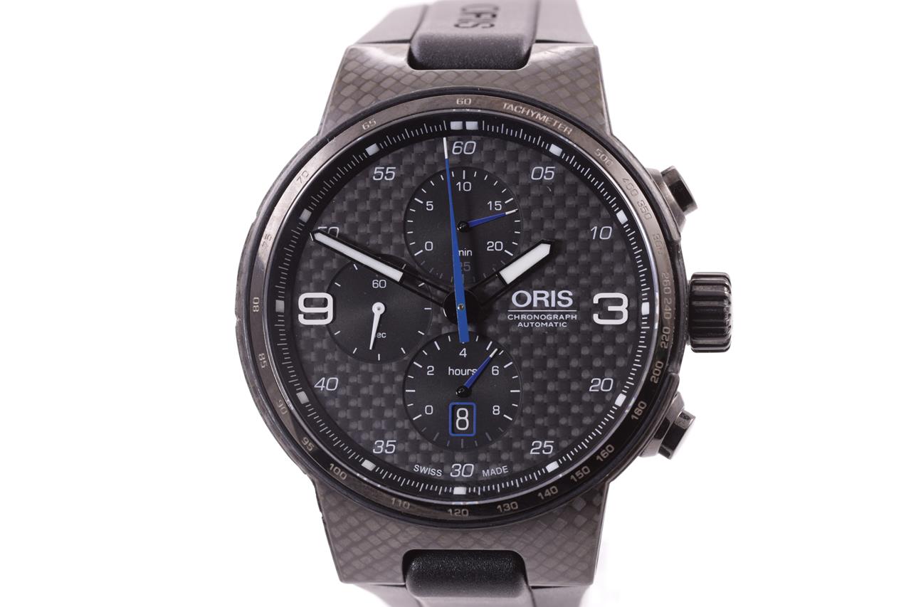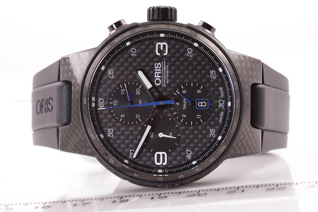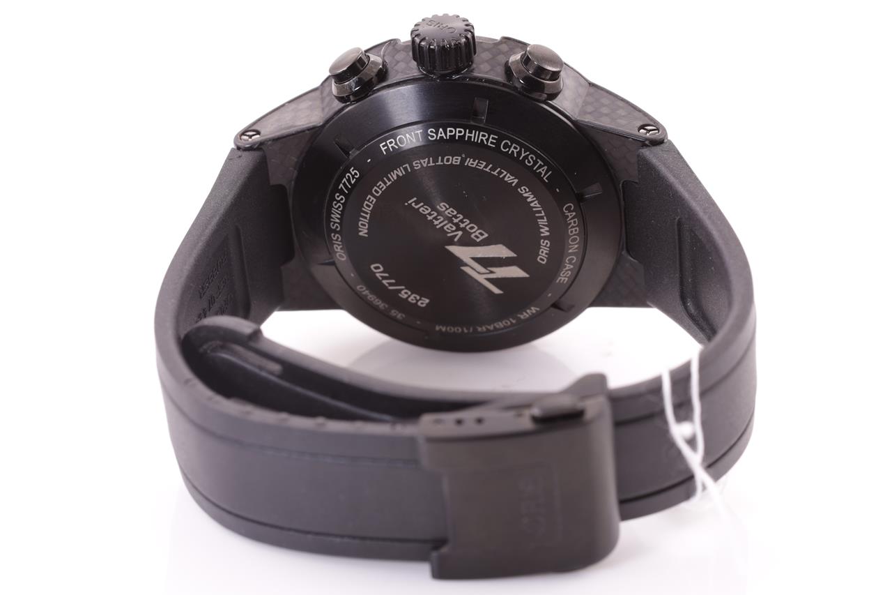 Oris Williams Valtteri Bottas Limited Edition titanium, carbon fibre and black DLC coated automatic mens watch. Black dial, date, case diameter: 44mm, wrist size: TBAcm, Swiss made. Ref# 674 7725 8784 RS SET. With Oris black rubber strap and clasp. No box provided. 3 month FSA warranty. (New)