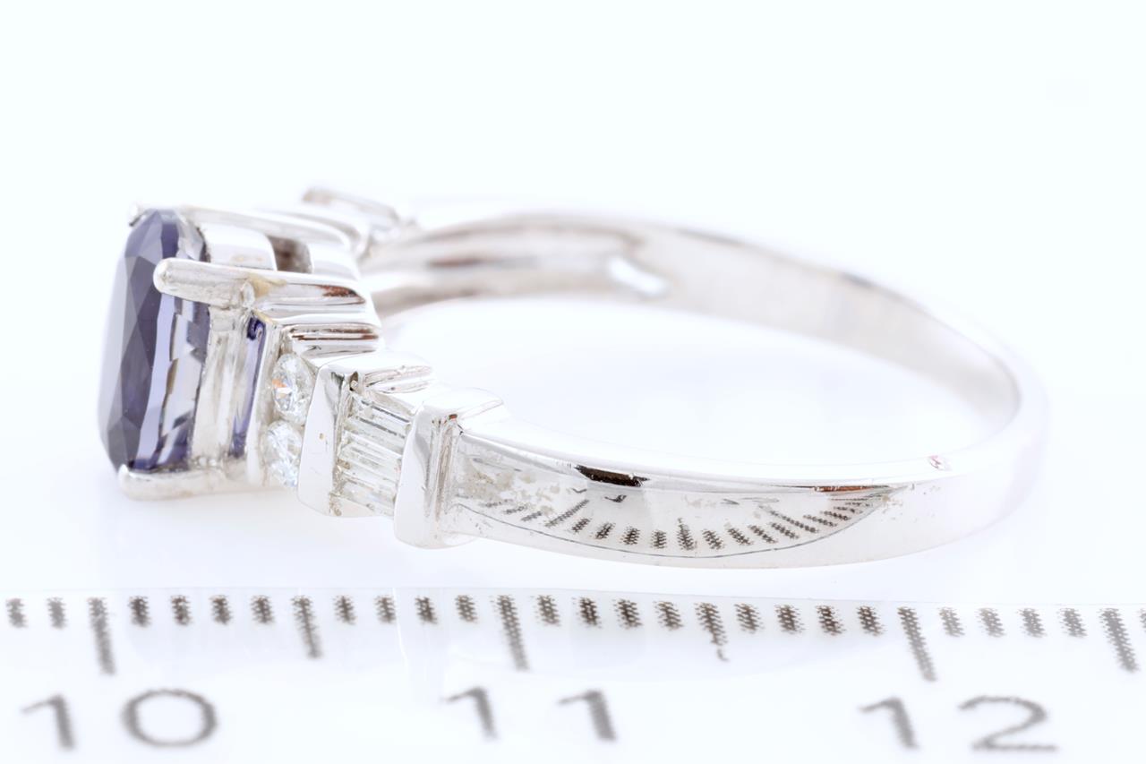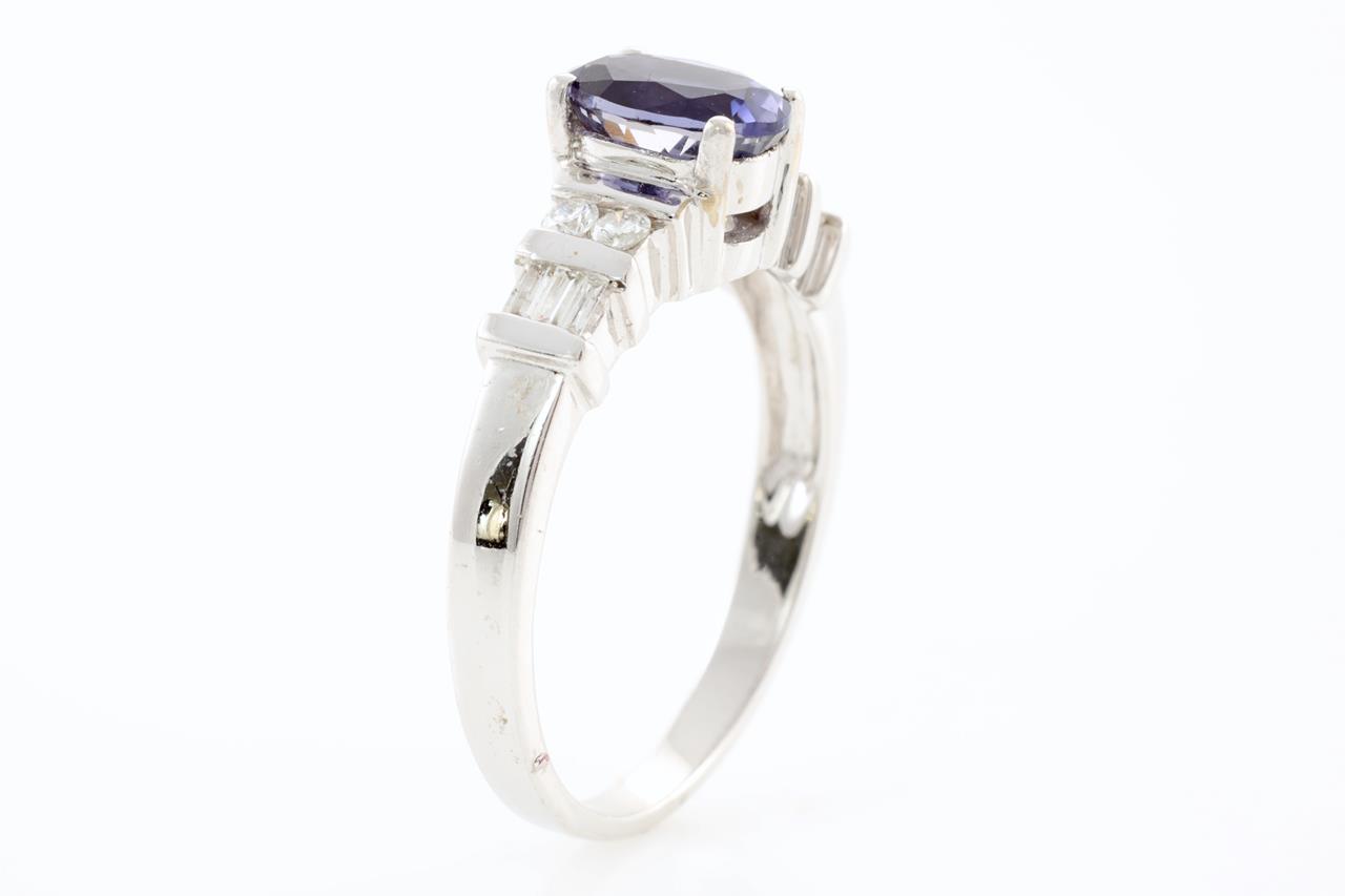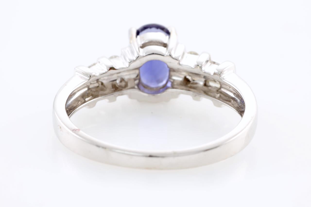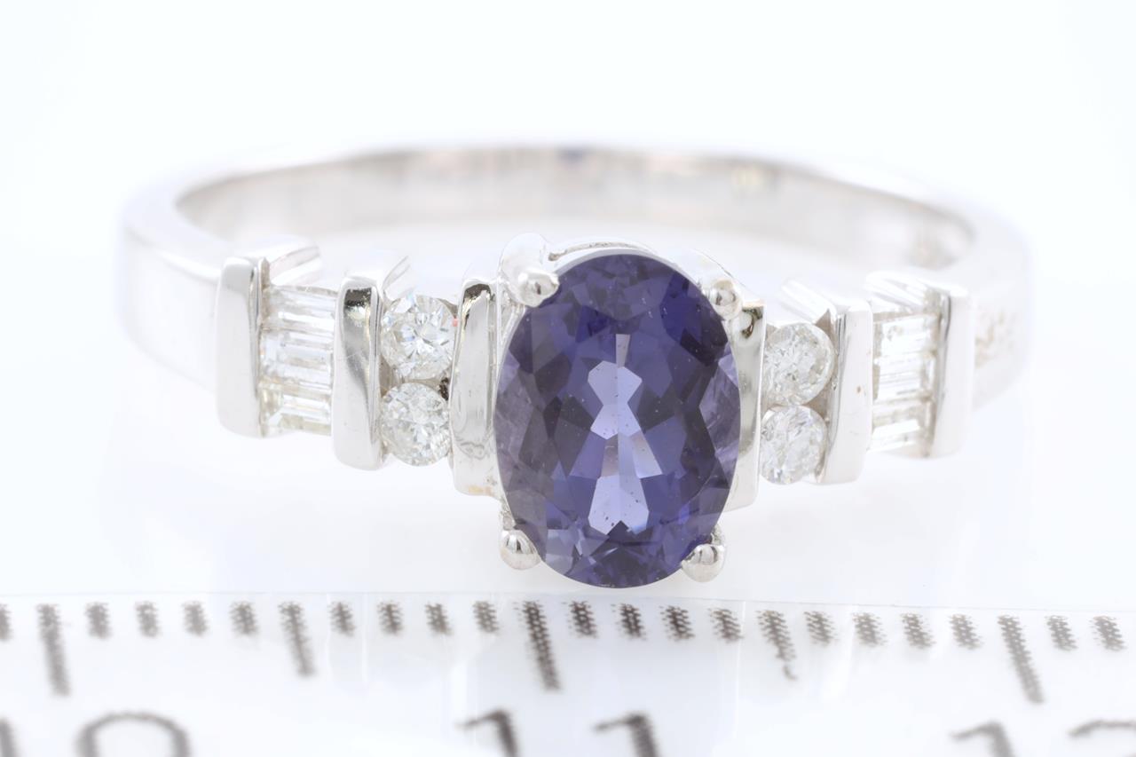 Iolite and Diamond ring with oval cut Iolite of 0.67ct and Diamonds totalling 0.10cts. 14ct White gold. Ring size M1/2 - can only be resized by a maximum of 3 sizes up, no resizing down. Weight 3.1g. (As New)