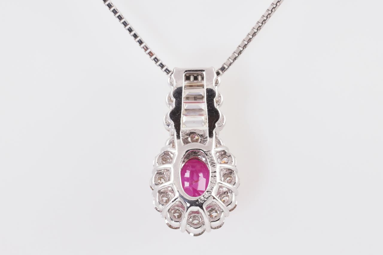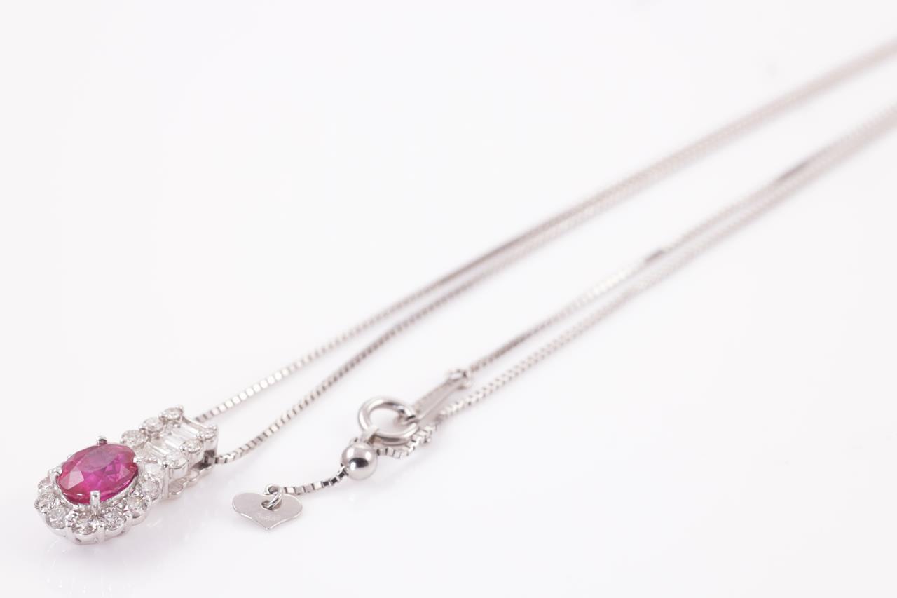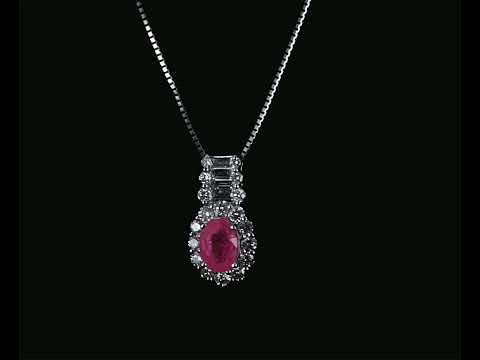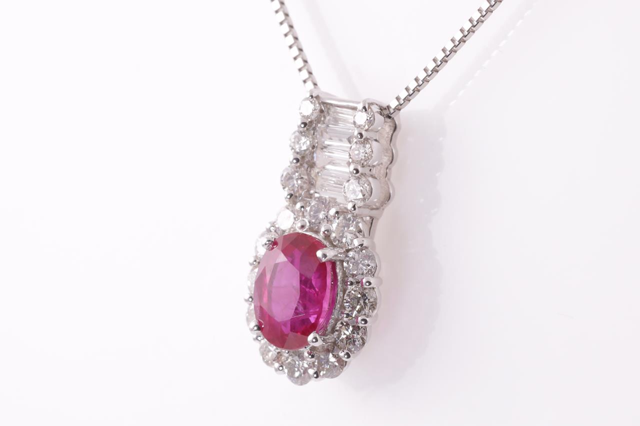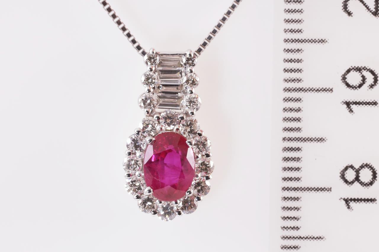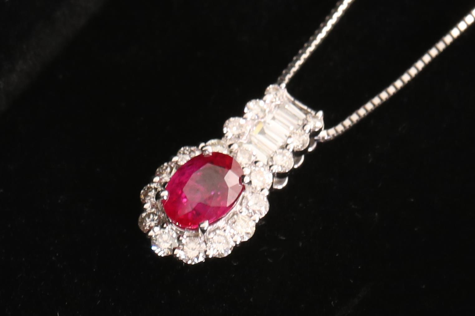 Ruby and Diamond Pendant with oval cut Ruby of 1.27cts with baguette and round Diamonds totalling 0.63cts (Estimated grading: G-H P1). Platinum 45cm ajustable chain. Weight: 4.9g (Pre-owned)