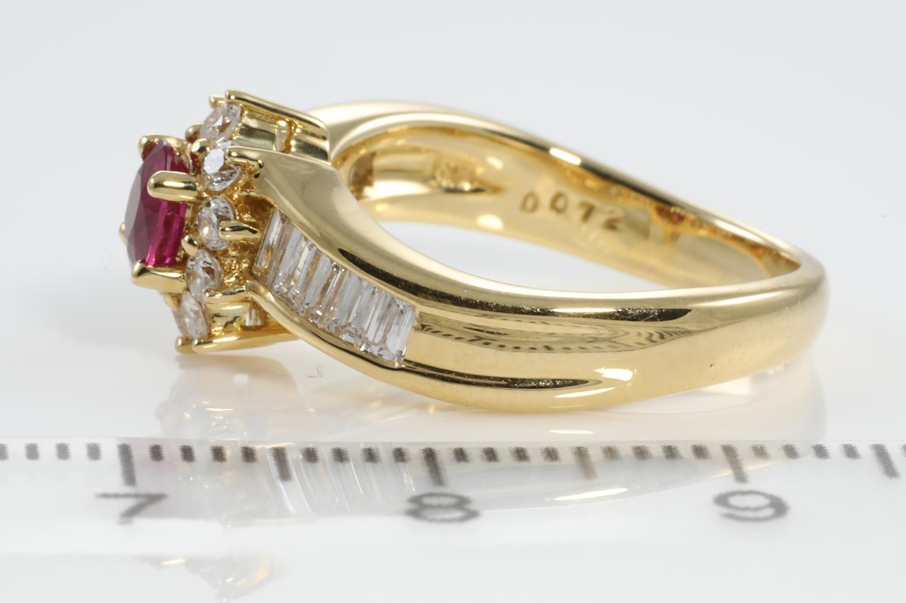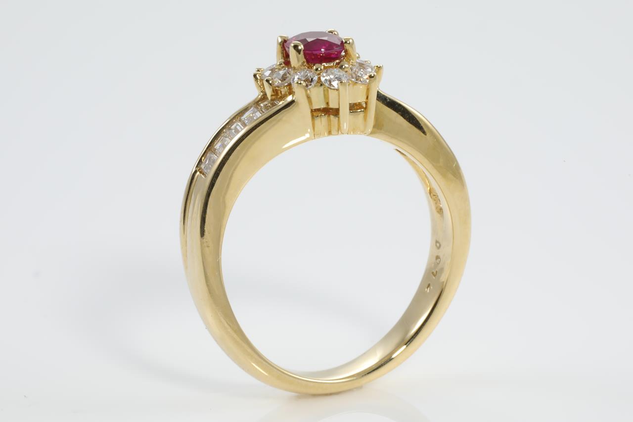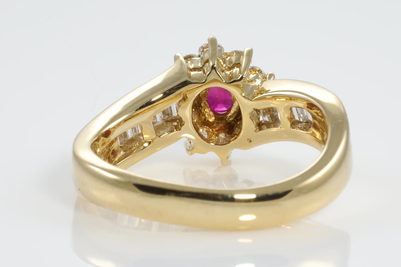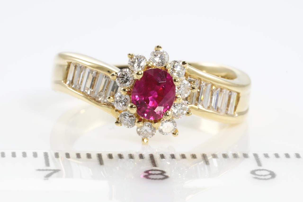 Ruby and Diamond ring with oval shape Ruby of 0.47ct and Diamonds totalling 0.72cts (Estimated grading: G-H VS). 18ct yellow gold. Ring size L. Weight: 6.1g (Pre-owned)