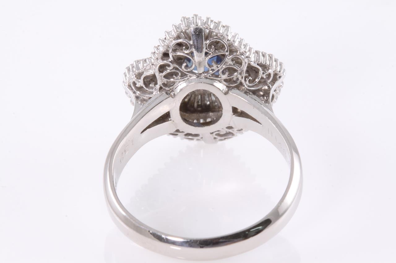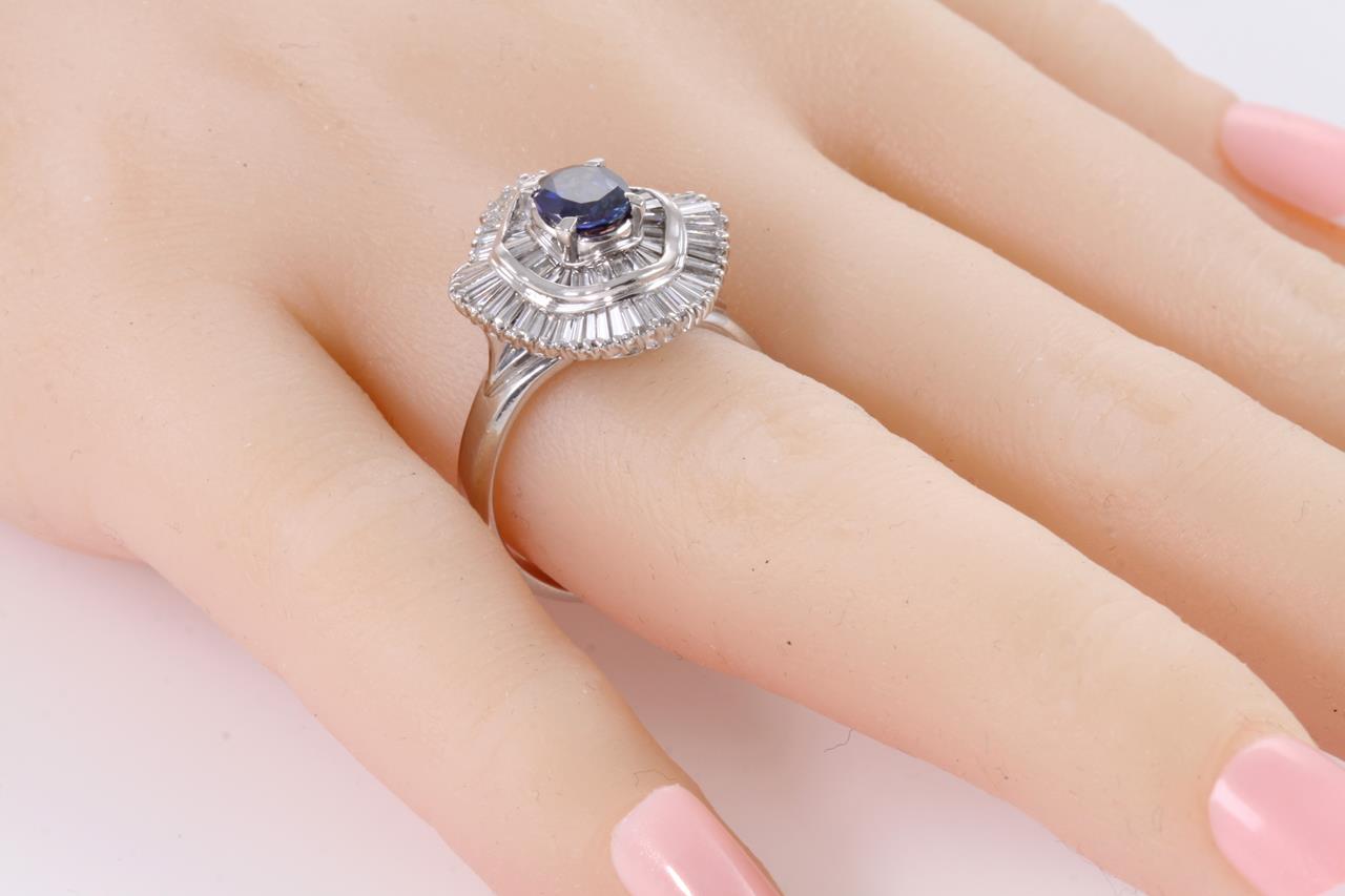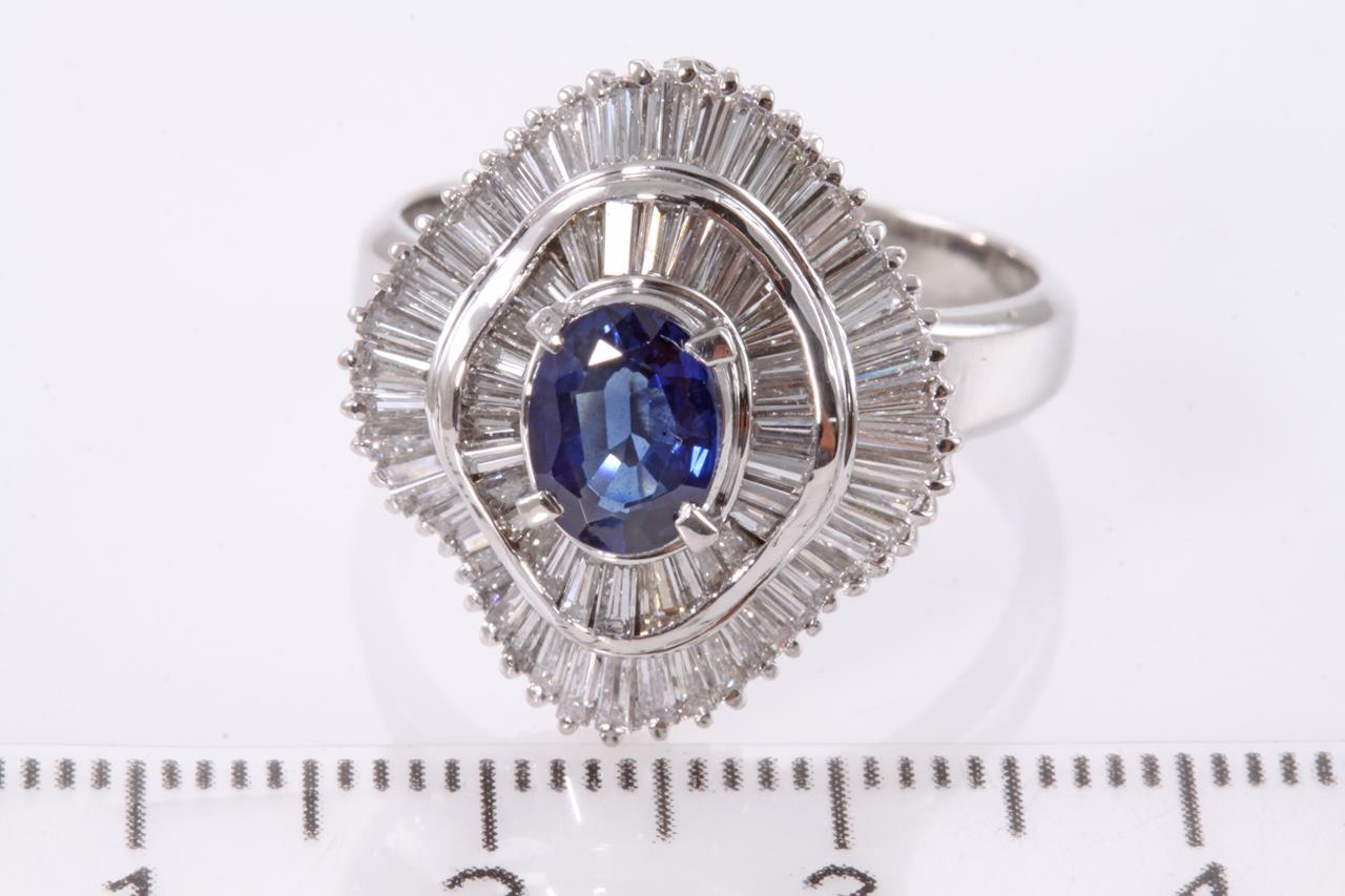 Sapphire and Diamond Ballerina ring with an Oval blue sapphire of 1.10ct and Baguette Cut Diamonds totalling 1.48cts (Estimated grading: H-I VS). Platinum. Ring size R. Weight: 11.2g (Pre-owned)