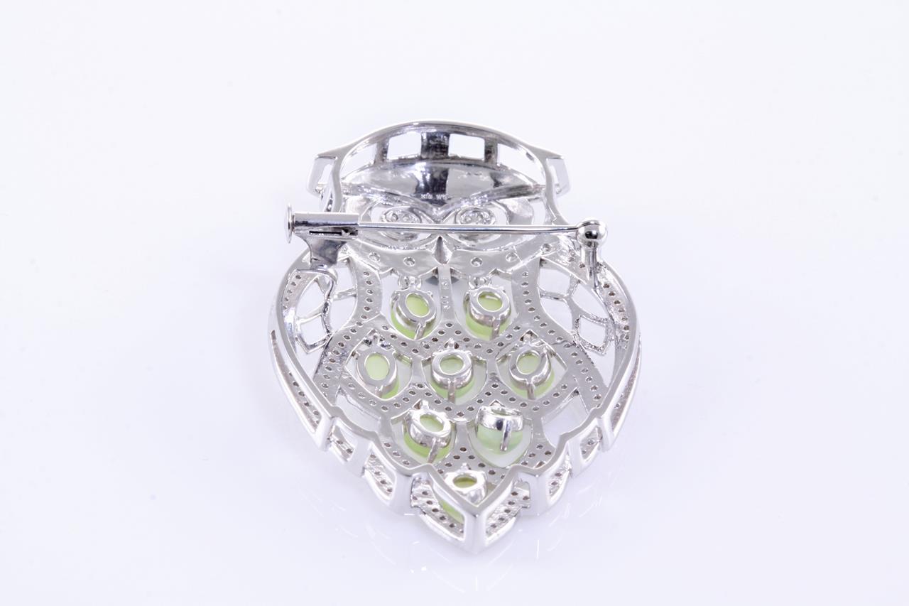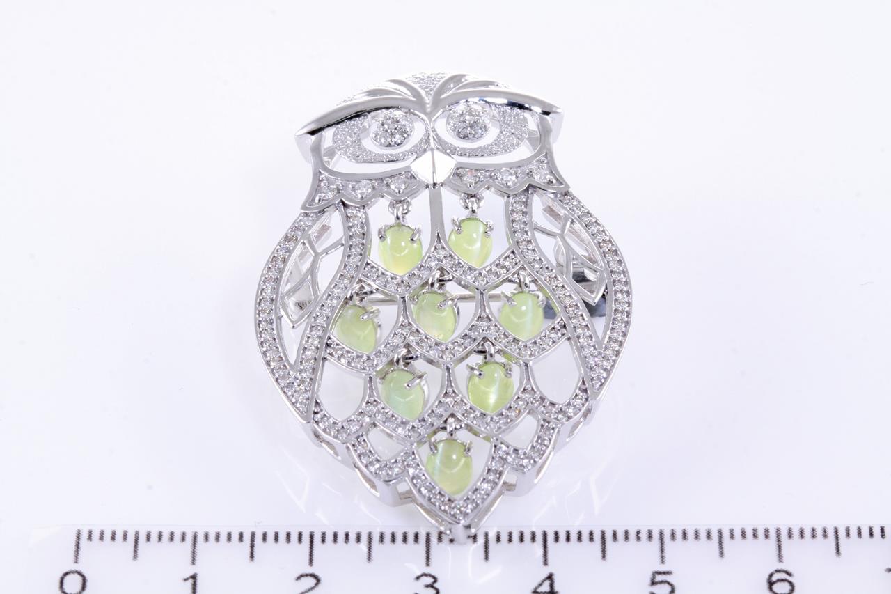 Diamond and Cats Eye owl design brooch/pendant with Chrysoberyl Cats Eye totalling 4.04cts and Diamonds totalling 1.10cts (Estimated grading: G-H SI-P1). 18ct and 14ct white gold. Weight: 15.6g. (Pre-owned)