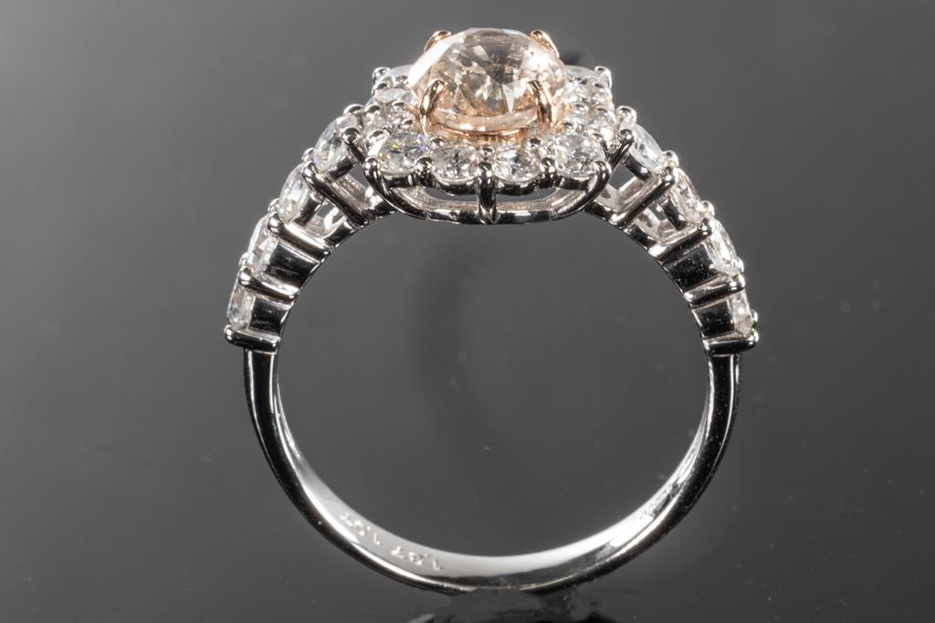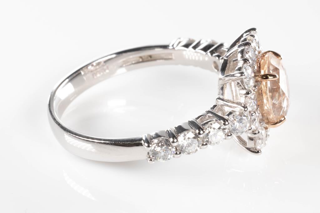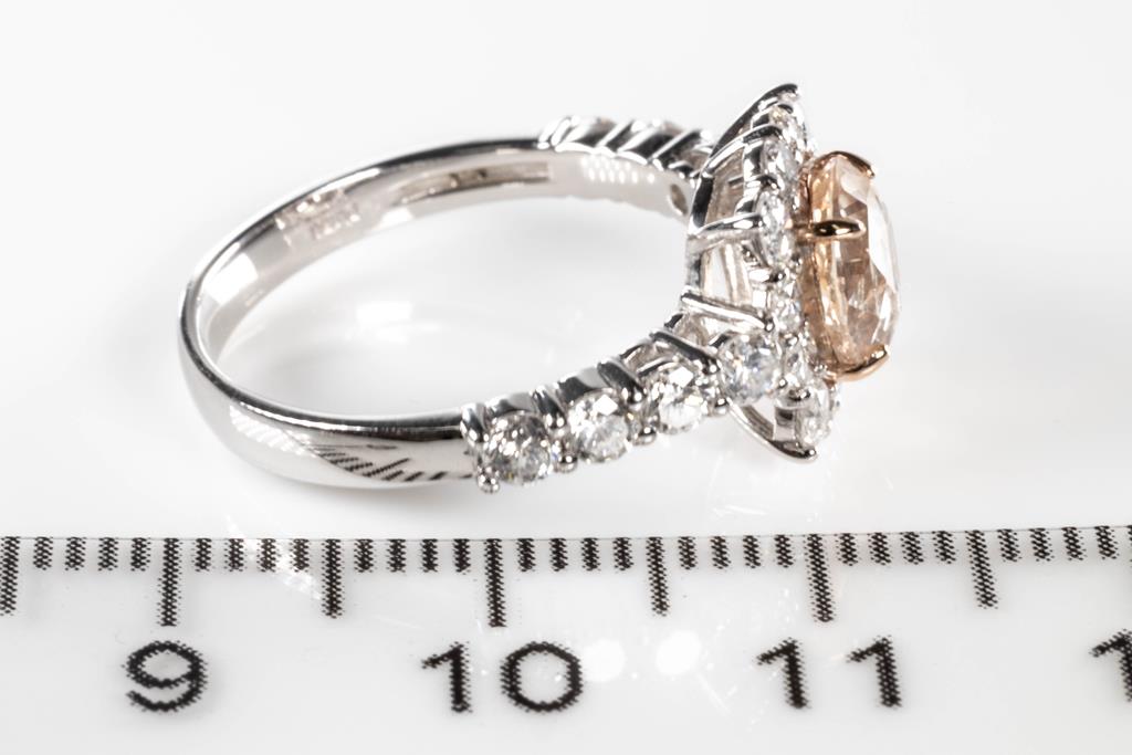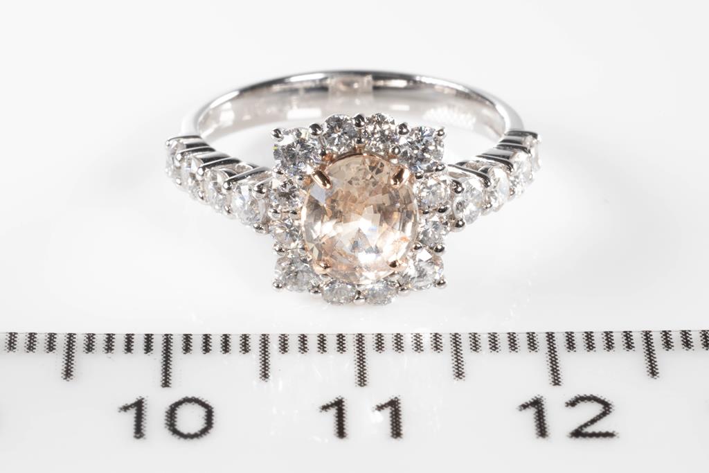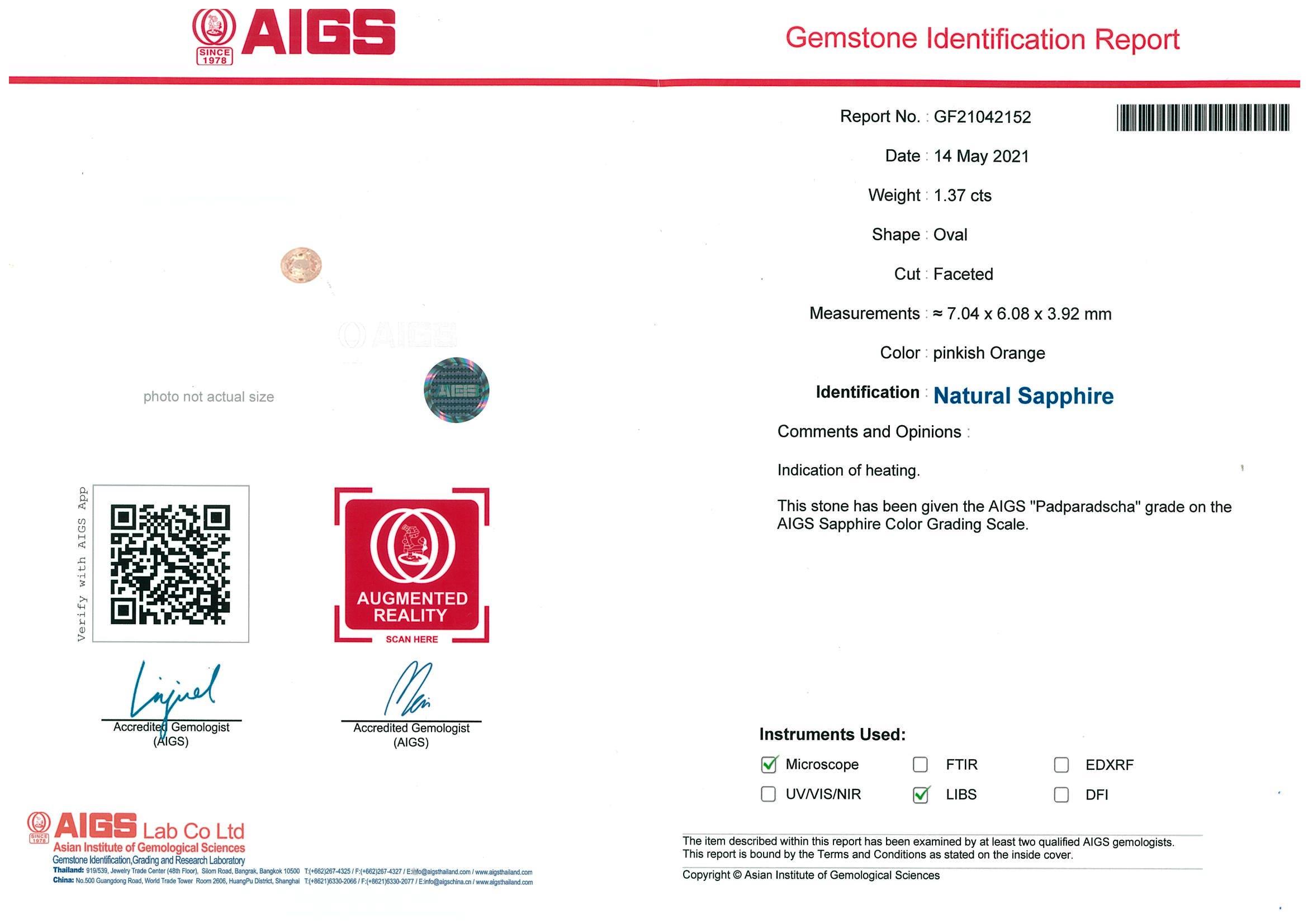Sapphire and Diamond Ring with an oval Padparadscha Sapphire of 1.37ct (with copy of AIGS report #GF21042152 with surface reaching inclusion) and Diamonds totalling 1.07cts (Estimated grading: G-H SI). Platinum. Ring size: L - can be resized up by a maximum of 3 sizes up, down with ring clip. Weight: 4.5g (Pre-owned)