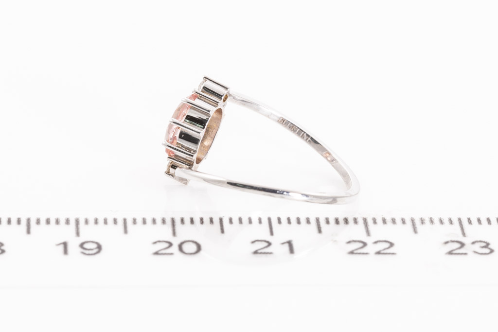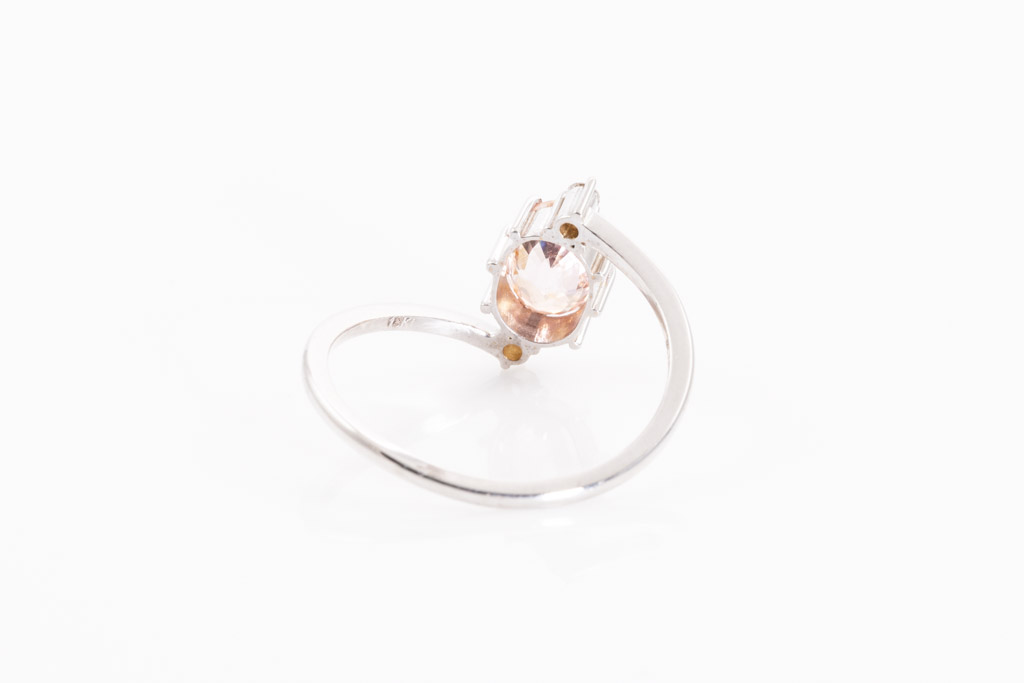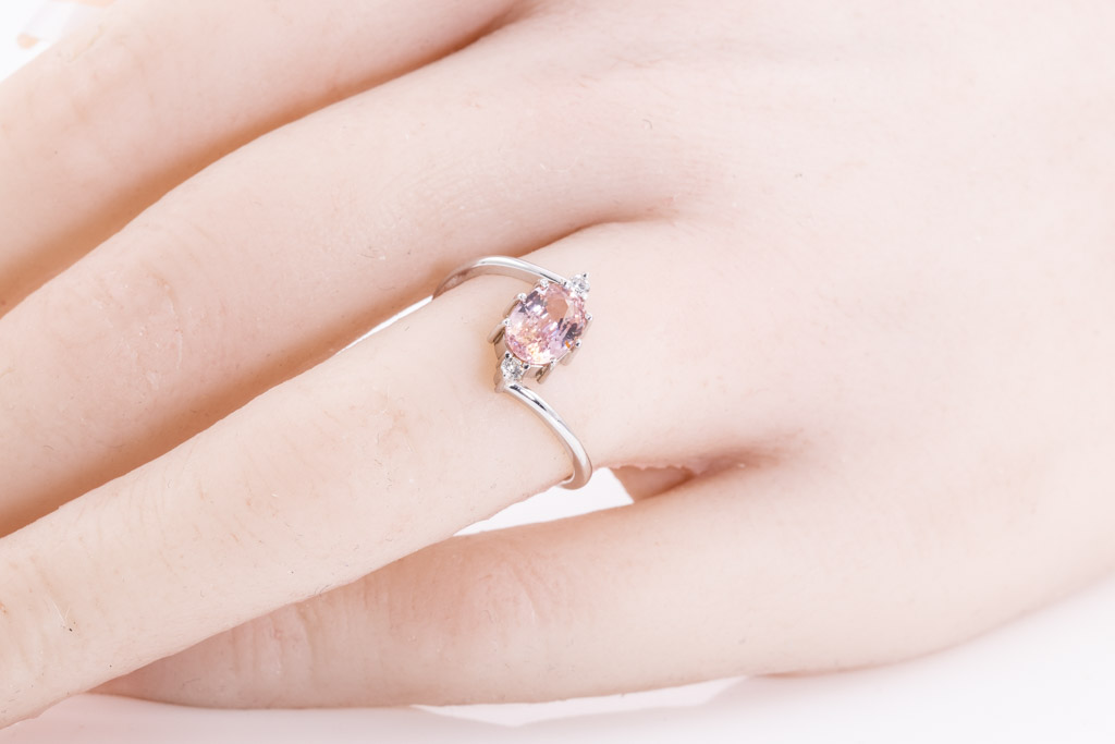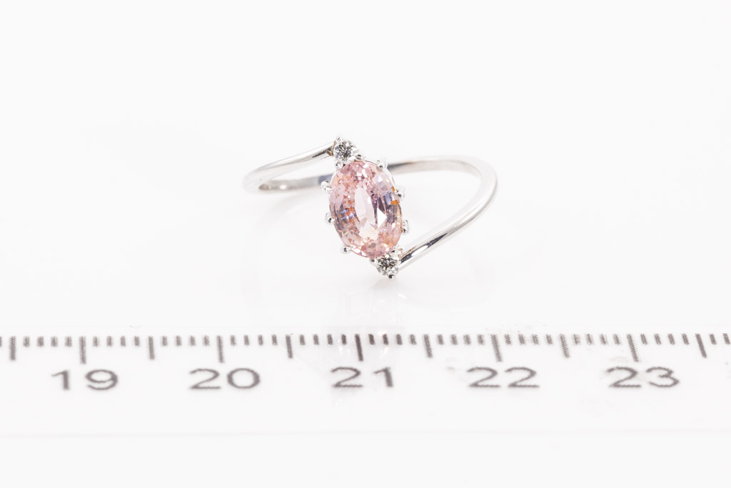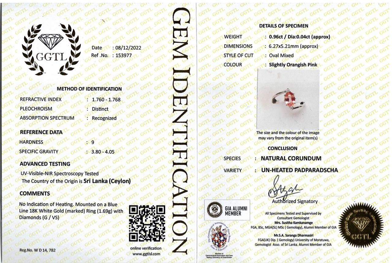 Sapphire and Diamond ring with oval shape un-heated Ceylon Padparadscha Sapphire of 0.96ct and round Diamonds totalling approximately 0.04cts. 18ct white gold. Ring size K. Weight 1.6g. With Gem report #153977. (As New)