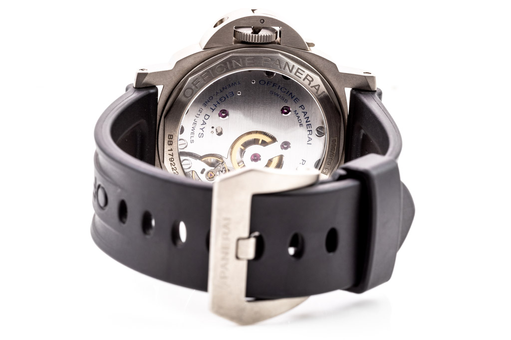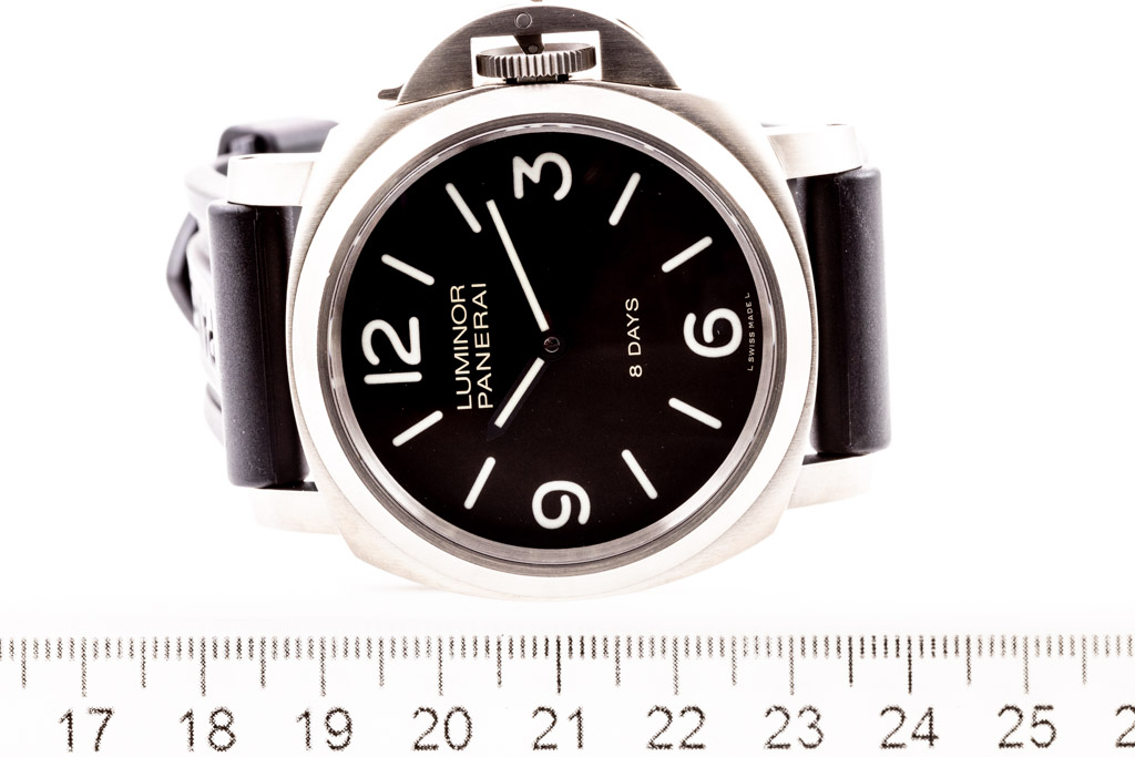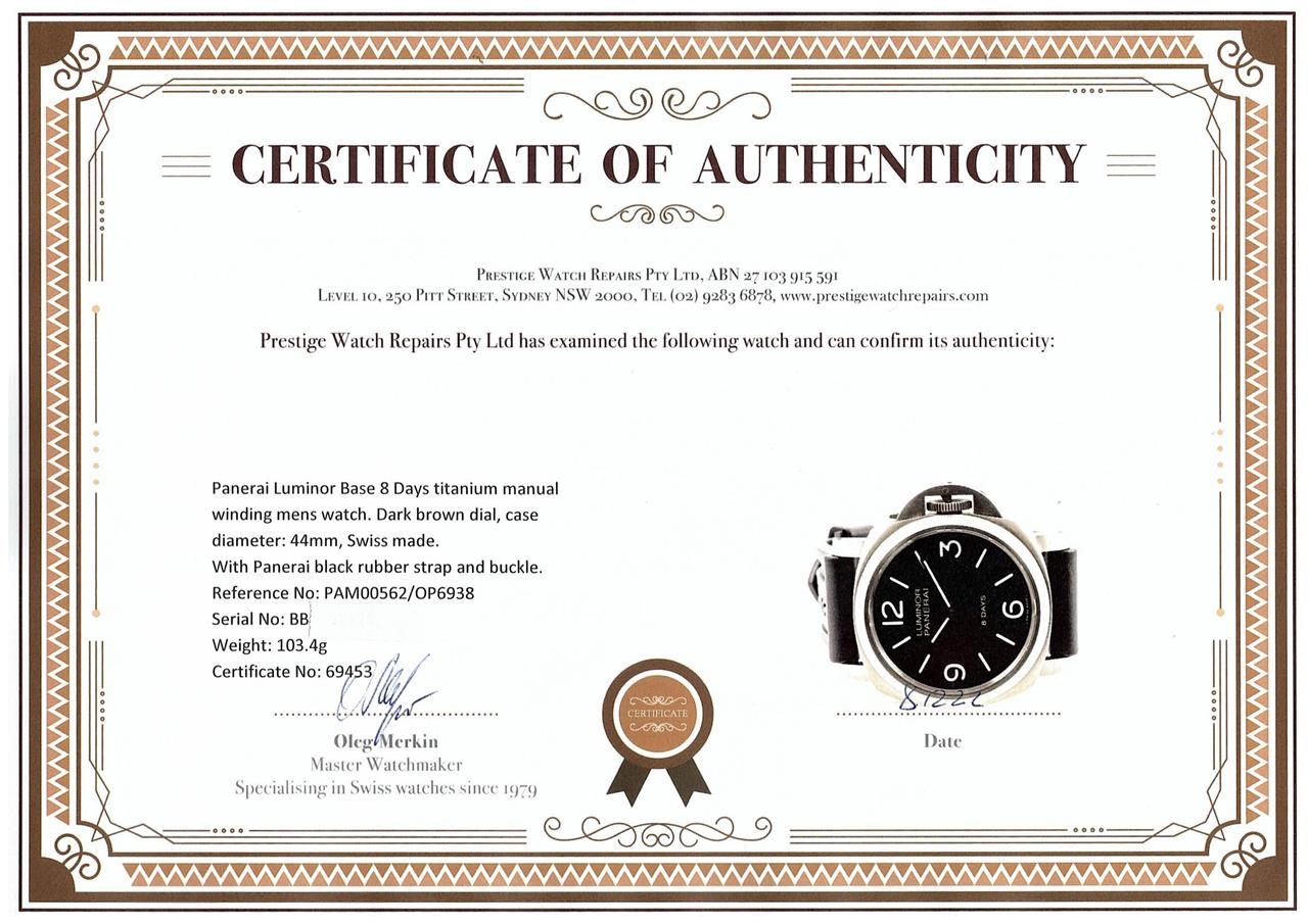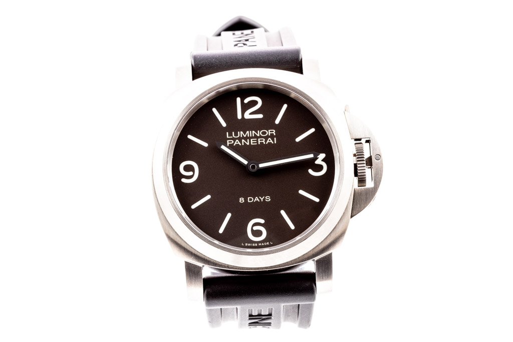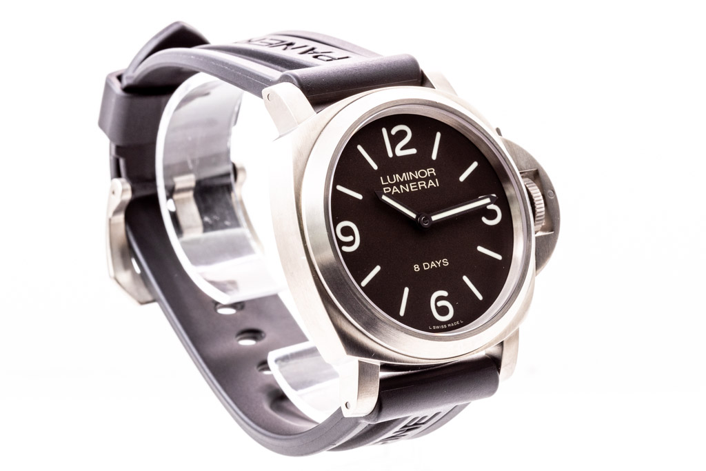 Panerai Luminor Base 8 Days titanium manual winding mens watch. Dark brown dial, case diameter: 44mm, strap length: 21.5cm, Swiss made. Ref# PAM00562/OP6938. With Panerai black rubber strap and buckle. With Certificate of Authenticity. 3 month FSA warranty. (Pre-owned)