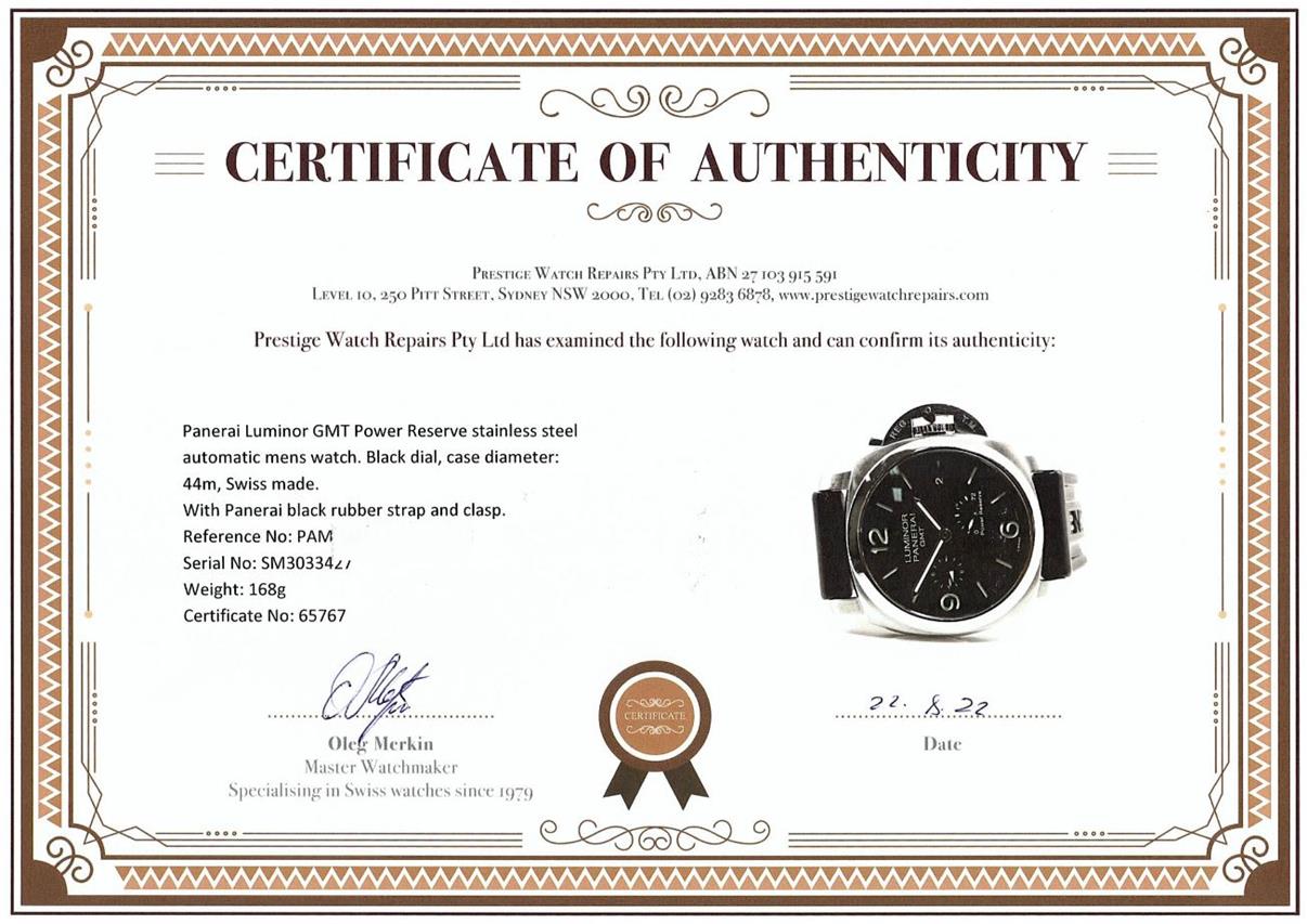 Panerai Luminor GMT Power Reserve stainless steel automatic mens watch. Black dial, case diameter: 44m, length: 21cm, Swiss made. Ref# PAM00347. With Panerai black rubber strap and buckle. With Certificate of Authenticity, Panerai spare steel bracelet and Panerai box. 3 month FSA warranty. (Pre-owned)