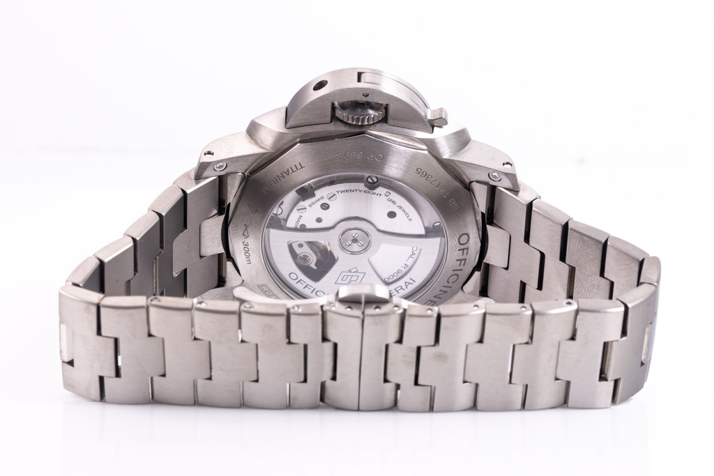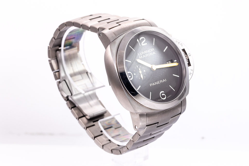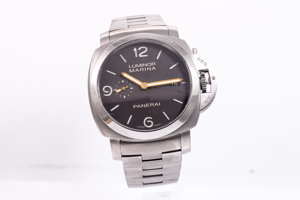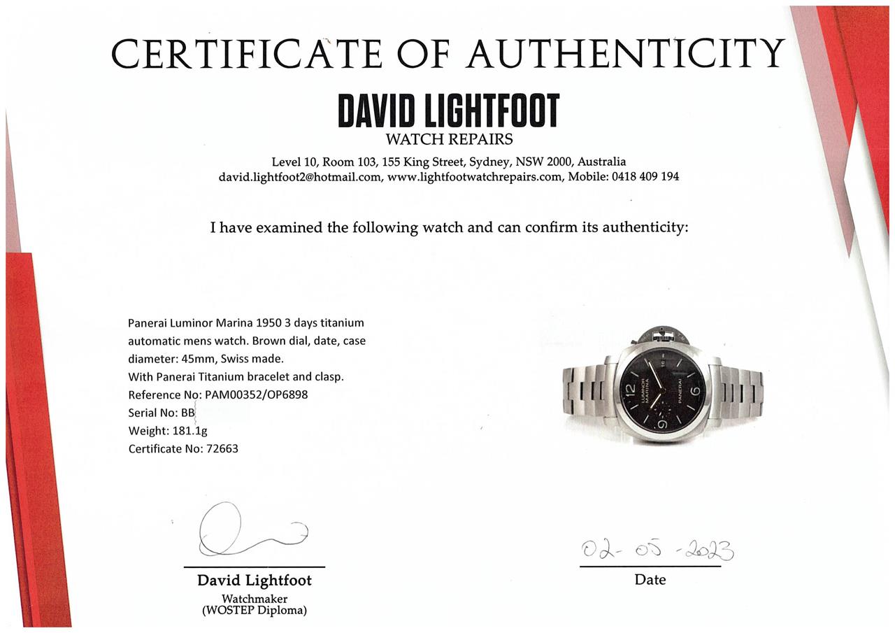 Panerai Luminor Marina 1950 3 days titanium automatic mens watch. Brown dial, date, case diameter: 45mm, wrist size: 19.5cm, Swiss made. Ref# PAM00352/OP6898. With Panerai Titanium bracelet and clasp. With Certificate of Authenticity, Panerai Certificate booklet and Panerai box. 3 month FSA warranty. (Pre-owned)