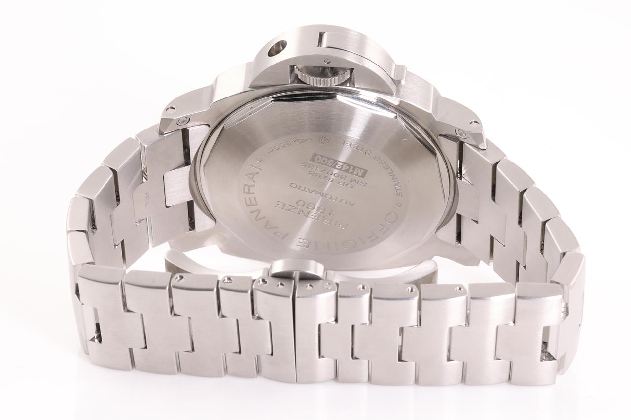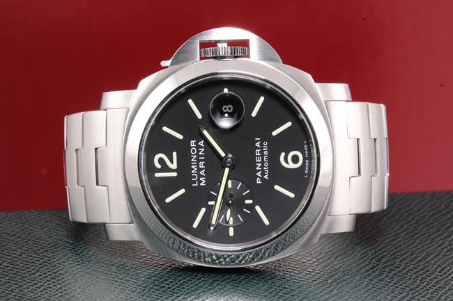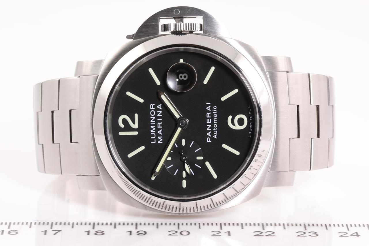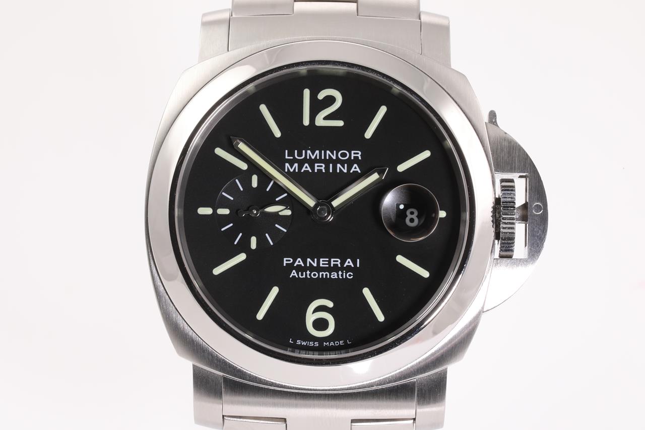 Panerai Luminor Marina stainless steel automatic mens watch. Black dial, date, small second, case diameter: 44mm, wrist size 17.5cm, Swiss made. Ref# PAM00299/OP6763. With Panerai stainless steel bracelet and clasp. With certificate of authenticity. 3 month FSA warranty. (Pre-owned)