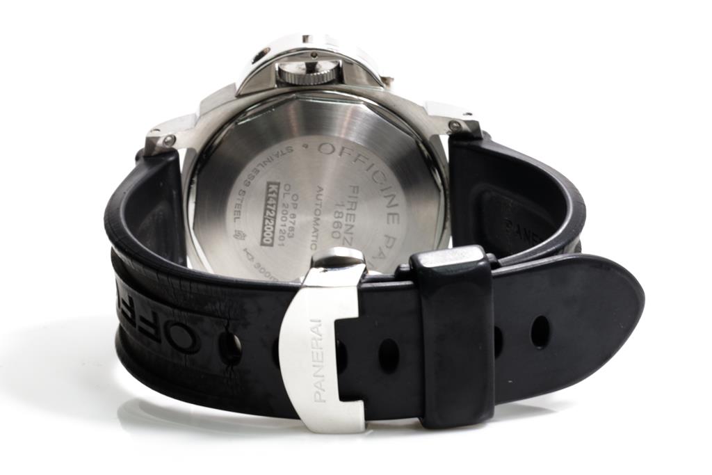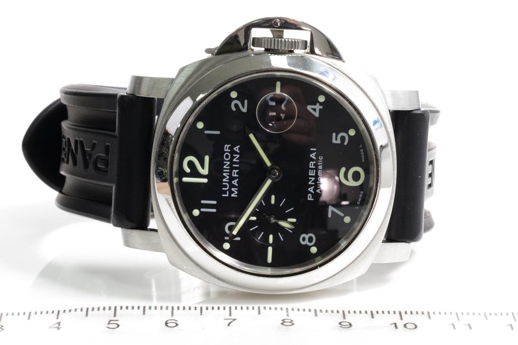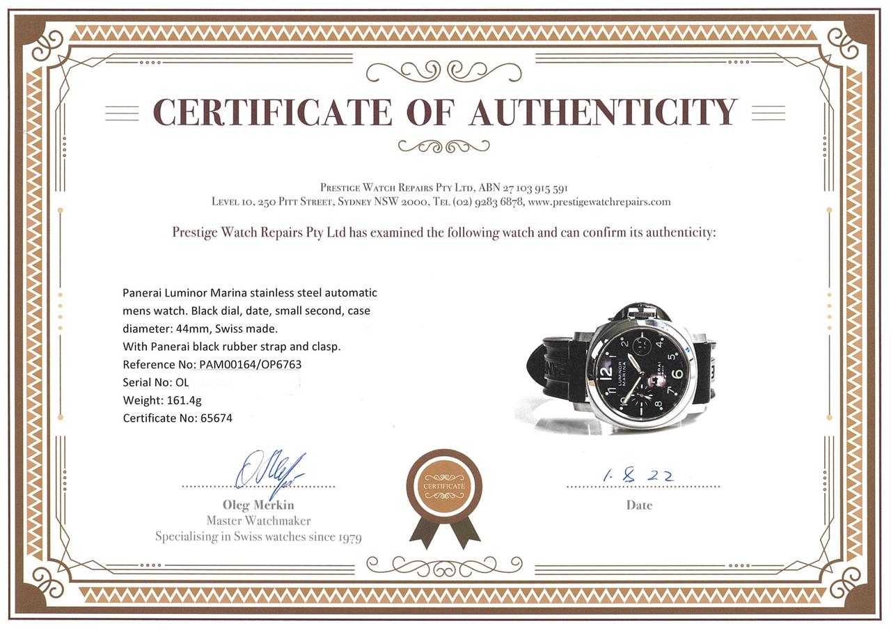 Panerai Luminor Marina stainless steel automatic mens watch. Black dial, date, small second, case diameter: 44mm, wrist size: 21cm, Swiss made. Ref# PAM00164/OP6763. With Panerai black rubber strap and clasp. With Certificate of Authenticity, Panerai International Warranty Card dated 21/06/2009, spare black leather strap and Panerai box. 3 month FSA warranty. (Pre-owned)