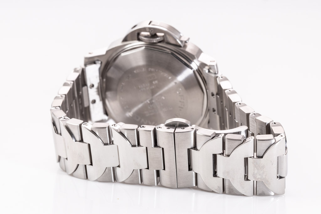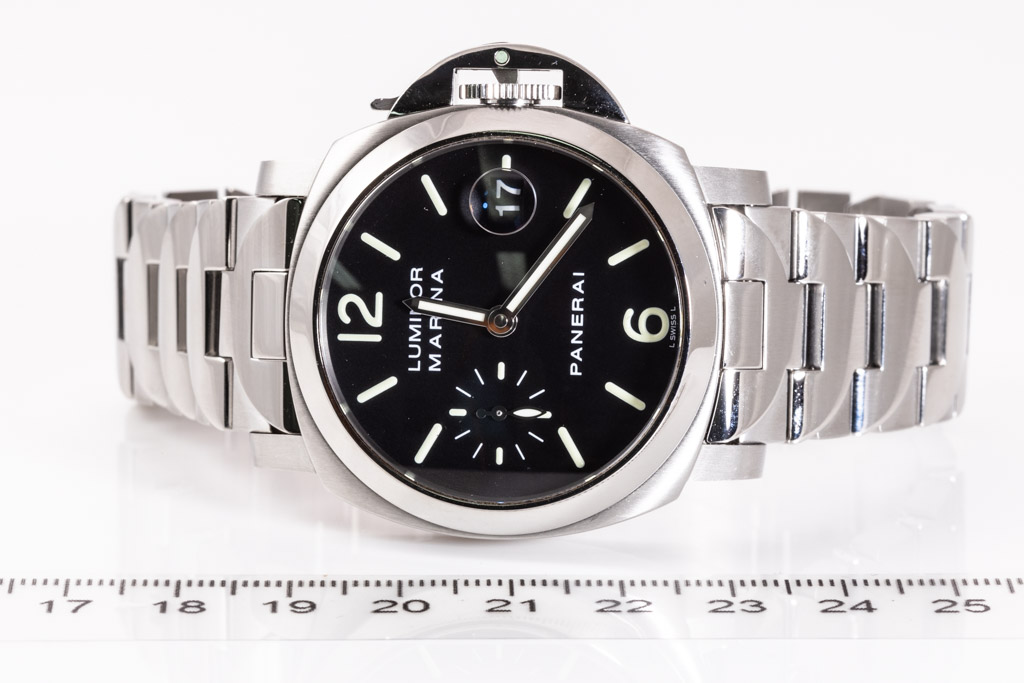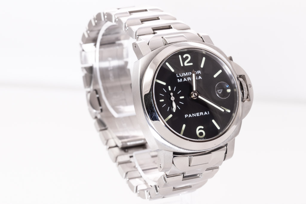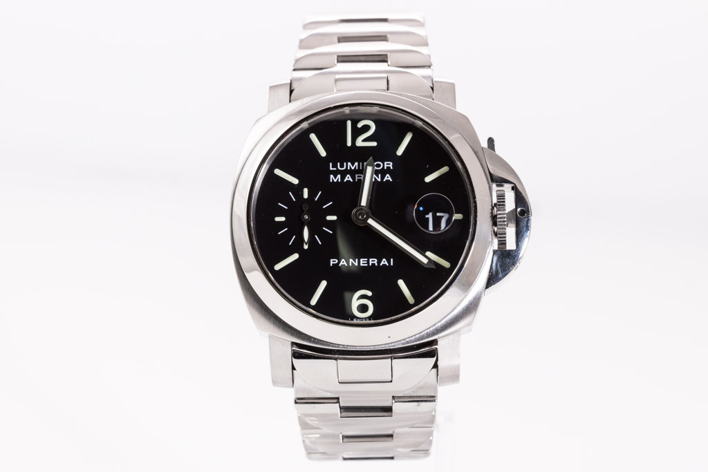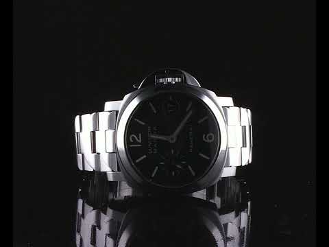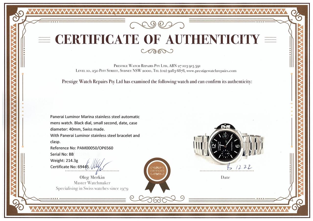 Panerai Luminor Marina stainless steel automatic mens watch. Black dial, small second, date, case diameter: 40mm, wrist size: 19cm, Swiss made. Ref# PAM00050/OP6560. With Panerai Luminor stainless steel bracelet and clasp. With Certificate of Authenticity, Panerai International Warranty Card dated 14/02/2005 and Panerai box. 3 month FSA warranty. (Pre-owned).