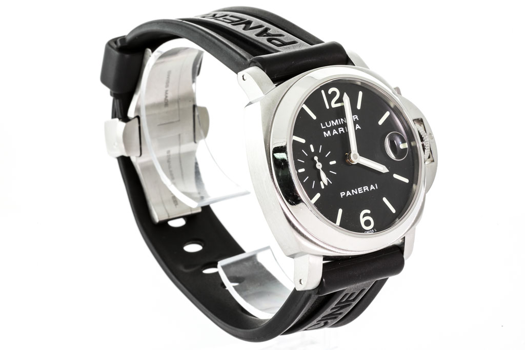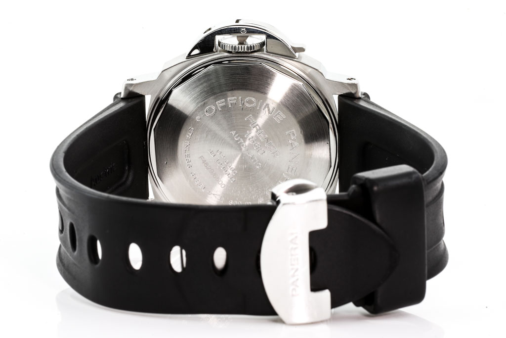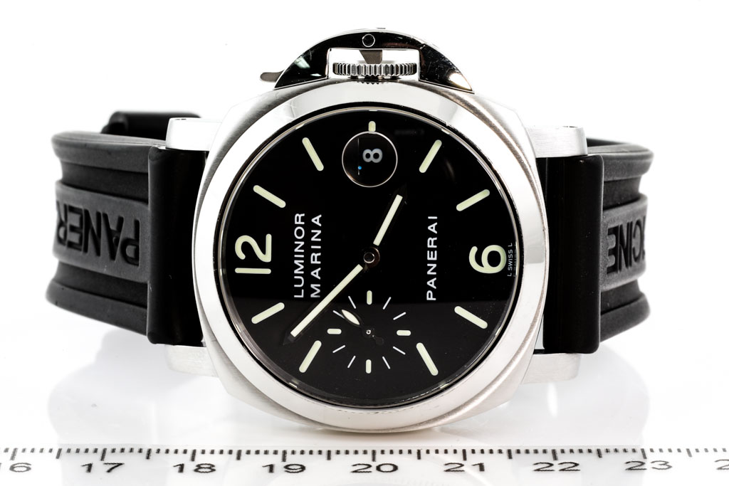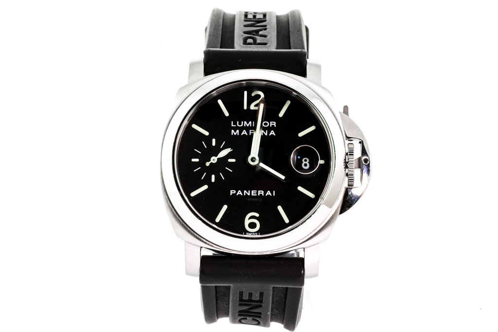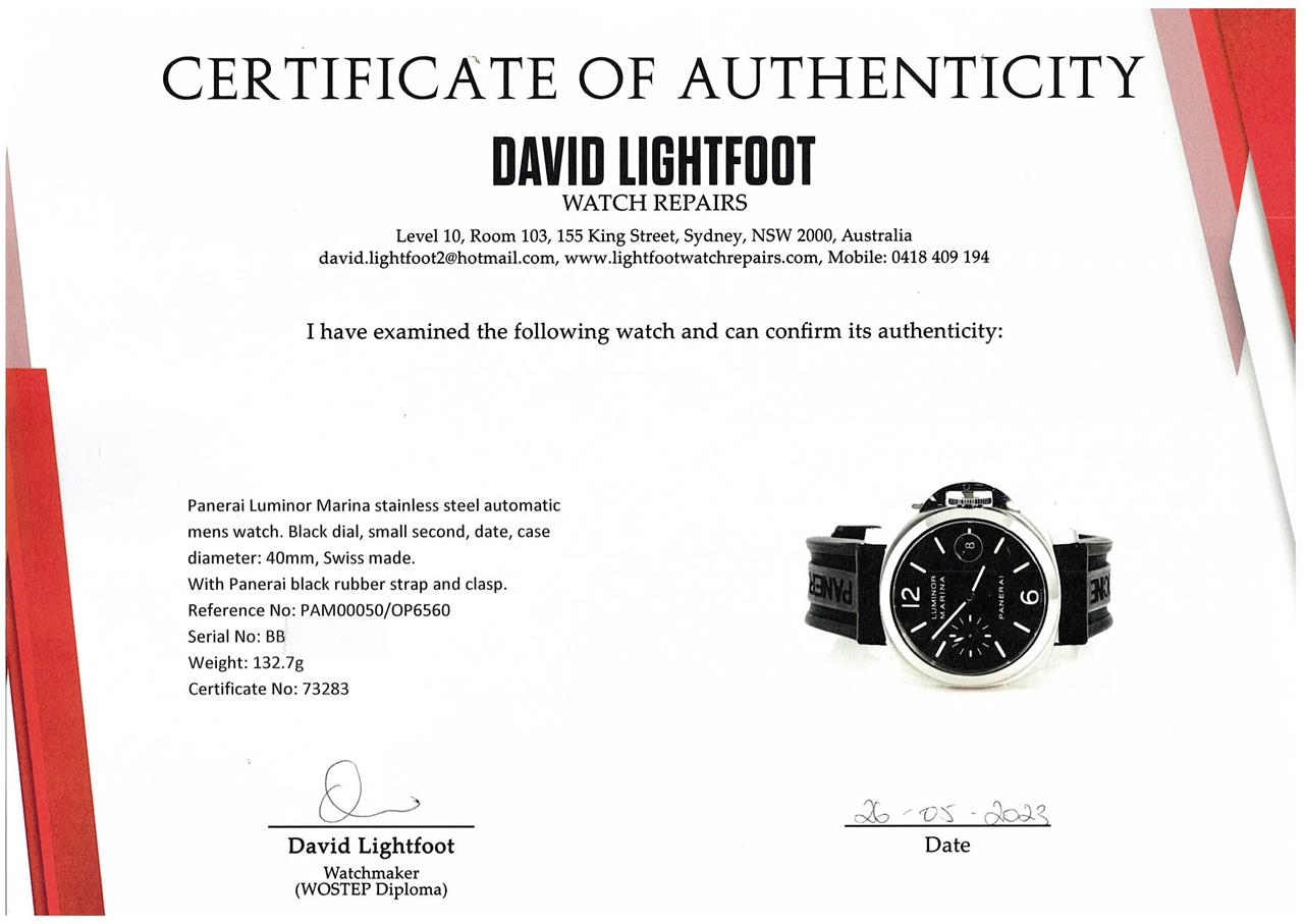 Panerai Luminor Marina stainless steel automatic mens watch. Black dial, small second, date, case diameter: 40mm, wrist size: 19cm, Swiss made. Ref# PAM00050/OP6560. With Panerai black rubber strap and clasp. With Certificate of Authenticity. 3 month FSA warranty. (Pre-owned).