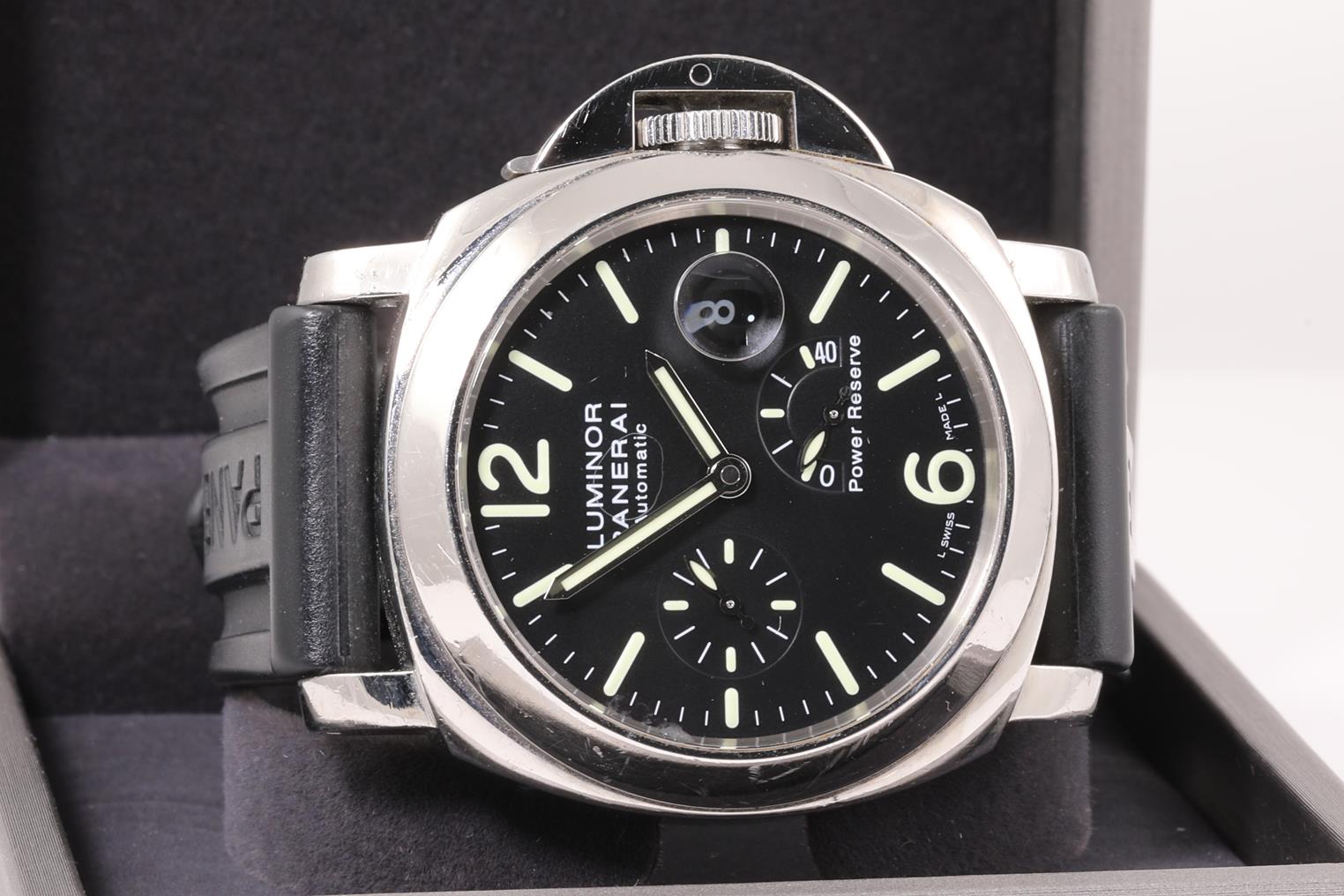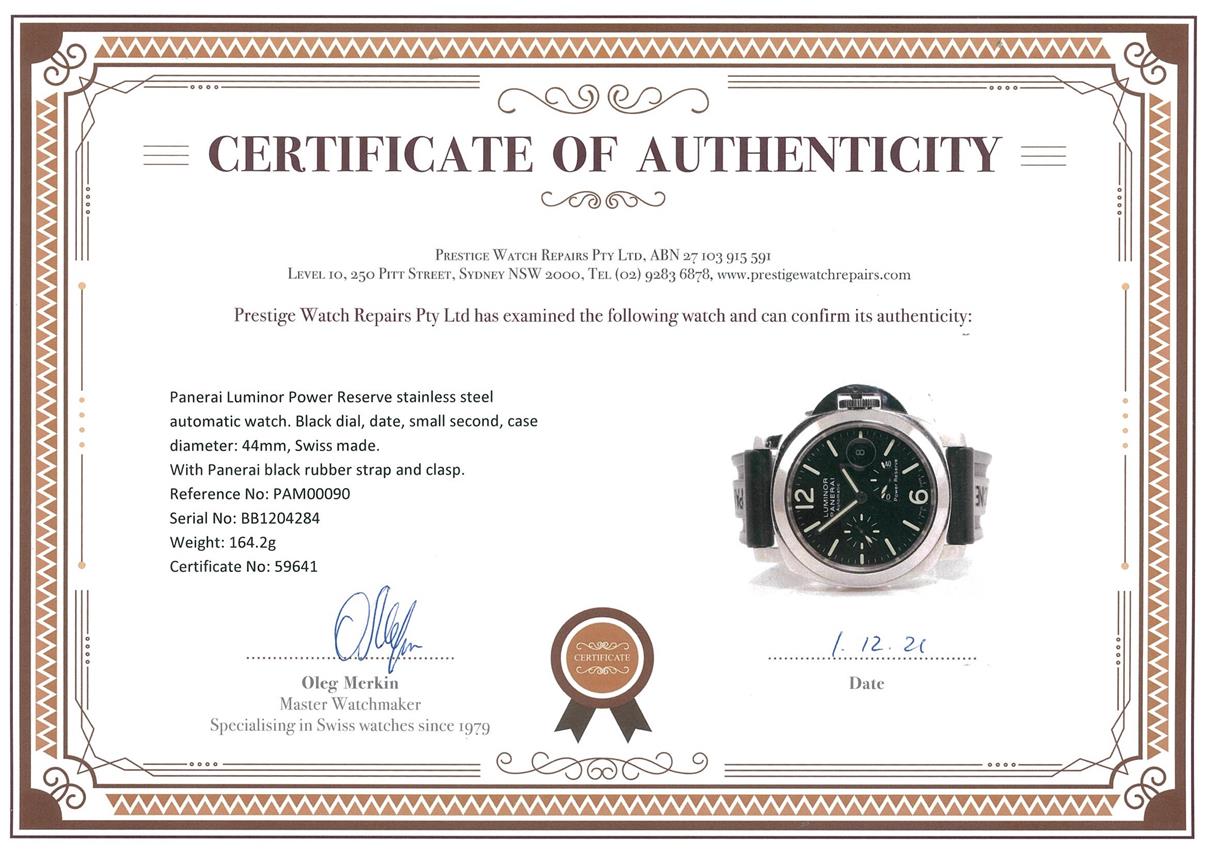 Panerai Luminor Power Reserve stainless steel automatic watch. Black dial, date, small second, case diameter: 44mm, wrist size: 17cm (adjustable), Swiss made. Ref#PAM00090. With Panerai black rubber strap and clasp. With Certificate of Authenticity and Panerai Box. 3 month FSA warranty. (Pre-owned)