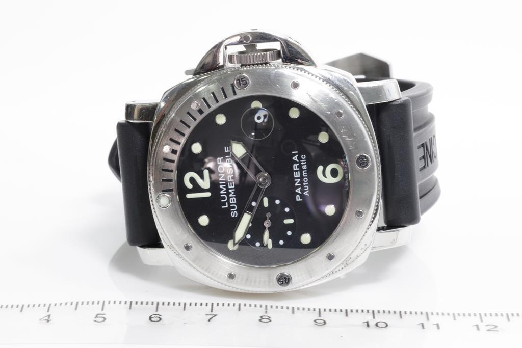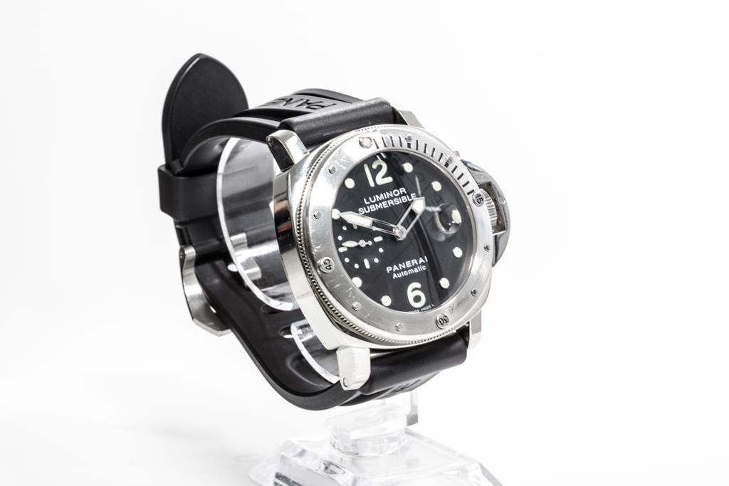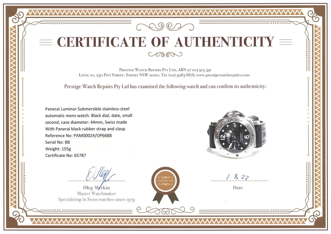 Panerai Luminor Submersible stainless steel automatic mens watch. Black dial, date, small second, case diameter: 44mm, length: 21.5cm, Swiss made Ref# PAM00024/OP6688. With Panerai black rubber strap and clasp. With Certificate of Authenticity. 3 month FSA warranty. (Pre-owned)