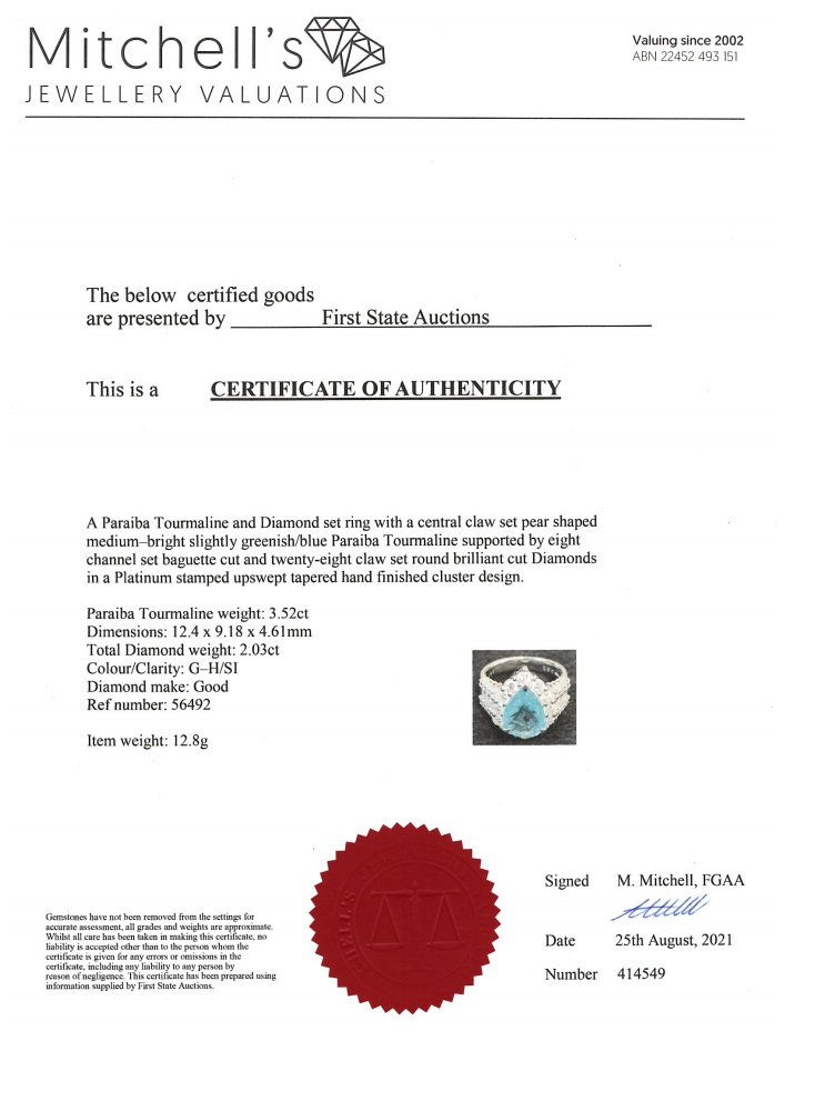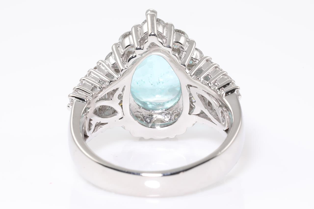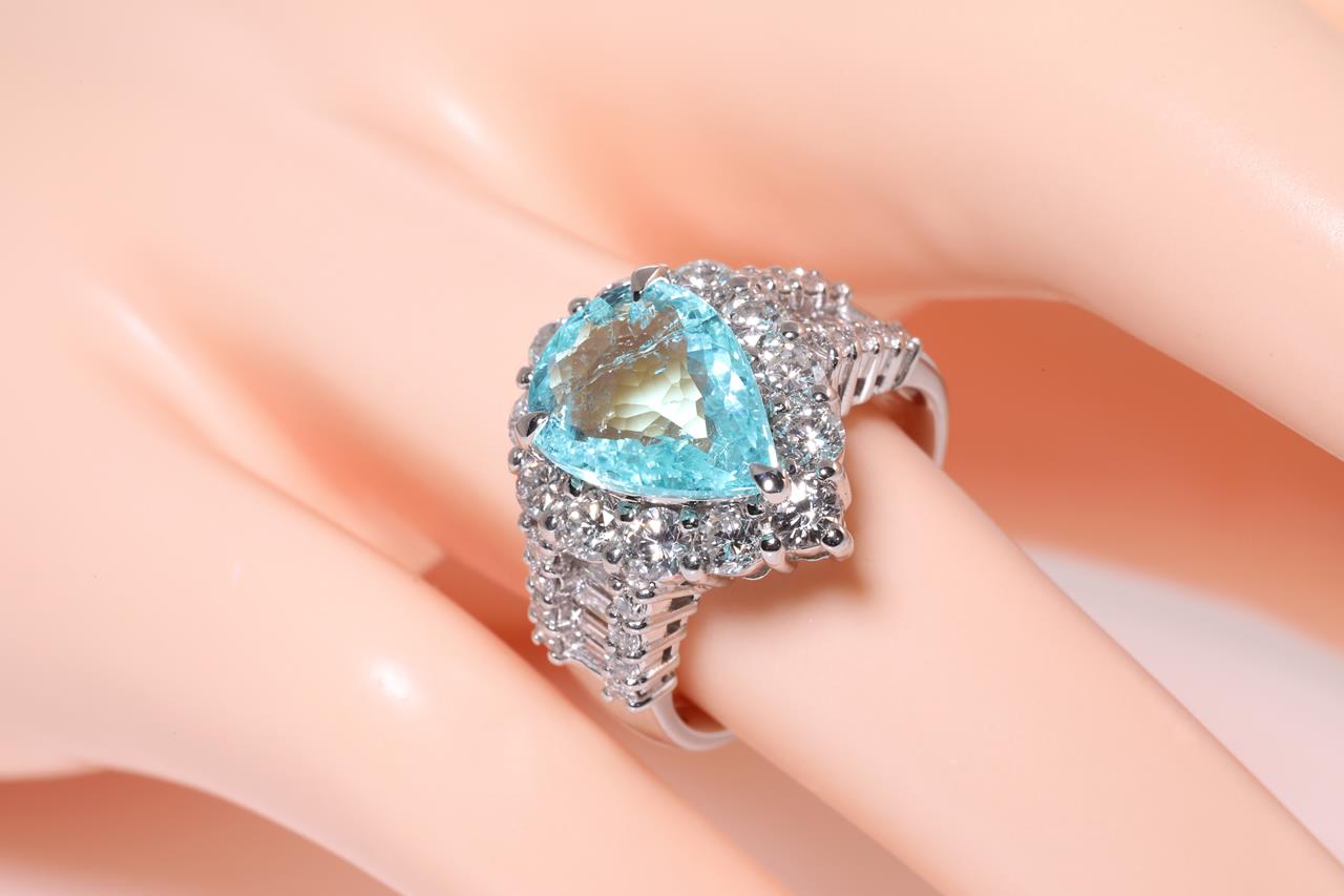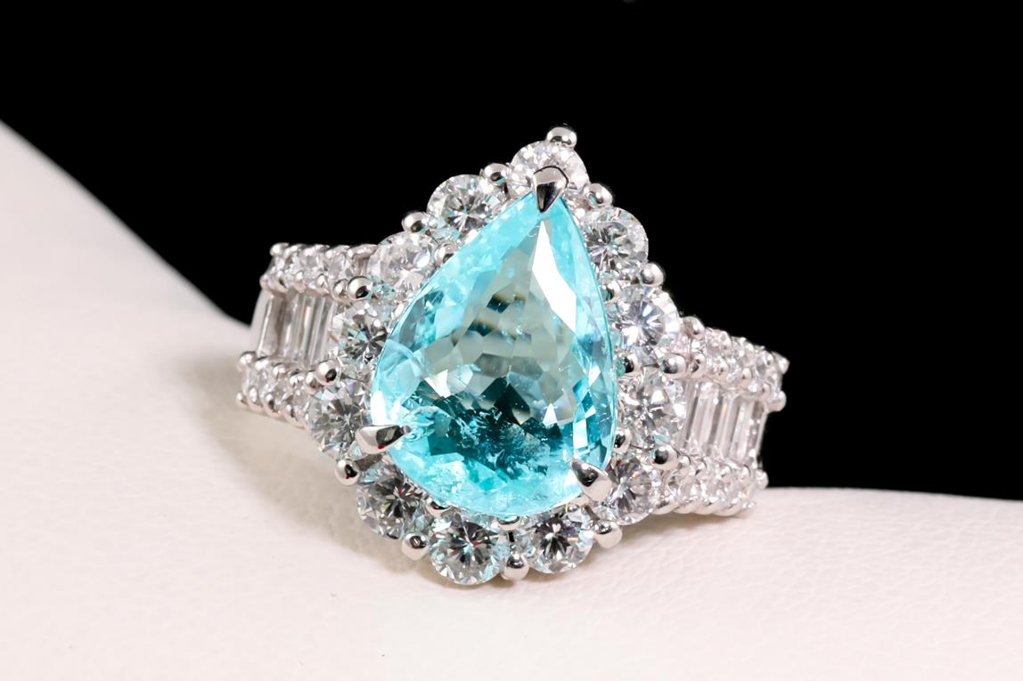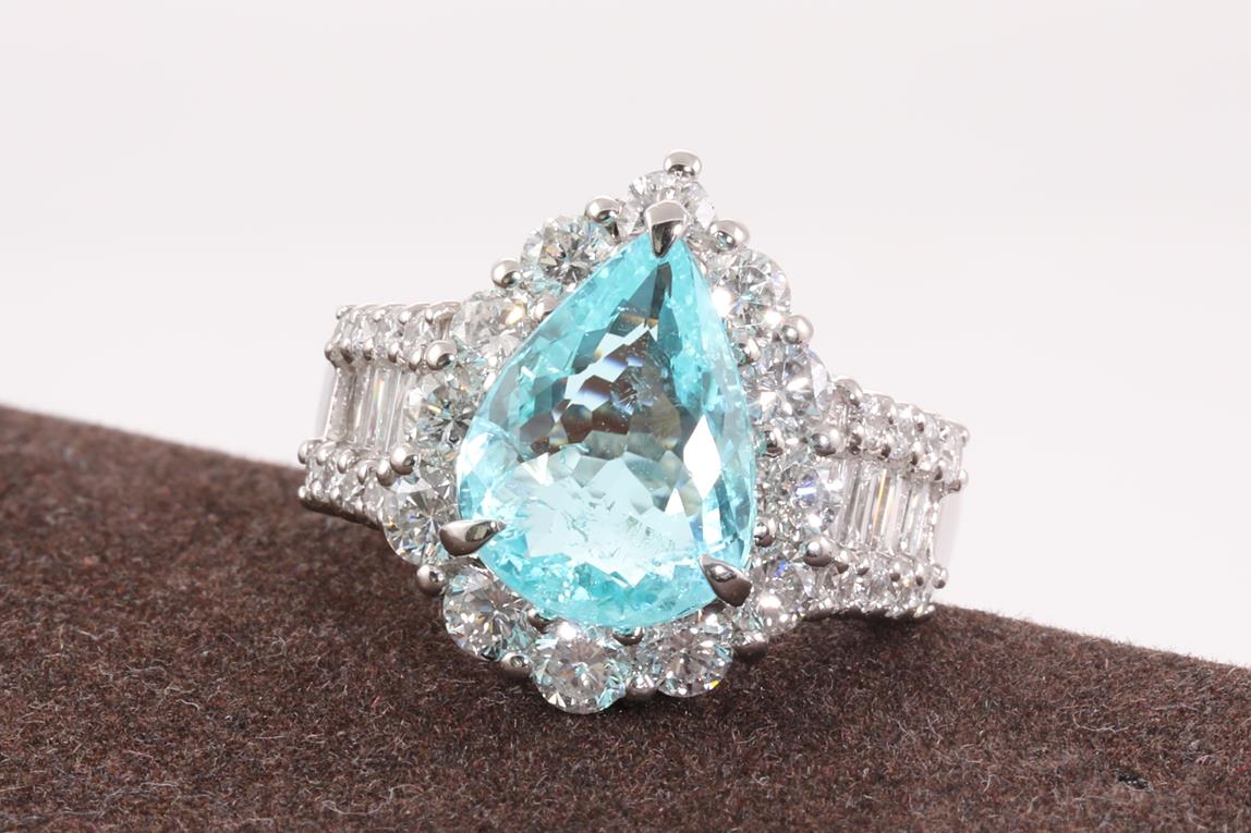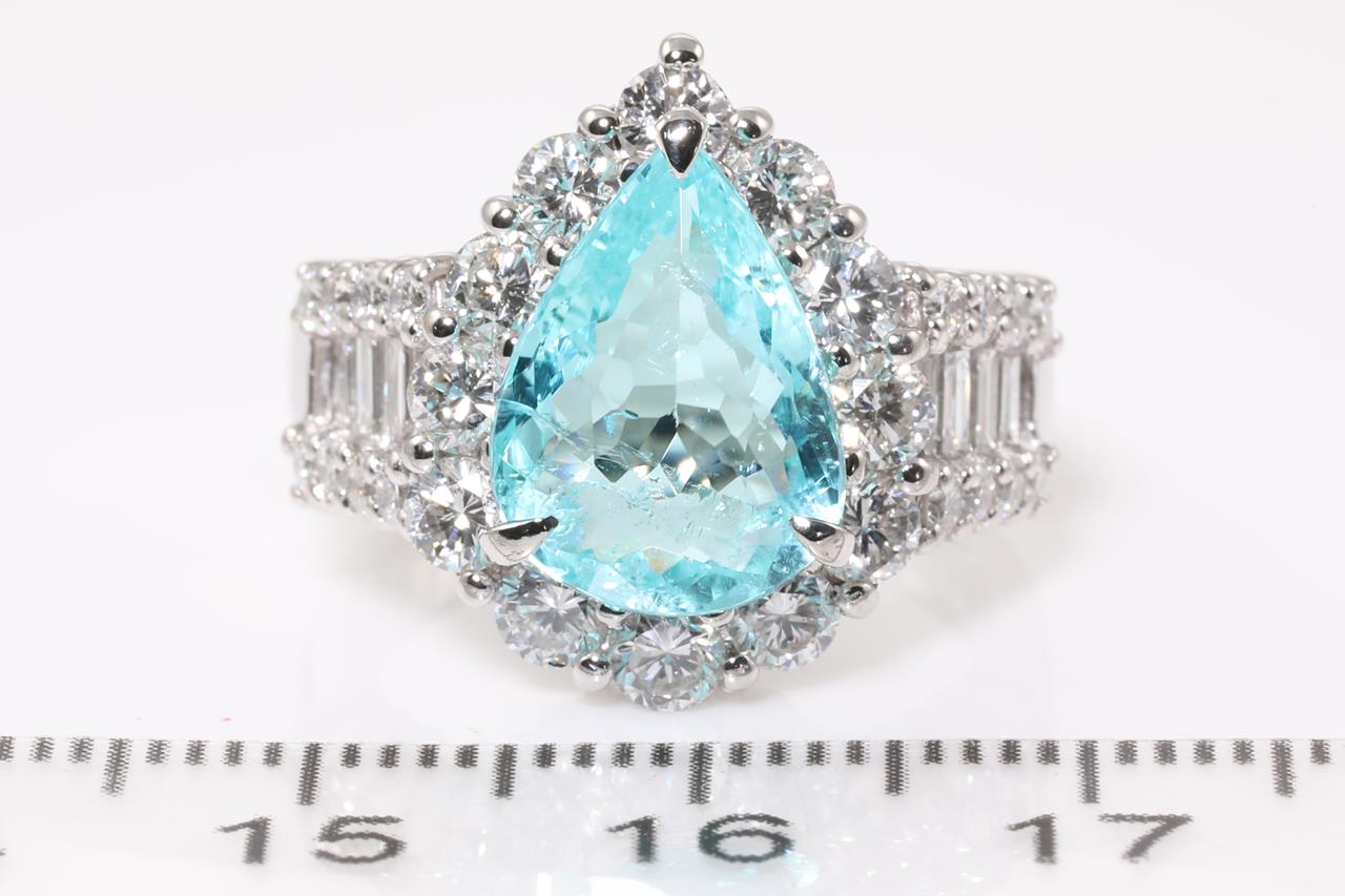 Tourmaline and Diamond ring with a pear shape Paraiba Tourmaline of 3.52ct and Diamonds totalling 2.03cts (Estimated grading: G-H SI). Platinum. Ring size L1/2 - cannot be resized up, down with ring clip. Weight: 12.8g. With certificate #414549. (Pre-owned)