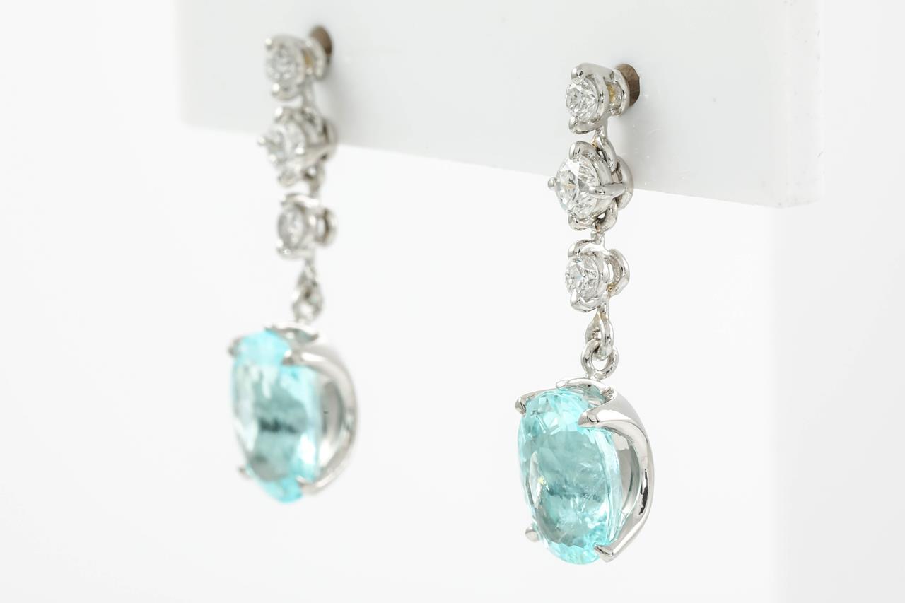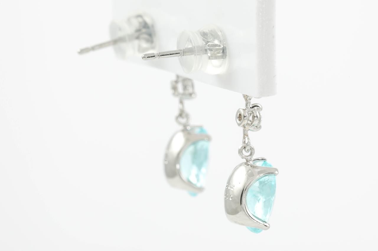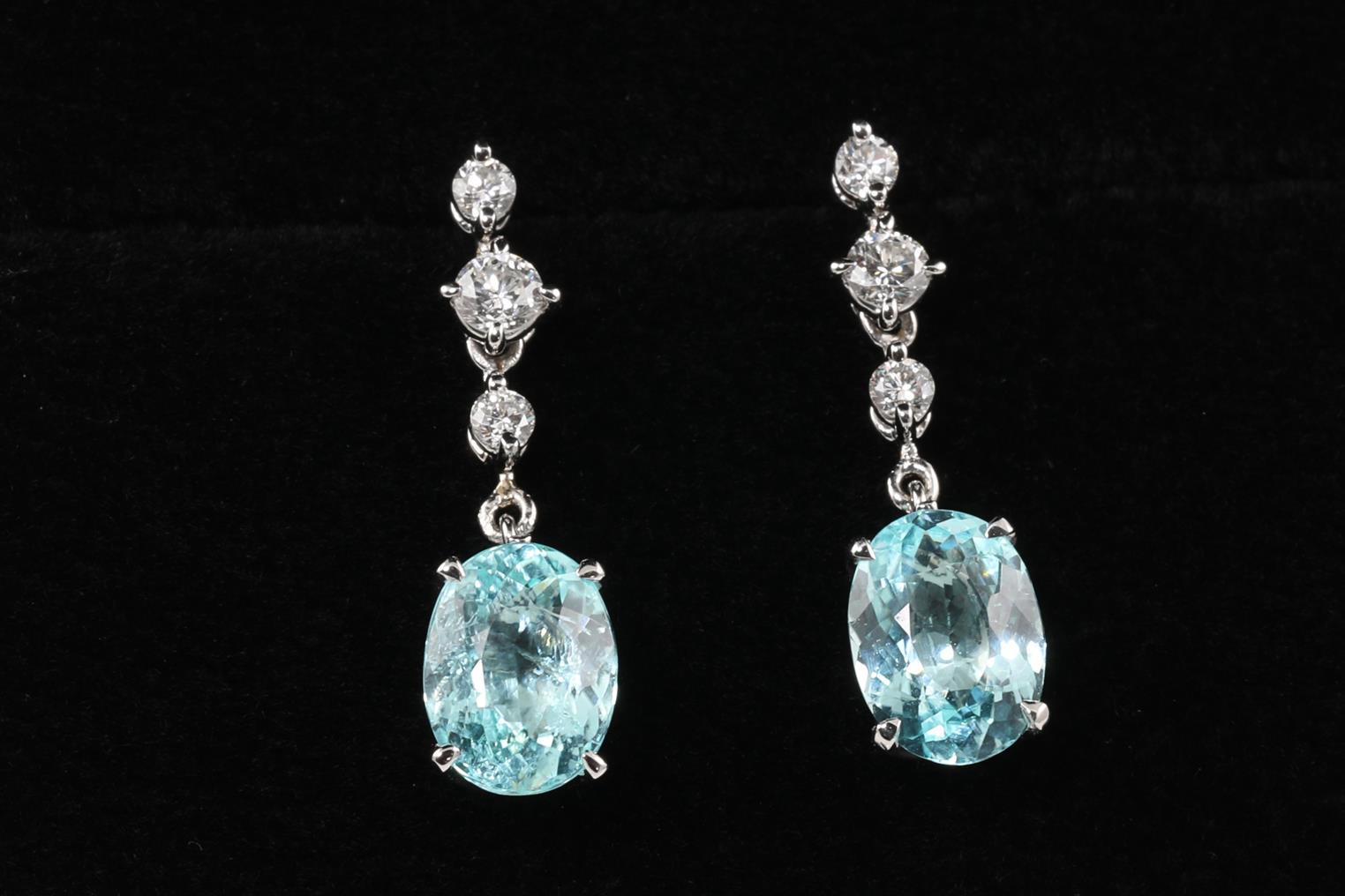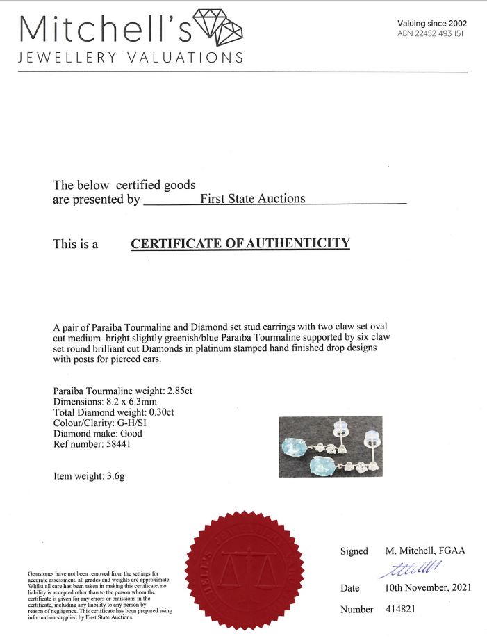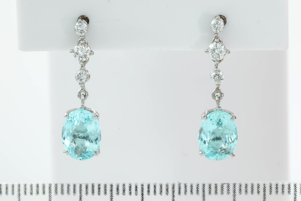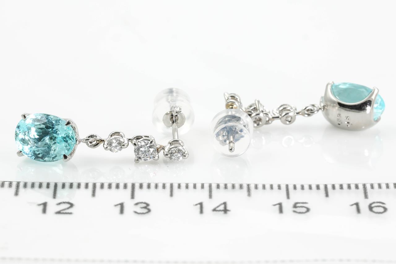 Tourmaline and Diamond Earrings with oval Paraiba Tourmaline totalling 2.85cts and Diamonds totalling 0.30cts (Estimated grading: G-H SI). Platinum. Weight: 3.6g. With certificate #414821. (Pre-owned)