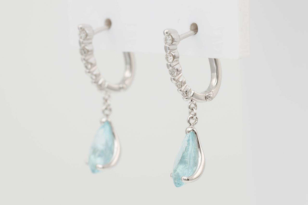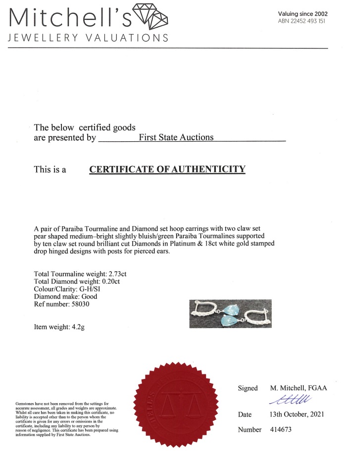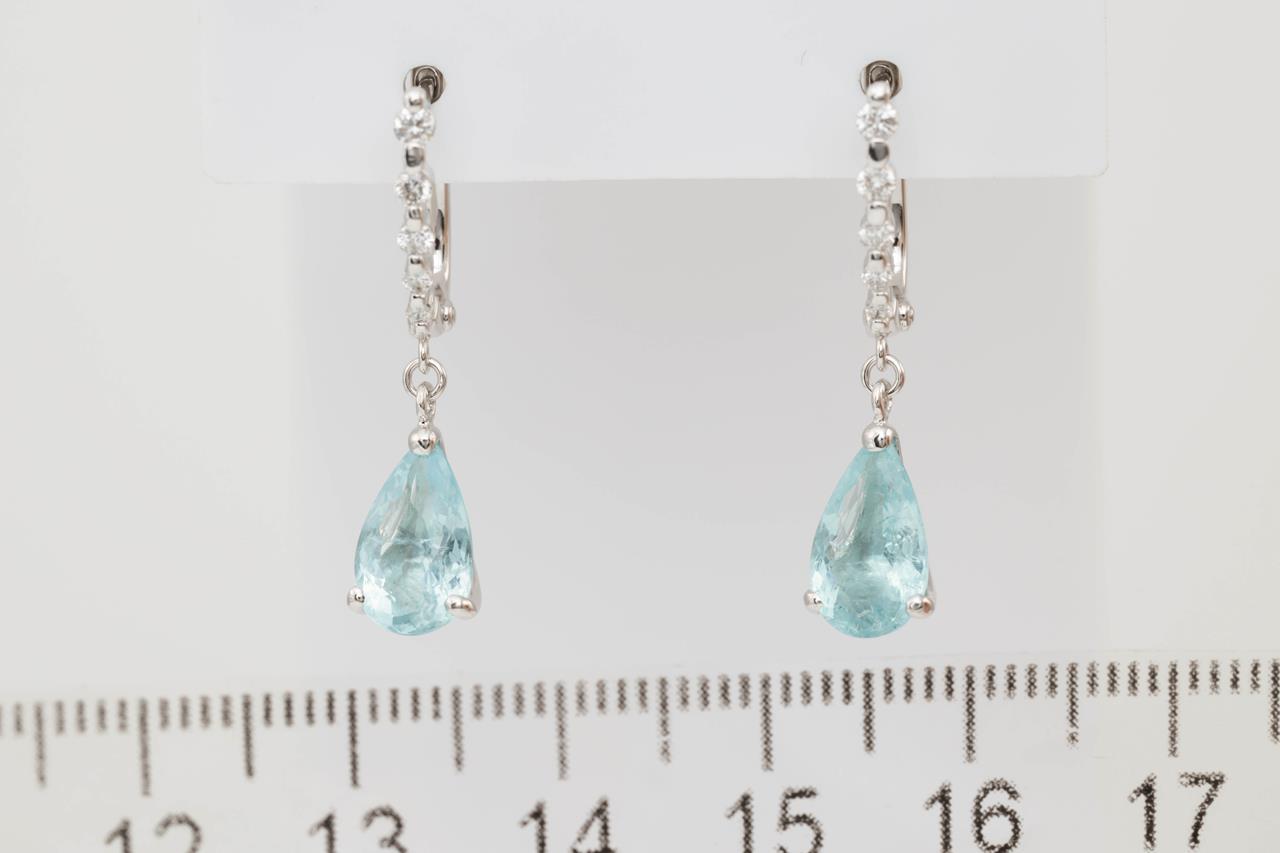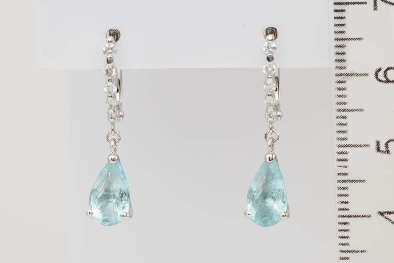 Tourmaline and Diamond earrings with pear shape Paraiba Tourmaline totalling 2.73cts and Diamonds totalling 0.20cts. 18ct white gold & platinum. Weight: 4.2g. With certificate #414673. (Pre-owned)