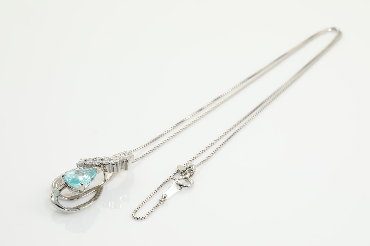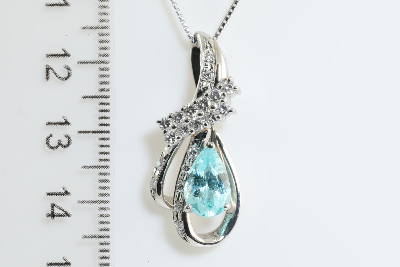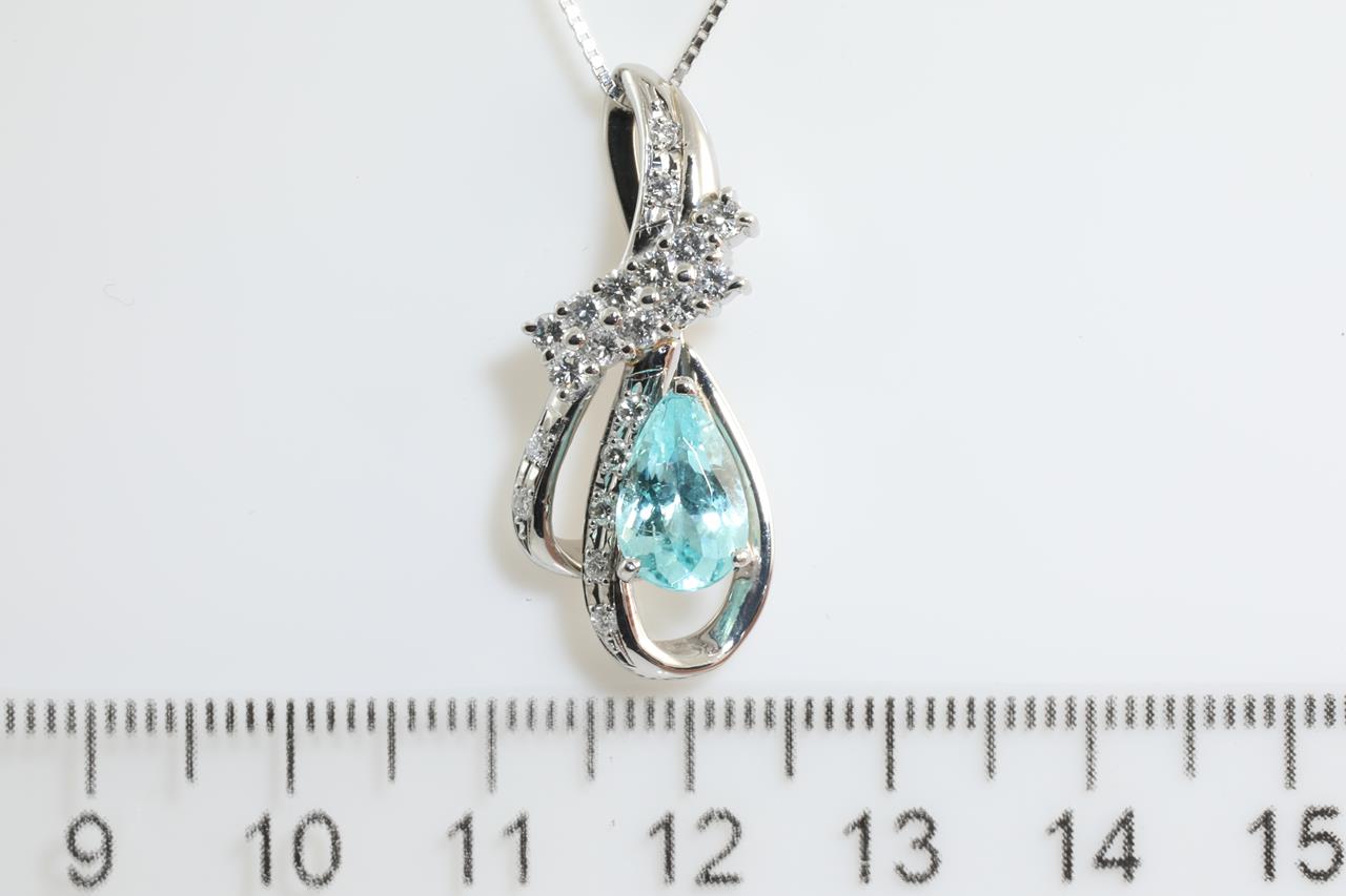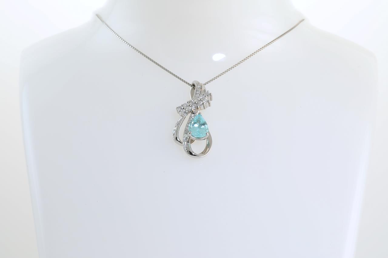 Tourmaline and Diamond pendant with a pear shape Paraiba Tourmaline of 1.57ct and Diamonds totalling 0.50cts (Estimated grading: GH SI). Platinum with adjustable 45cm chain. Weight 7.4g. With certificate #414105. (Pre-owned)