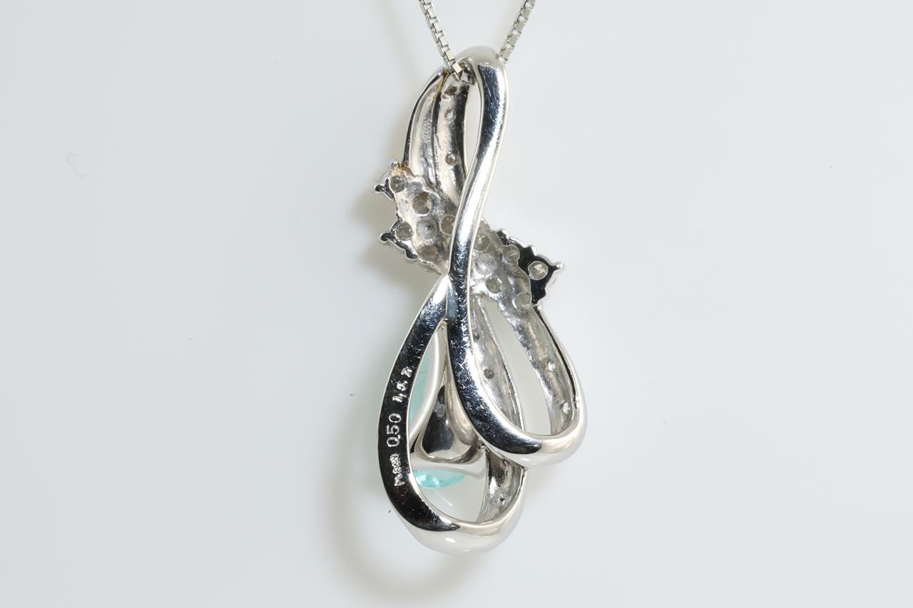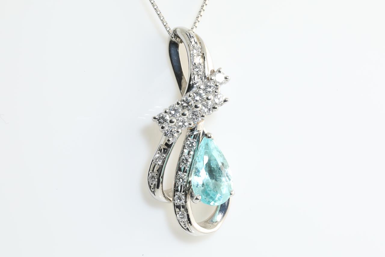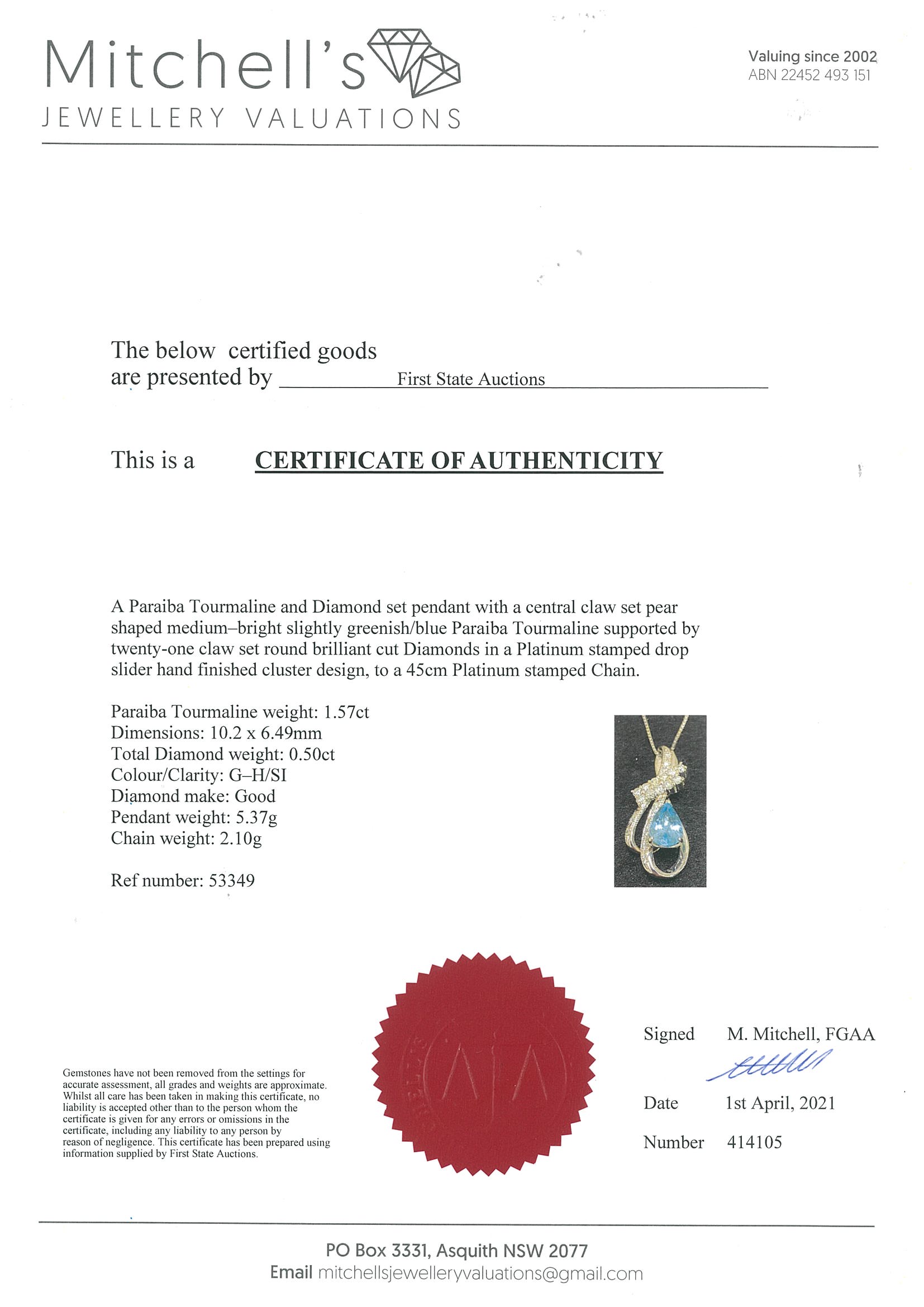 Tourmaline and Diamond pendant with a pear shape Paraiba Tourmaline of 1.57ct and Diamonds totalling 0.50cts (Estimated grading: GH SI). Platinum with adjustable 45cm chain. Weight 7.4g. With certificate #414105. (Pre-owned)