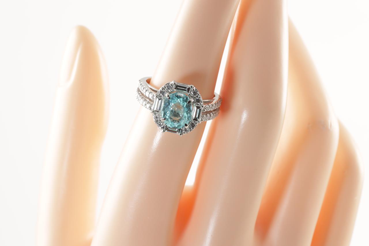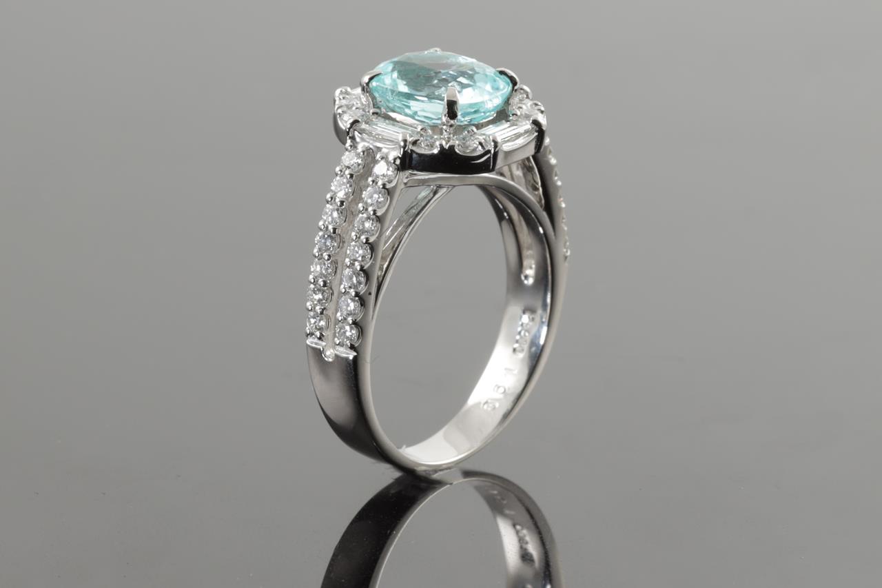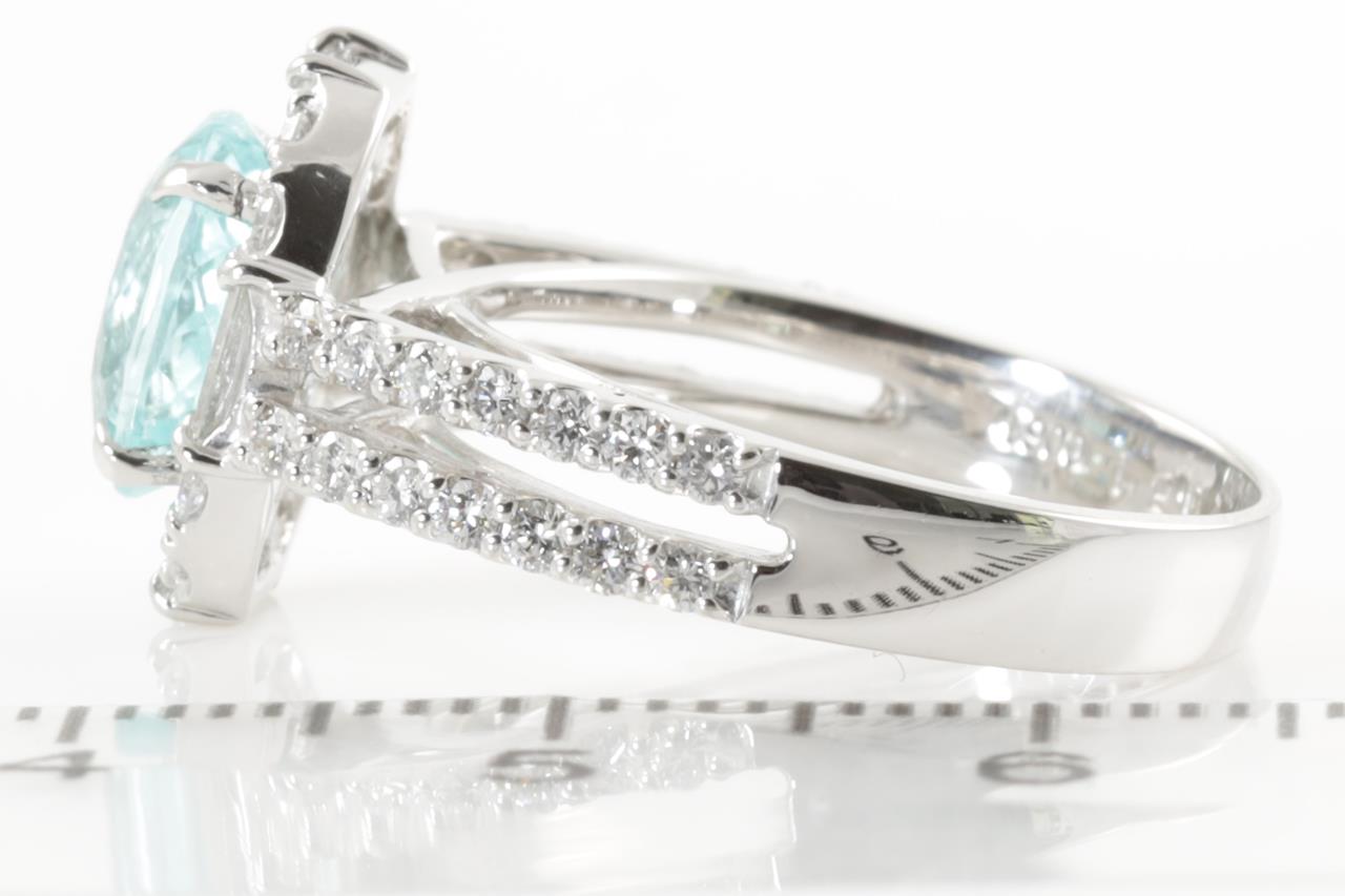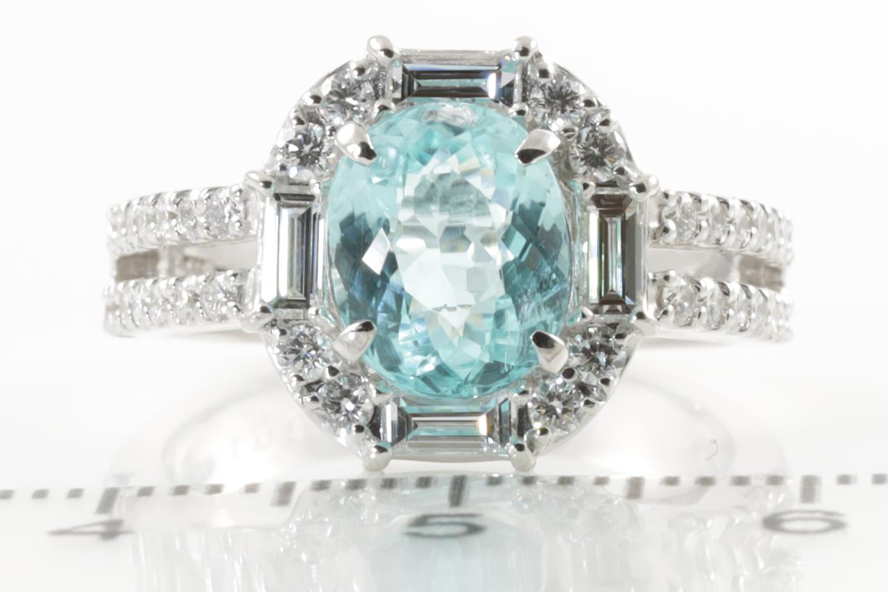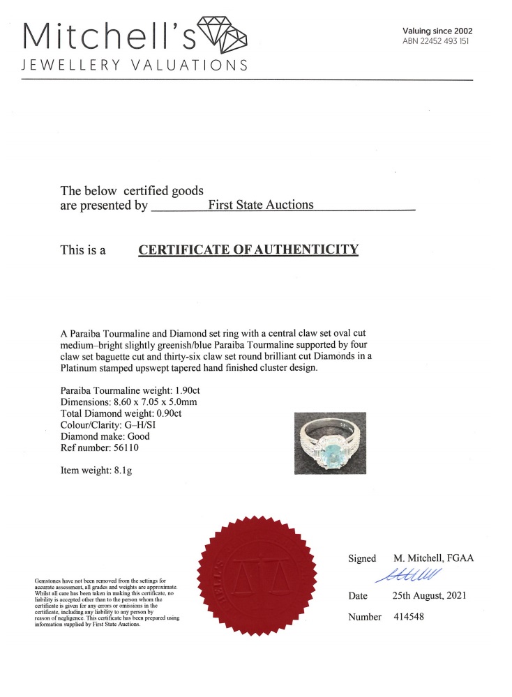 Tourmaline and Diamond ring with an oval Paraiba Tourmaline of 1.90ct and Diamonds totalling 0.90cts (Estimated grading: G-H SI). Platinum. Ring size L1/2- cannot be resized up, down with ring clip. With certificate #414548. Weight: 8.1g. (Pre-owned)