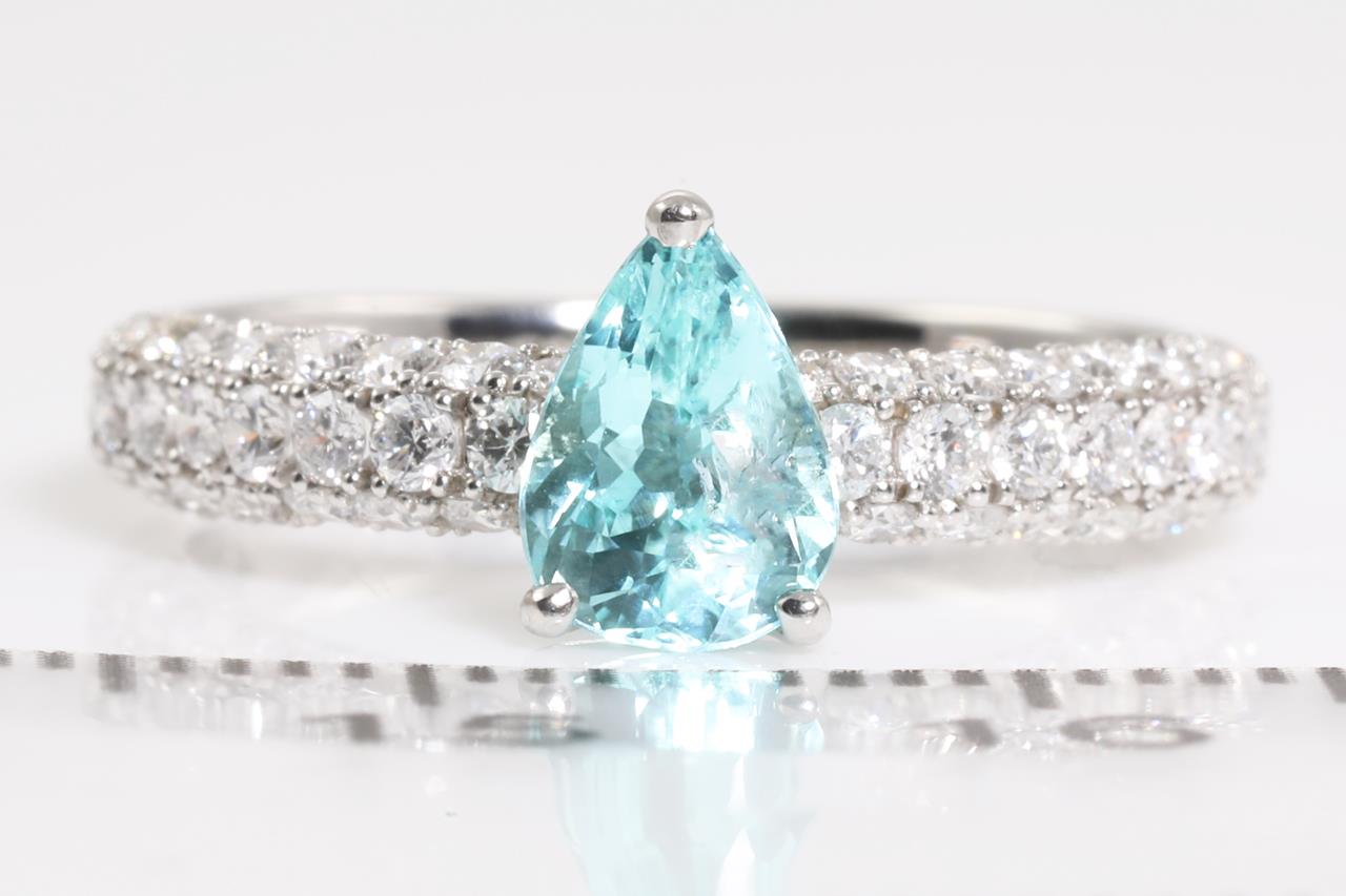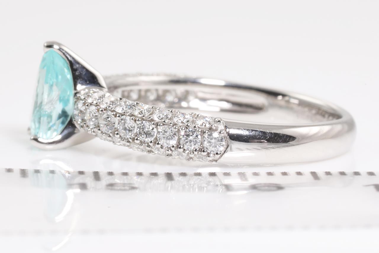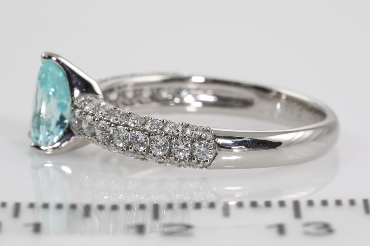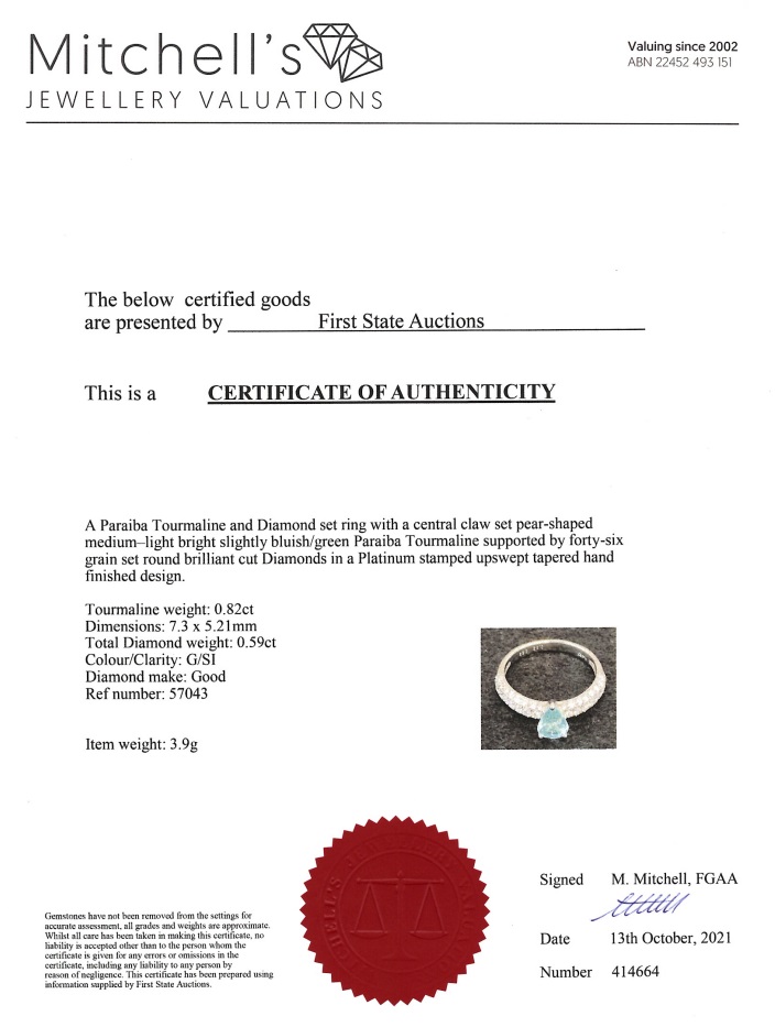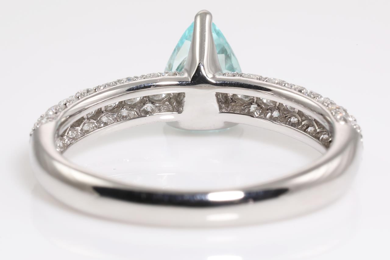 Tourmaline and Diamond ring with a pear shape Paraiba Tourmaline of 0.82ct and Diamonds totalling 0.59cts (Estimated grading: G SI). Platinum. Ring size L1/2 - cannot be resized up, down by ring clip only. Weight: 3.9g. With Certificate #414664. (Pre-owned)