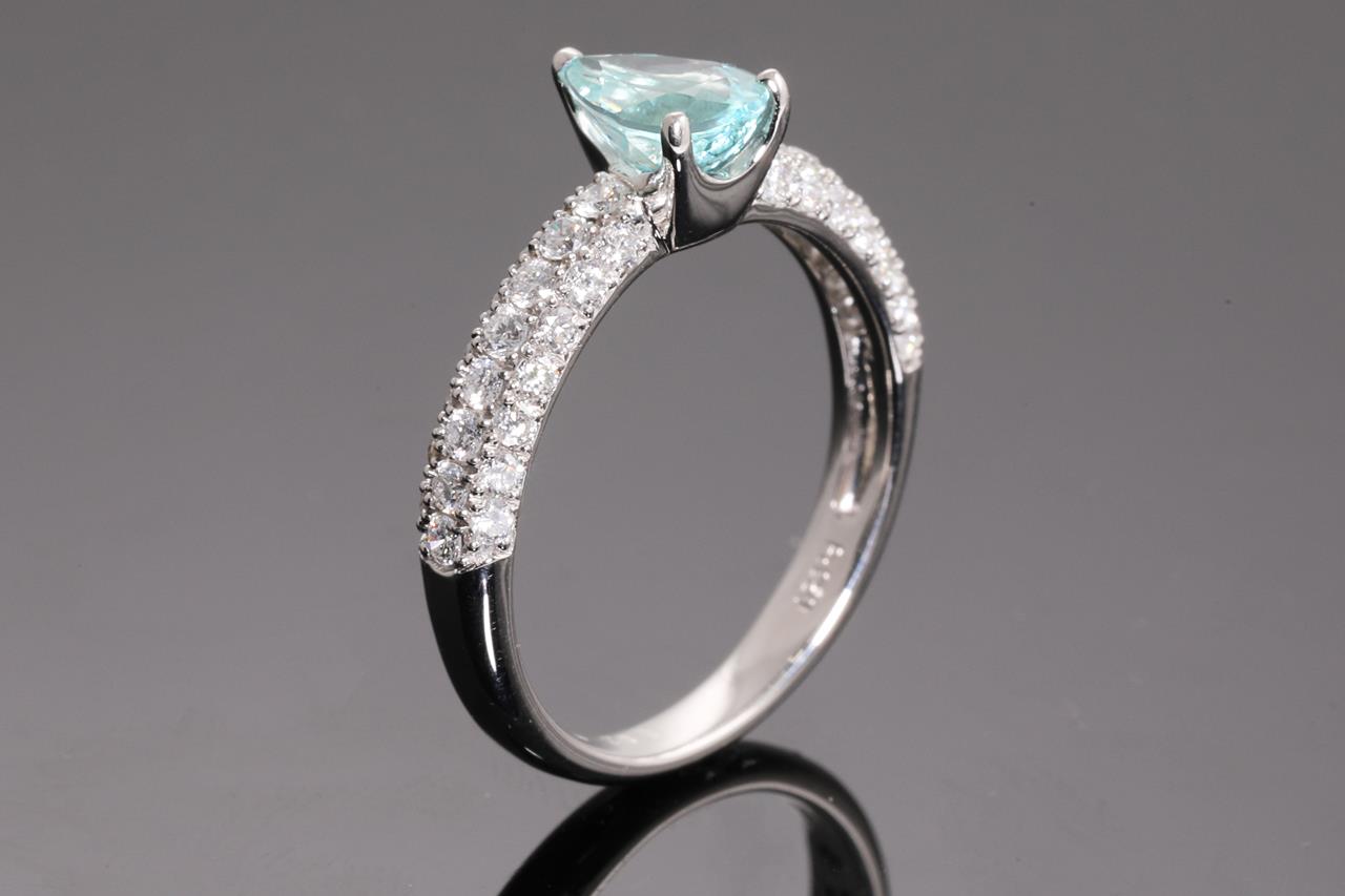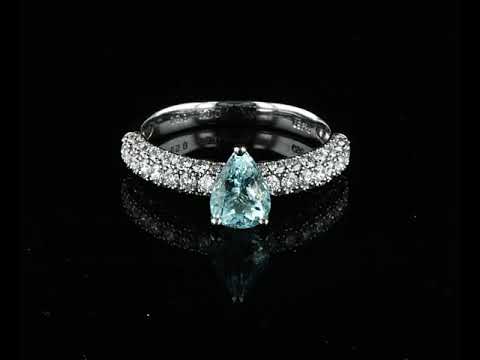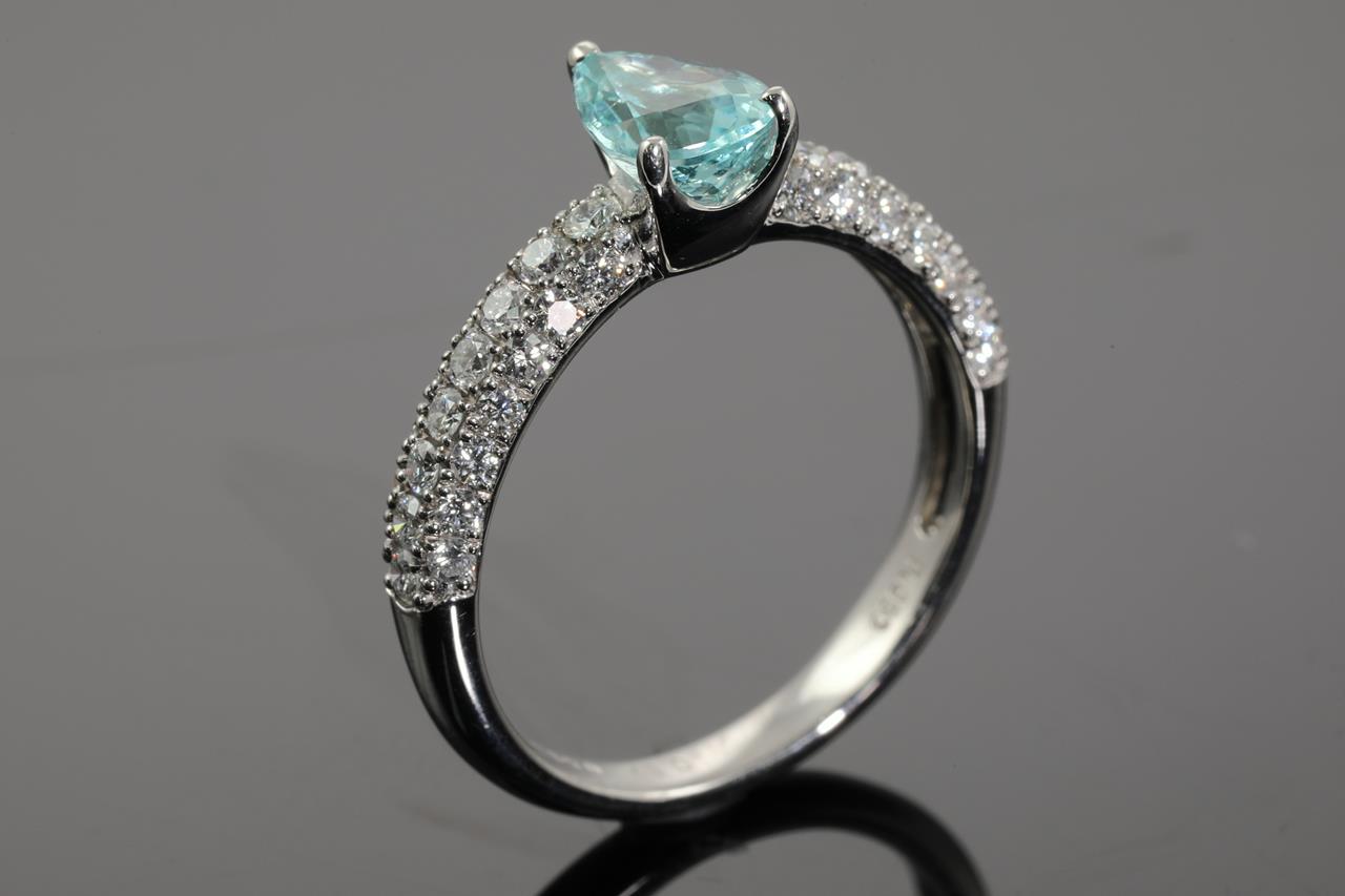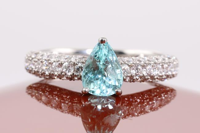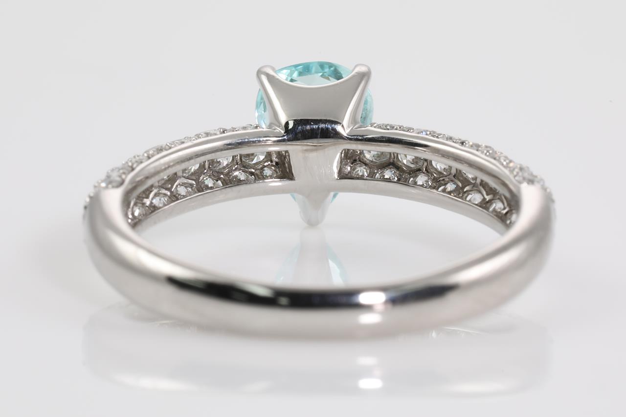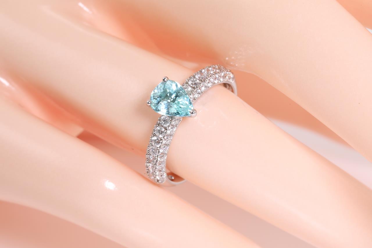 Tourmaline and Diamond ring with a pear shape Paraiba Tourmaline of 0.82ct and Diamonds totalling 0.59cts (Estimated grading: G SI). Platinum. Ring size L1/2 - cannot be resized up, down by ring clip only. Weight: 3.9g. With Certificate #414664. (Pre-owned)