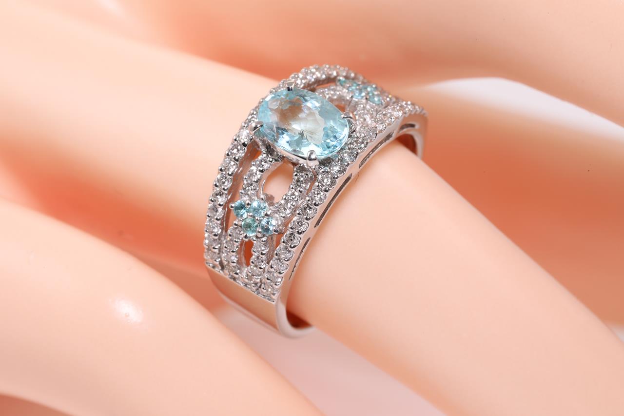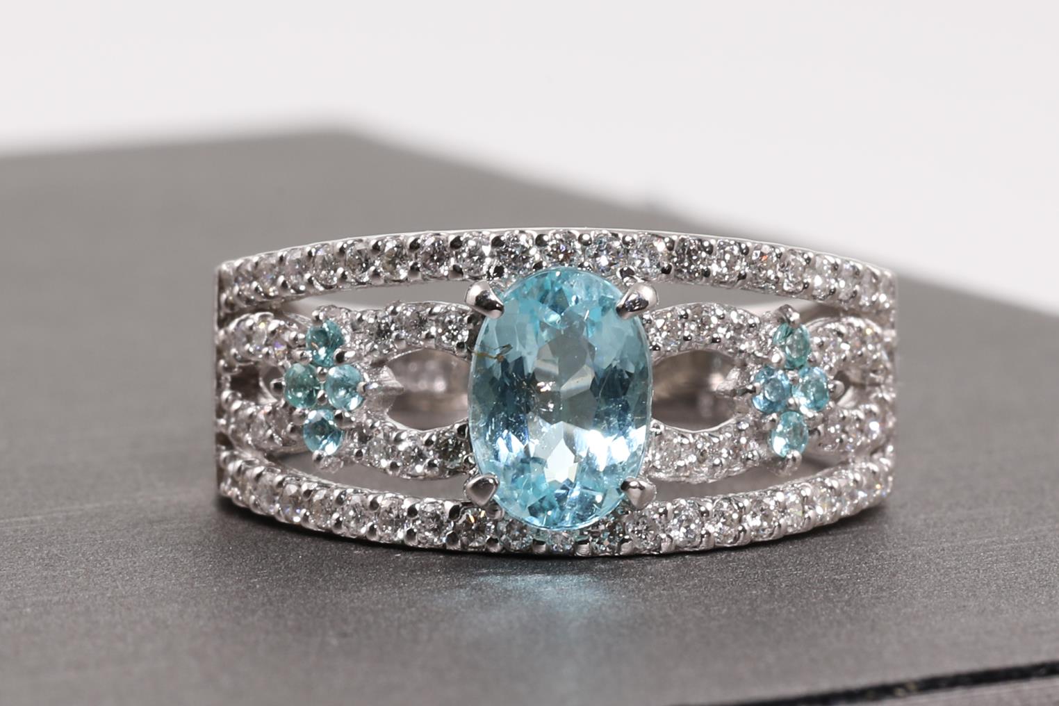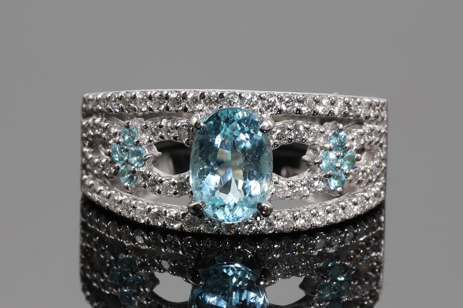 Tourmaline and Diamond ring with oval & round Paraiba Tourmaline totalling 0.97cts and Diamonds of 0.40cts (Estimated grading: G SI). Platinum. Ring size: L1/2 - cannot be resized up, down with ring clip. Weight: 5.9g. (Pre-owned)