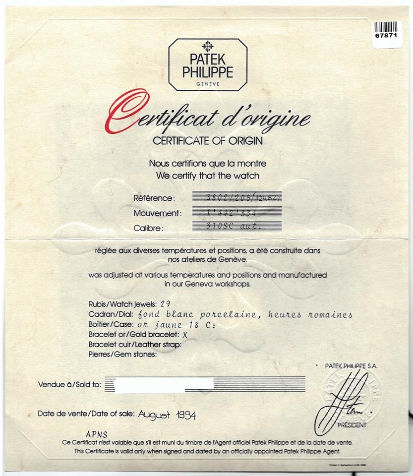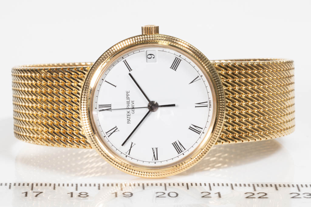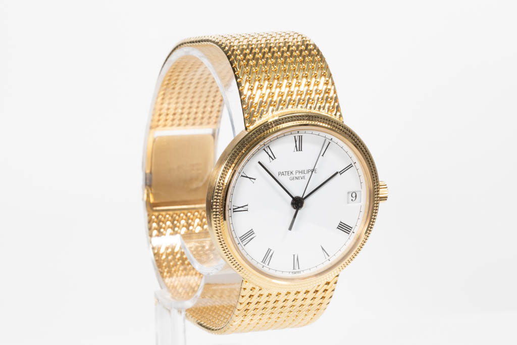Patek Philippe Calatrava 18ct yellow gold automatic mens watch. White dial, date, case diameter: 33mm, wrist size: 17.5cm, Swiss made. Ref# 3802/205. With Patek Philippe 18ct yellow gold bracelet and clasp. With Certificate of Authenticity, Patek Philippe Certificate of Origin and Patek Philippe box. 3 month FSA warranty. (Pre-owned)