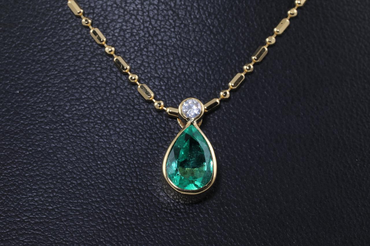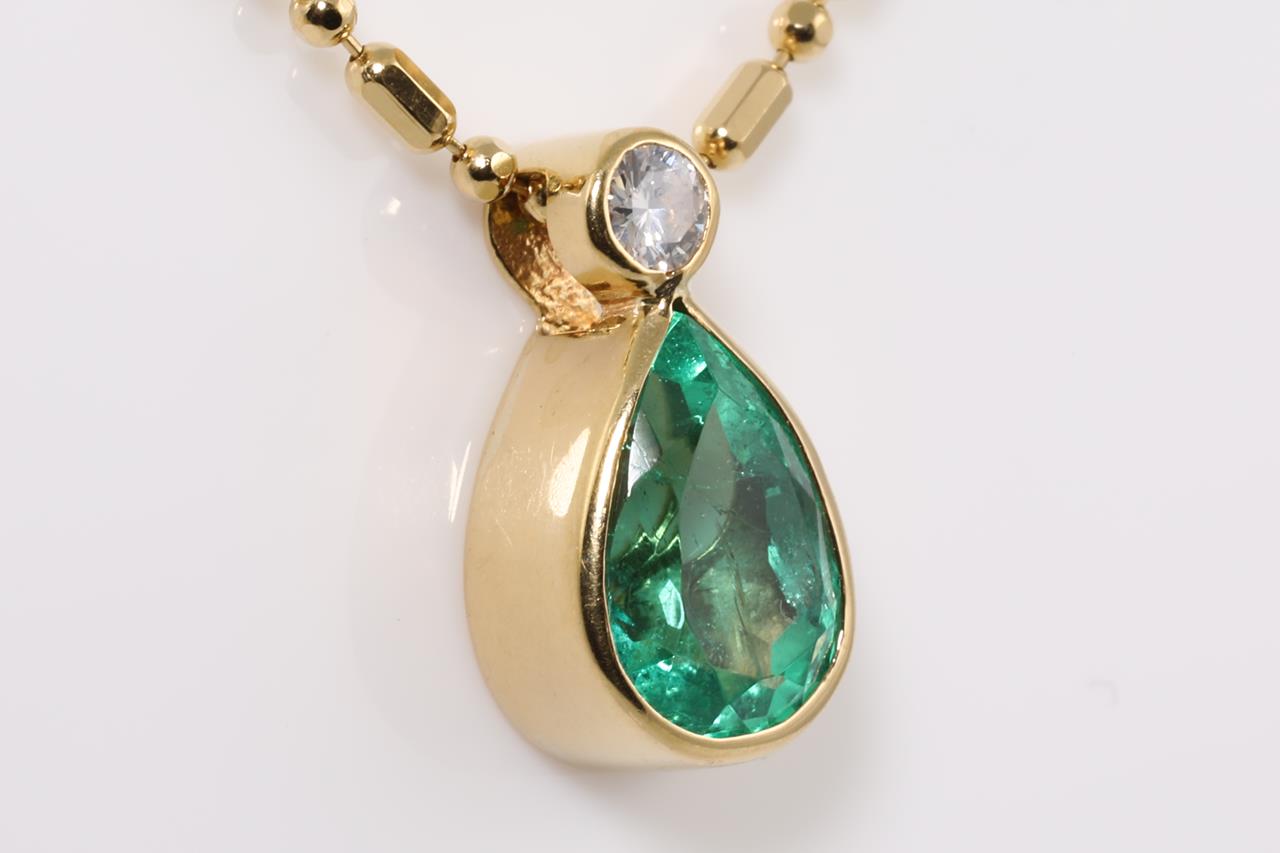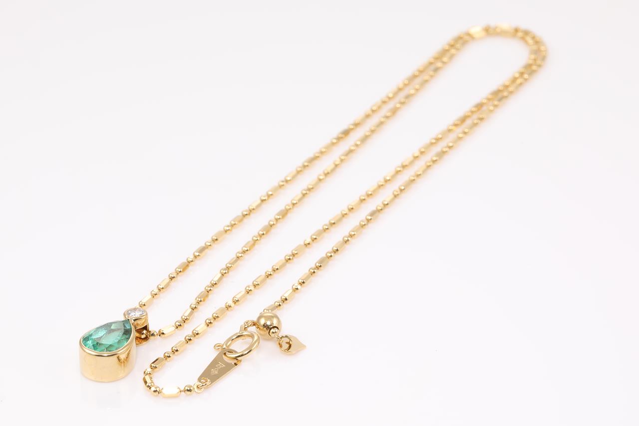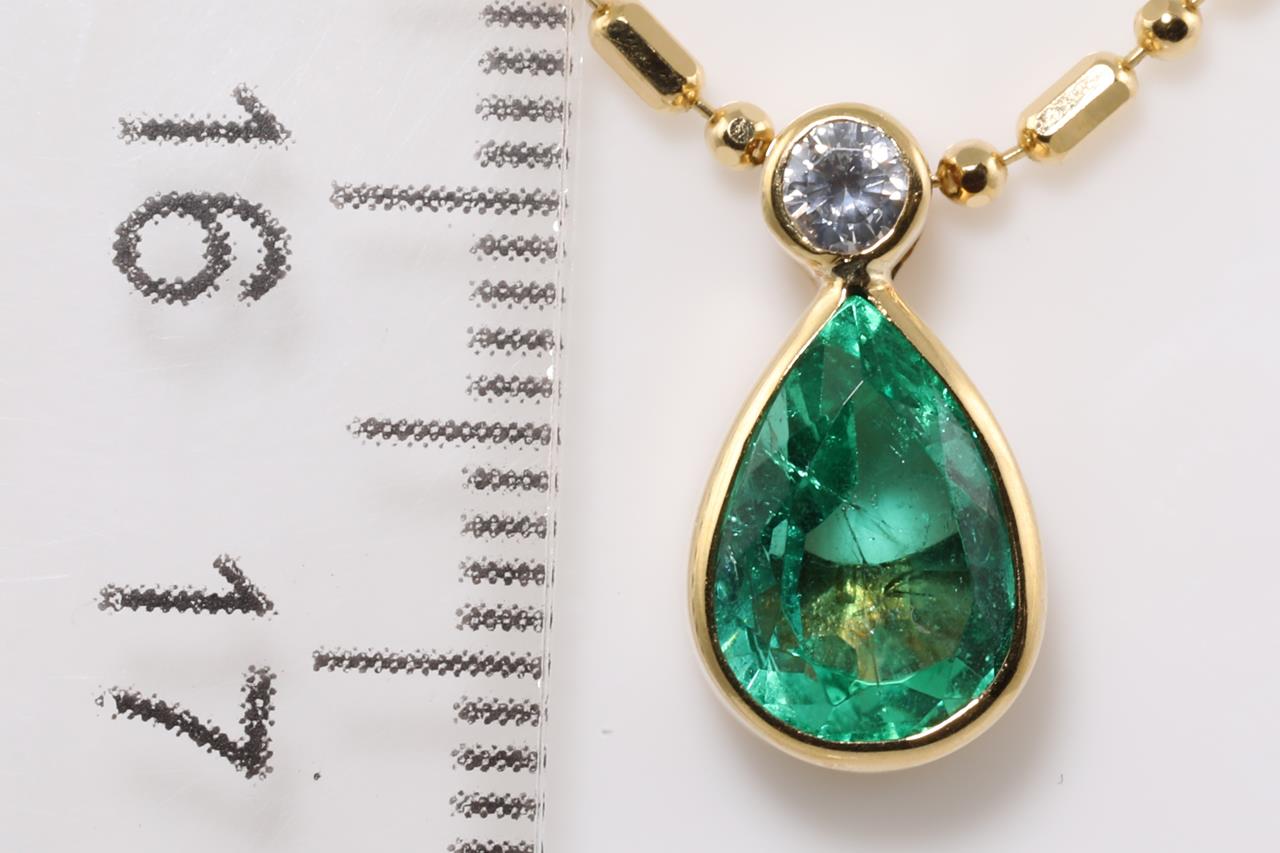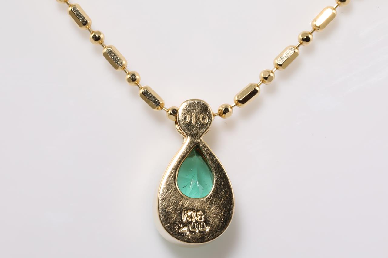 Emerald and Diamond Necklace with pear shape Emerald totalling 2.00cts and Diamond totalling 0.10cts. 18ct yellow gold with 18ct yellow gold adjustable chain. Length: 50cm. Weight: 6.5g. (Pre-owned)