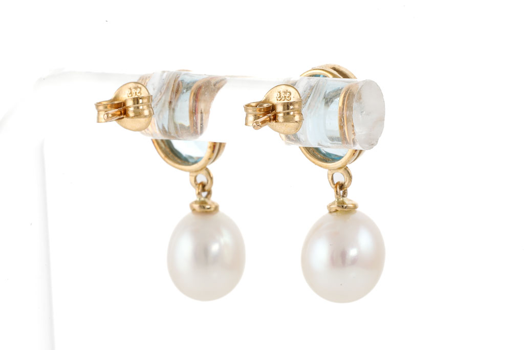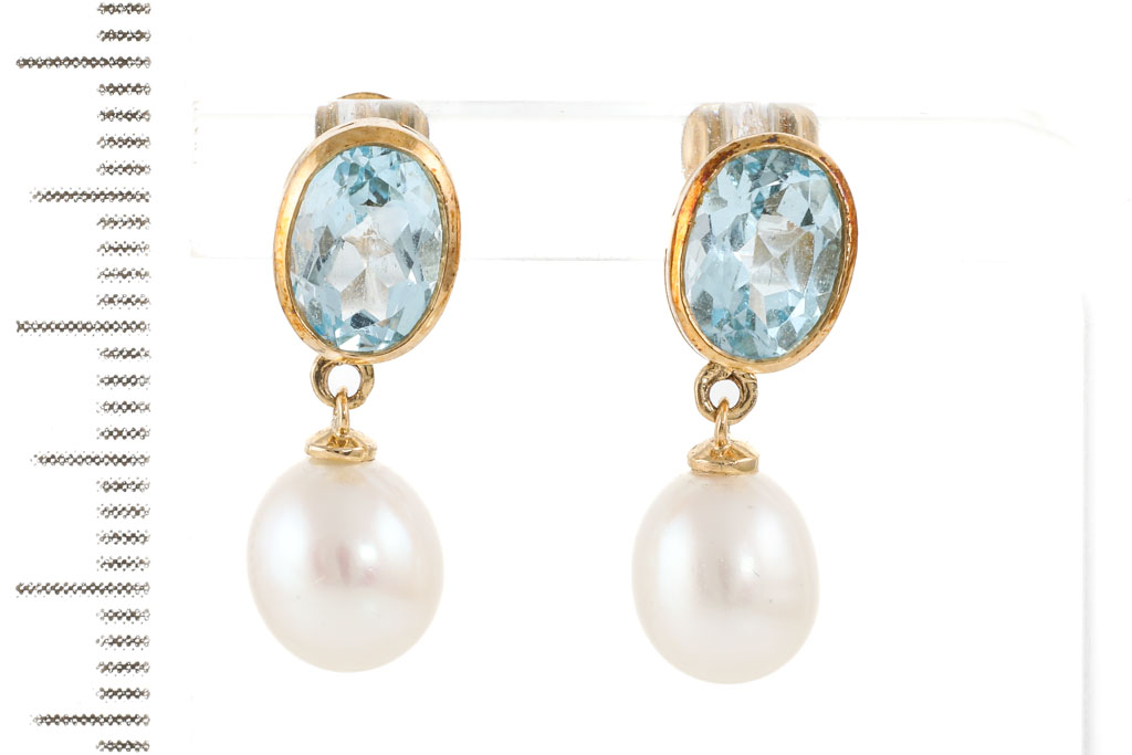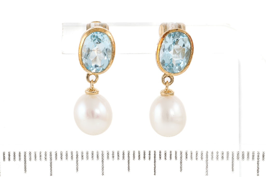 Pearl and Aquamarine earrings with oval shape cultured Pearls of 7mm and 2 oval shape Aquamarines totalling approximately 1.80cts. 9ct yellow gold. Weight: 3.1g. (Pre-owned)
