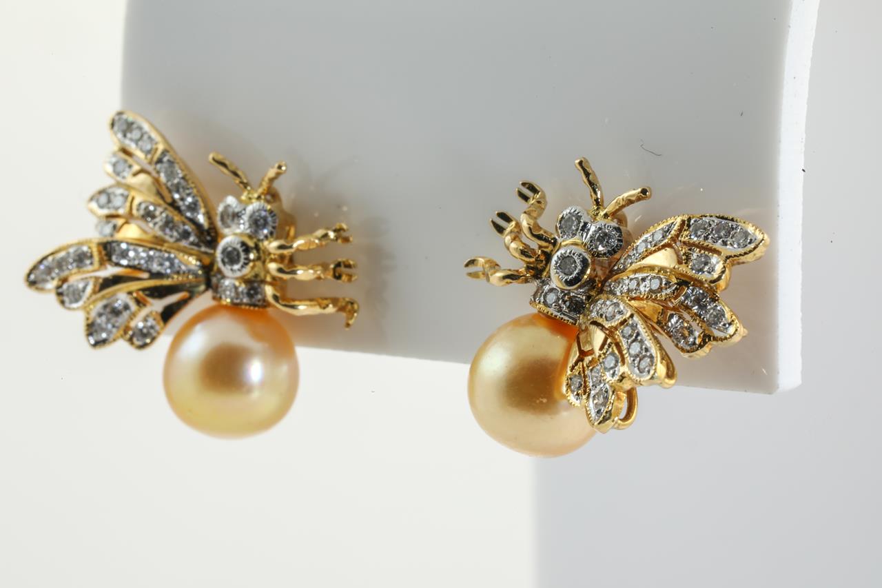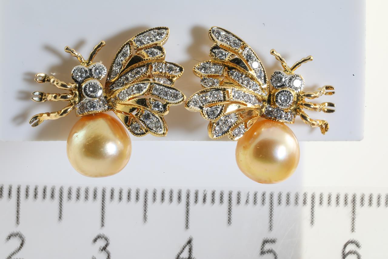 Pearl and Diamond bee design earrings with golden cultured Pearls of 7.7mm and Diamonds totalling approximately 0.50ct (Estimated grading: H SI). 18ct yellow gold. Weight: 7.5g (Pre-owned)