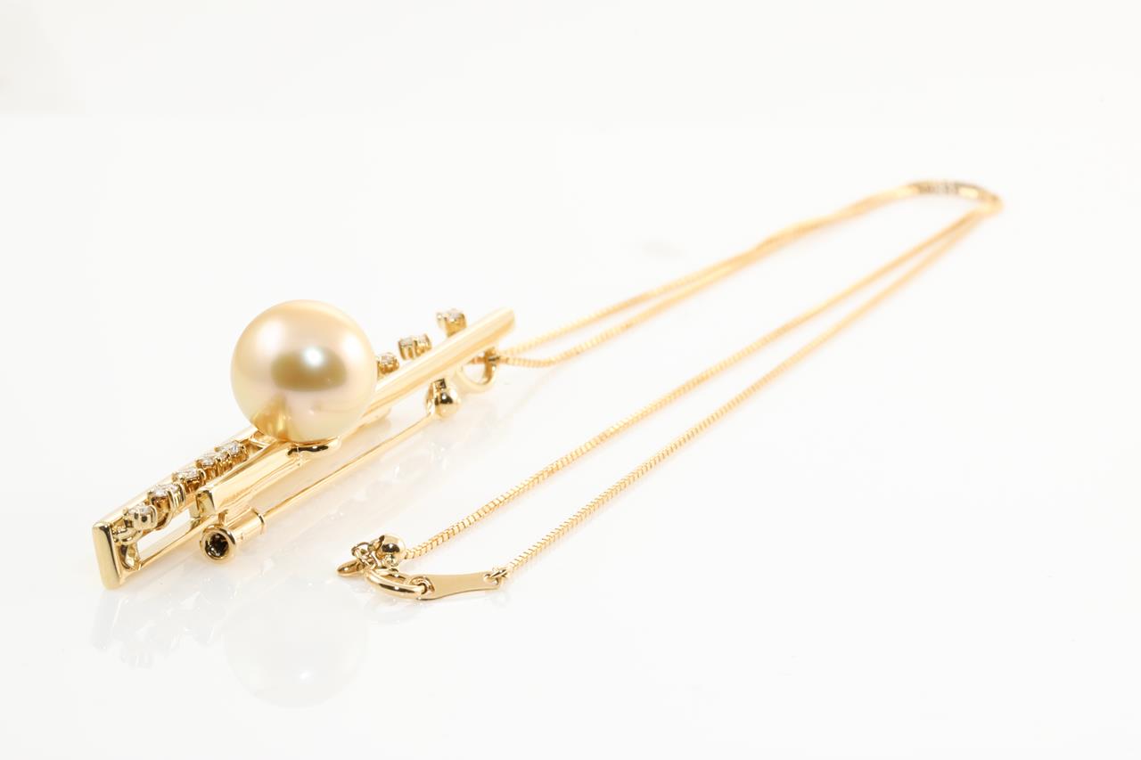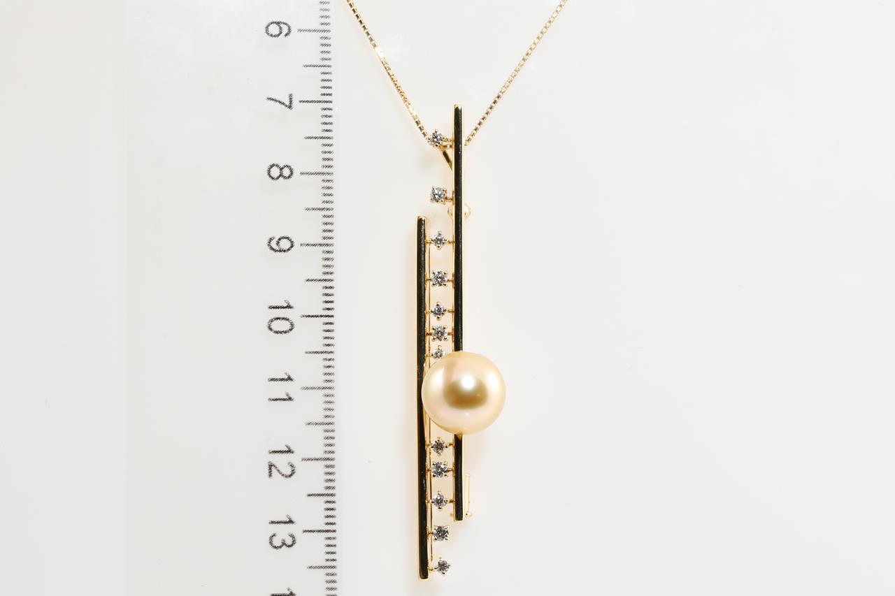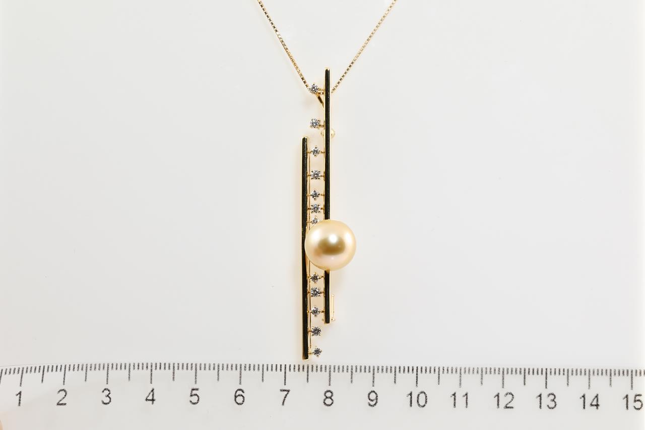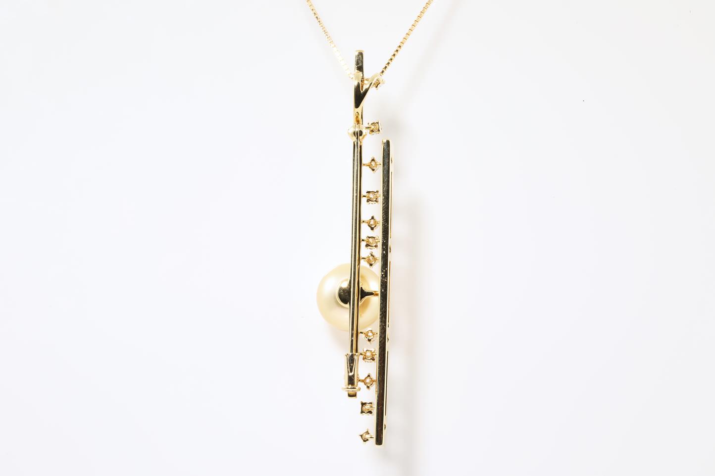 Pearl and Diamond brooch/pendant with Golden South Sea Pearl of 11.5mm and Diamonds totalling 0.32cts (Estimated grading: H-I VS-SI). 18ct yelow gold with 18ct yellow gold 44cm adjustable chain. Weight: 14.5g (Pre-owned)