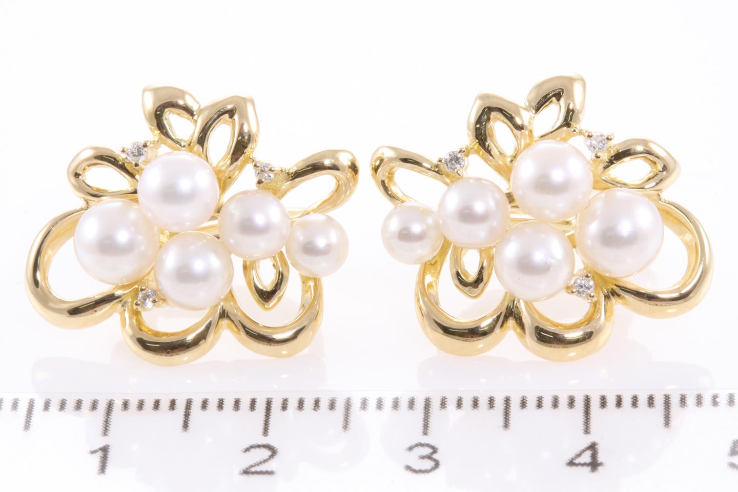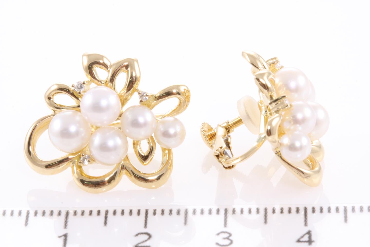 Pearl and Diamond hinged back clip on earrings with 10 Cultured Pearls (approx. 4mm-5mm) and 6 Round Diamonds totalling 0.06cts. 18ct yellow gold and silicon backs. Weight: 9.2g (Pre-owned)