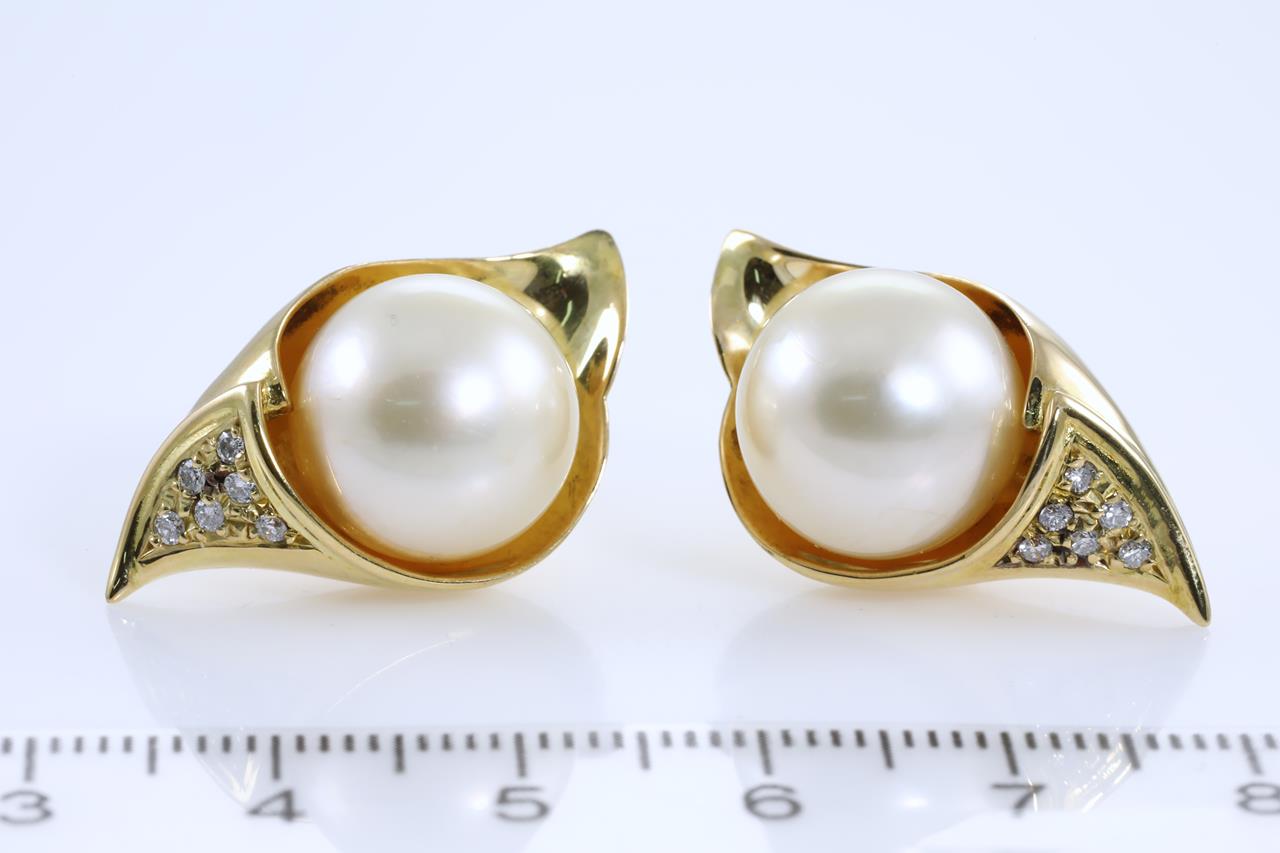 Pearl and Diamond earrings with light Golden South Sea Pearls of 12.7mm and Diamonds totalling 0.16cts. 18ct yellow gold (note some minor discolouration of metal) with gold & silicon backs. Weight: 16.6g. (Pre-owned)