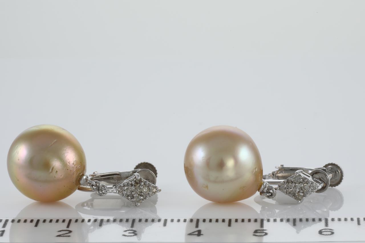 Pearl and Diamond screwback earrings with Golden South Sea Pearl of 12.5mm and Diamonds totalling 0.10cts. 14ct white gold. Weight: 8.2g. (New)