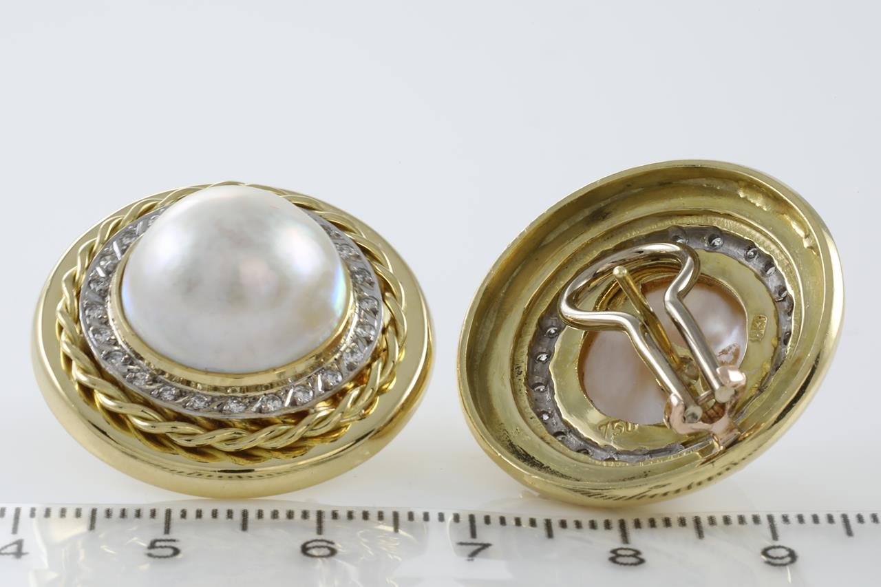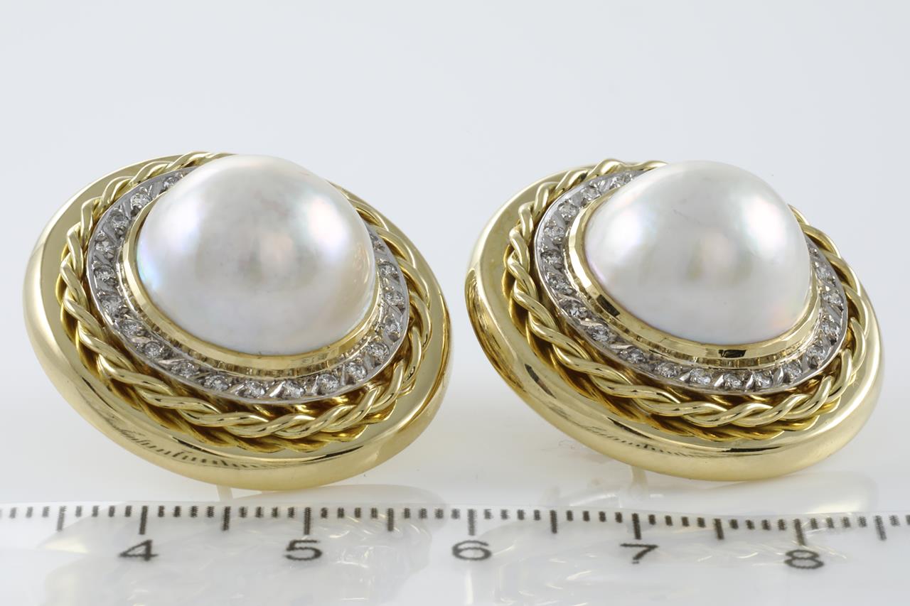 Pearl and Diamond clip-on earrings with Mabe Pearl and Diamonds totalling 0.50cts (Estimated grading: G-H SI). 18ct yellow gold. Weight: 31.0g (Pre-owned)