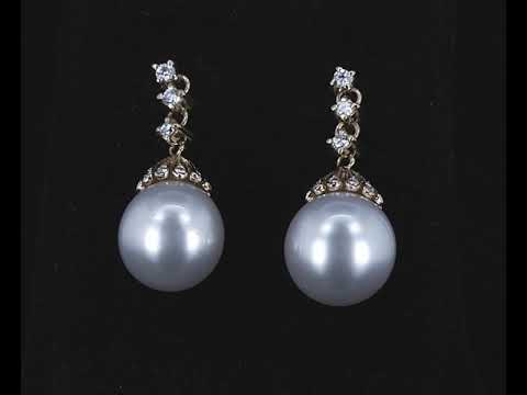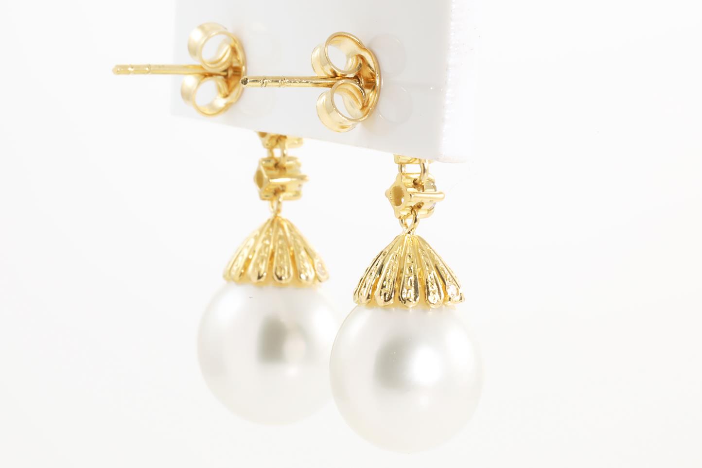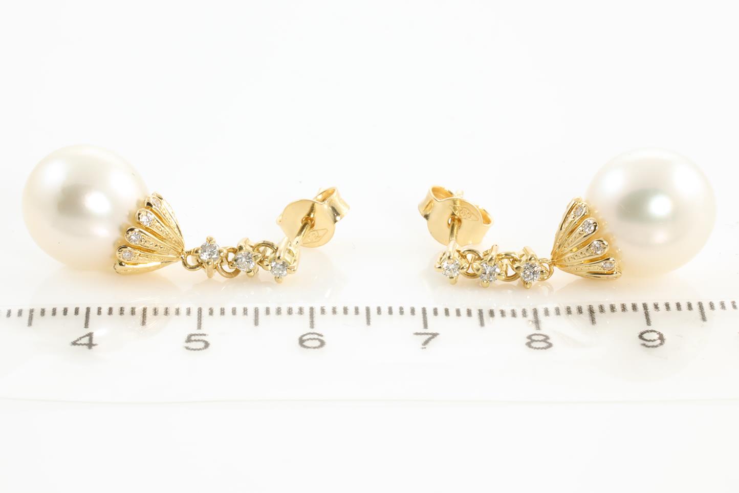 Pearl and Diamond earring with South Sea Pearls of 11.8mm and round Diamonds totalling approximately 0.18cts. 18ct yellow gold. Weight: 8.4g (As New)