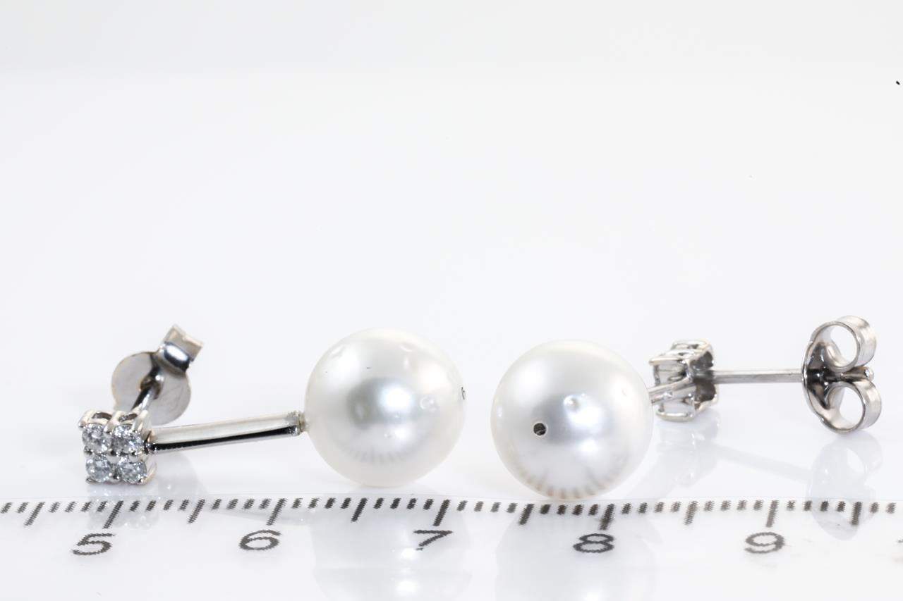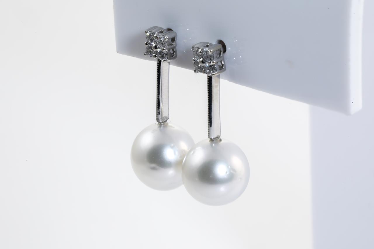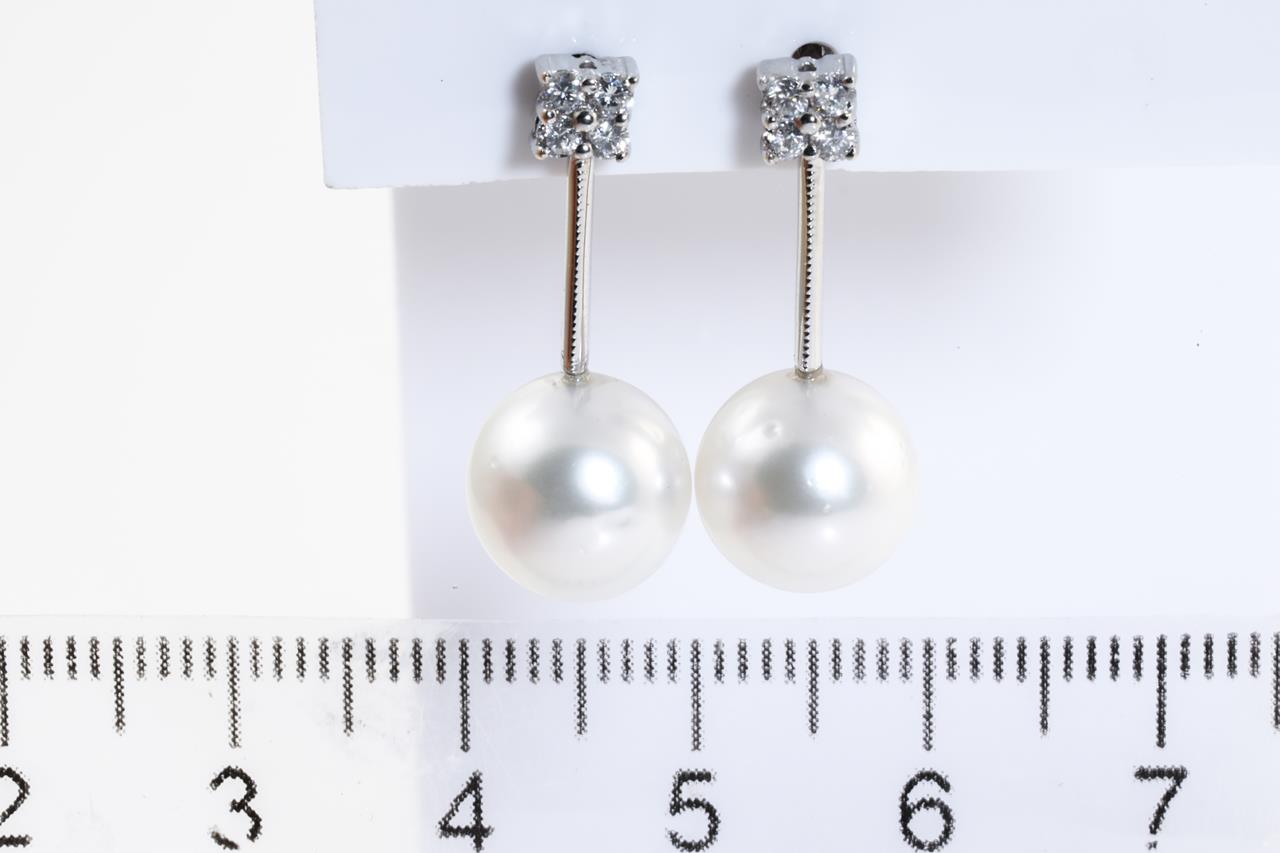 Pearl and Diamond Earrings with South Sea Pearls of 9.7mm and round Diamonds totalling 0.24cts. 18ct white gold. Weight: 4.8g (Pre-owned)