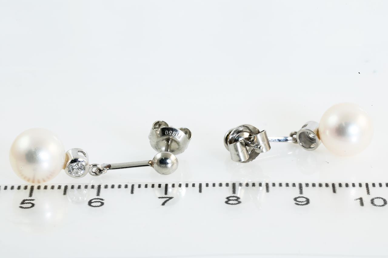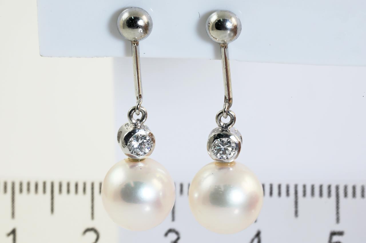 Pearl and Diamond earrings with Akoya pearls of 8.5mm and Diamonds totalling 0.16cts. Platinum. Weight: 3.7g. (Pre-owned)