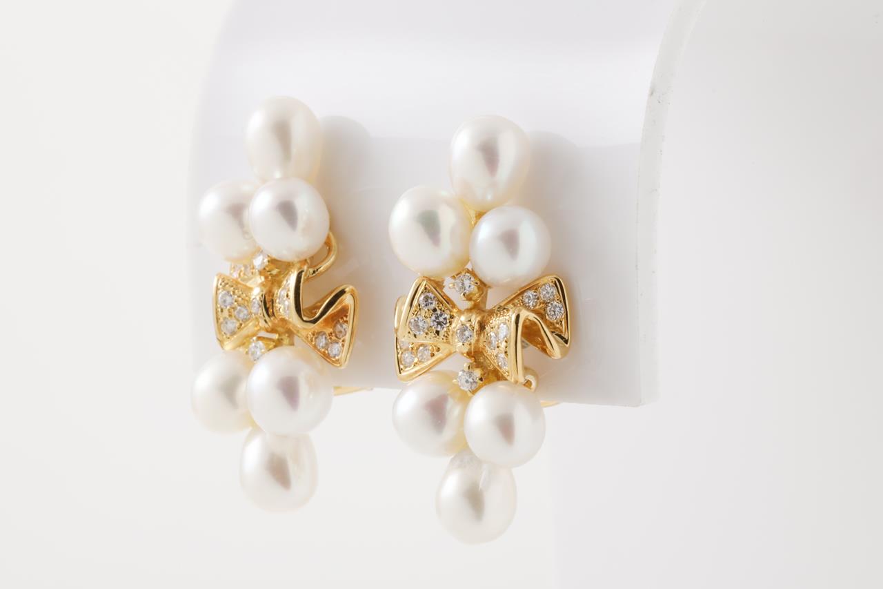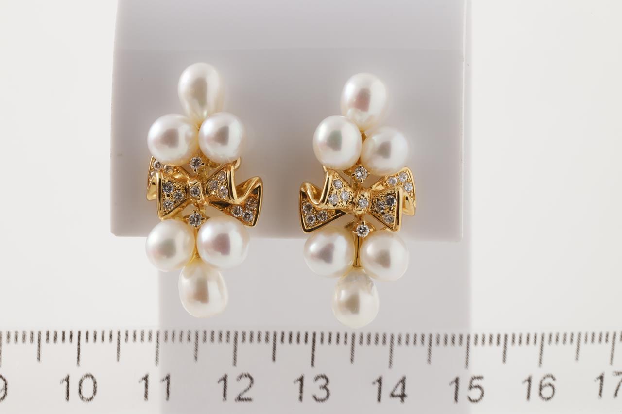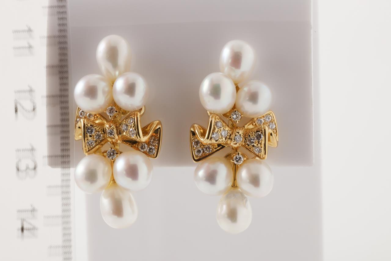 Pearl and Diamond earrings with cultured pearls of 6mm and Diamonds totalling 0.36cts (Estimated grading: G VS-SI). 18ct yellow gold. Weight: 11.6g (Pre-owed)