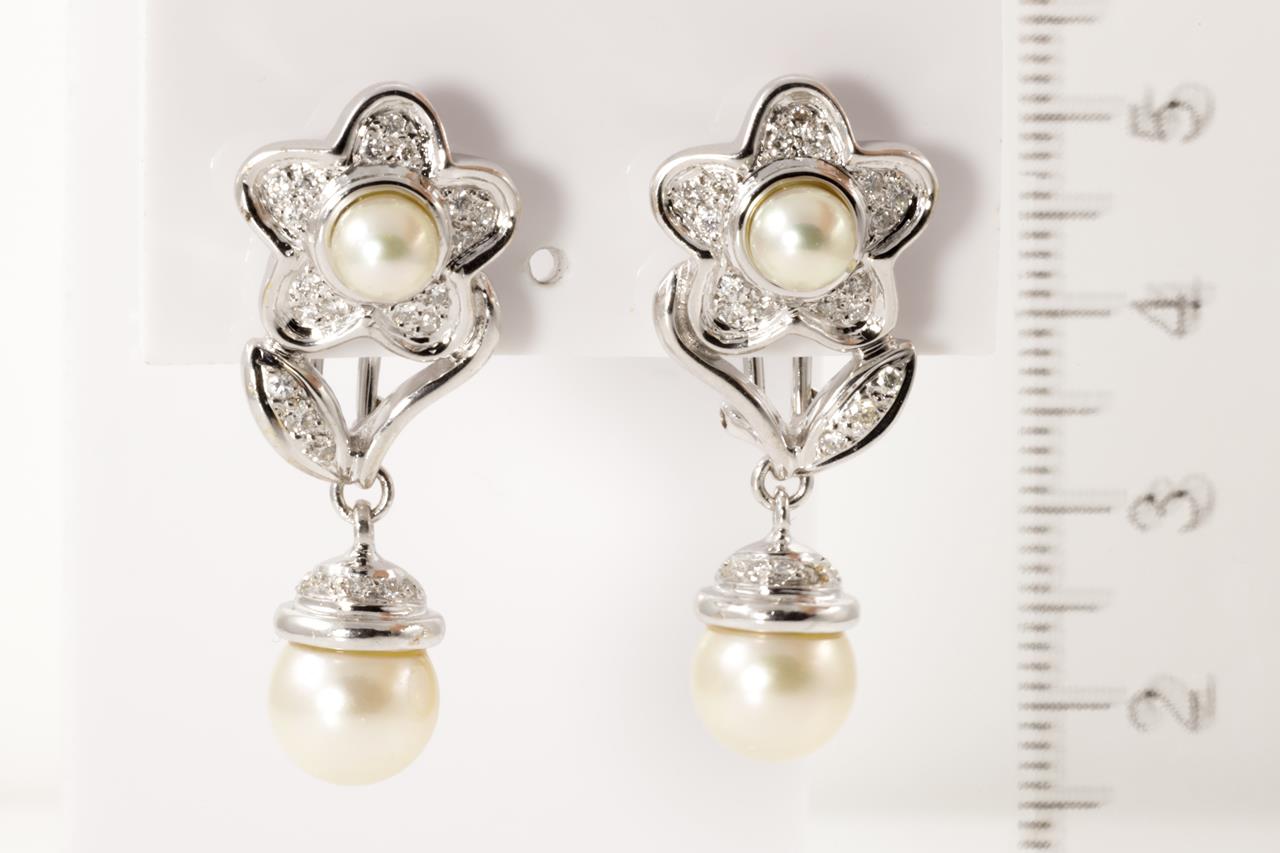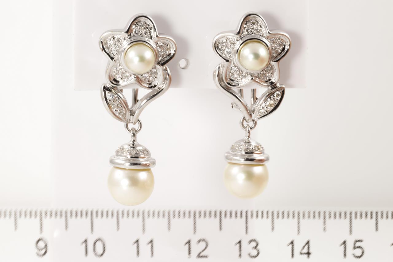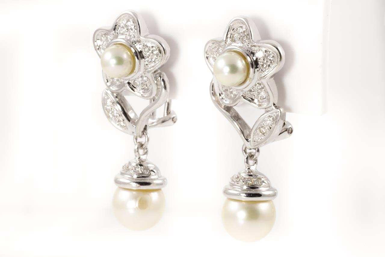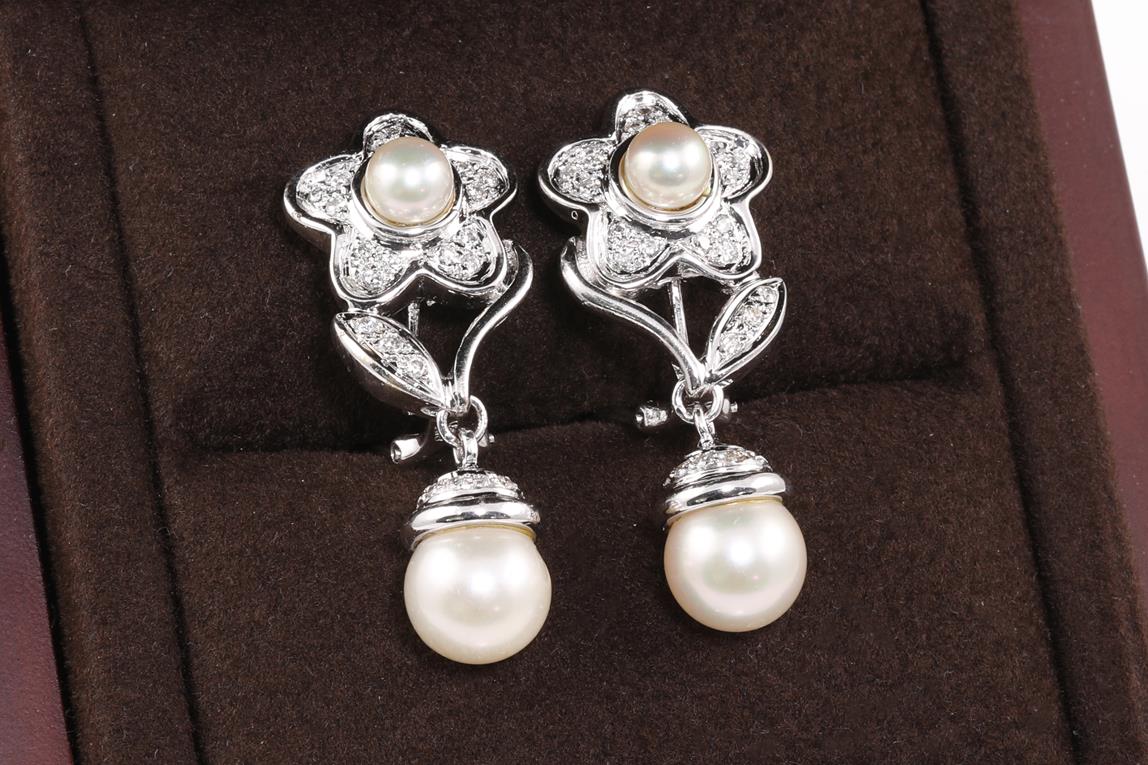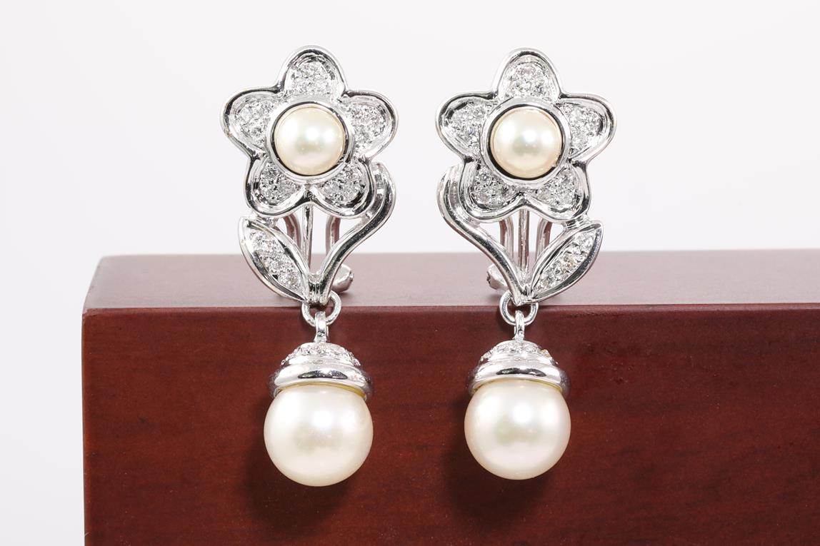 Pearl and Diamond flower design earrings with cultured Pearls of 5.4mm - 8.8mm and Diamonds totalling 0.50cts (Estimated grading: G-H SI). 18ct white gold. Weight: 14.4g (Pre-owned)