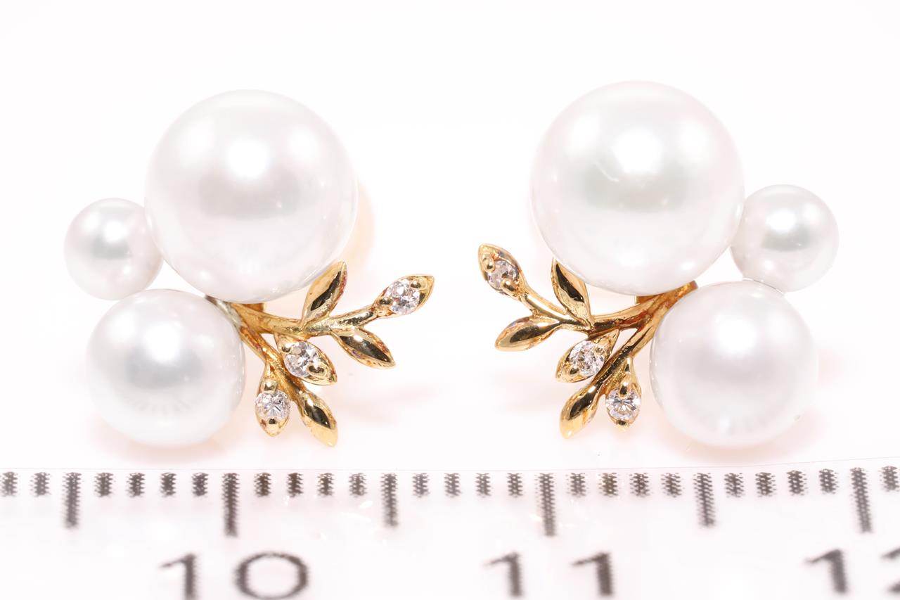 Pearl earrings with 6 cultured pearls of 3.3mm-6.8mm and Diamonds totalling 0.02cts. 18ct yellow gold. Weight: 2.7g. (As new)
